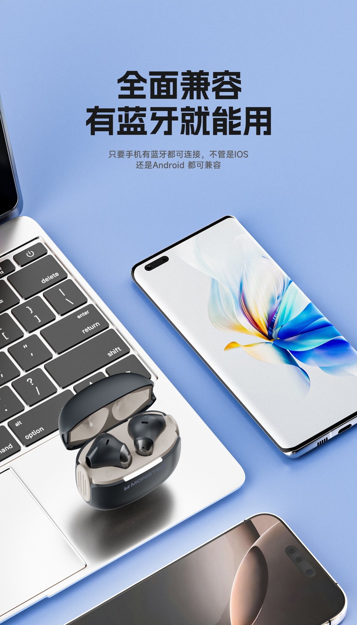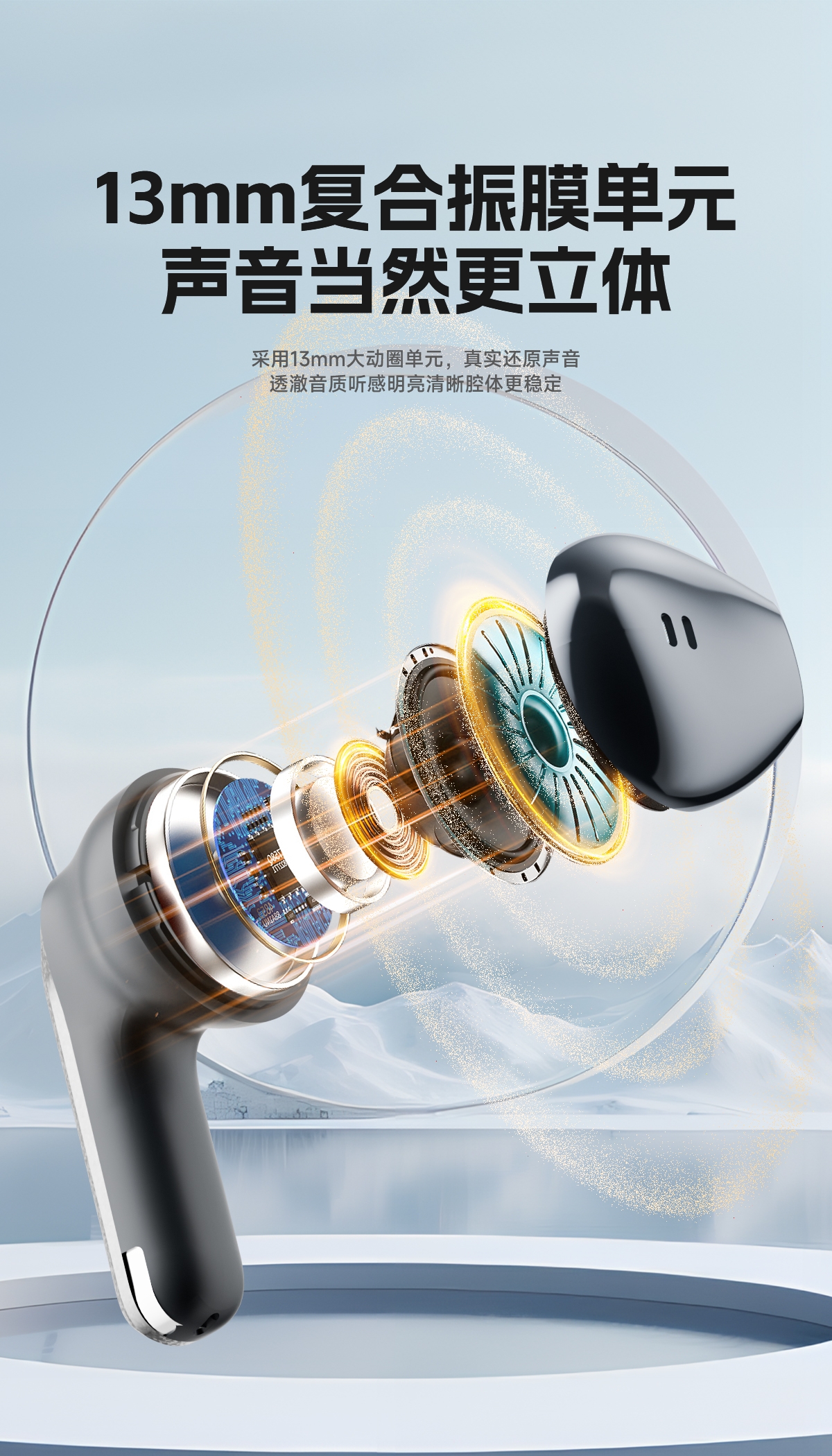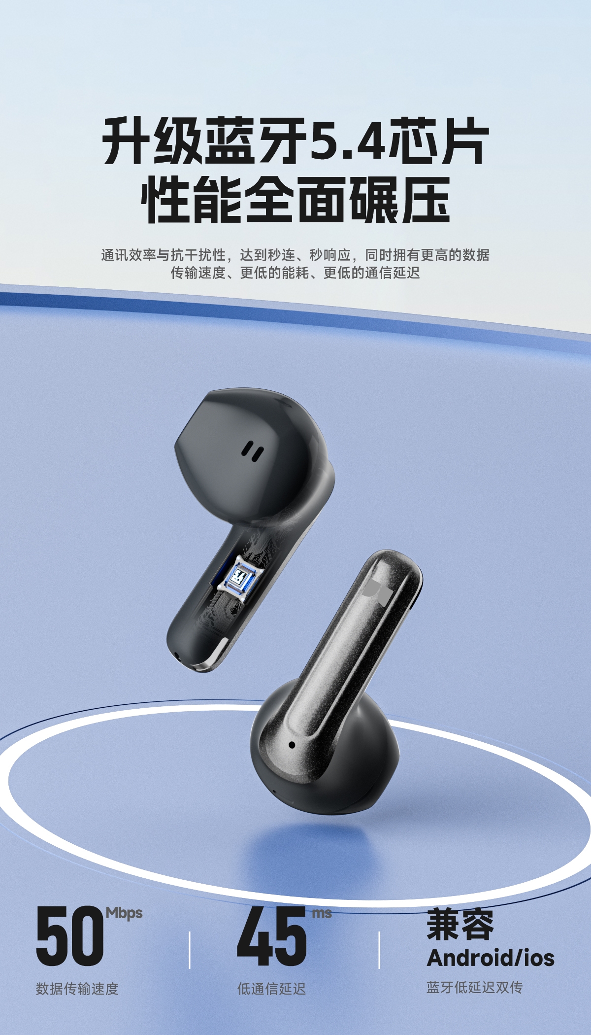 【外观工艺】哑面细纹,局部高光,小巧精致的外观设计;【产品性能】升级5.4的蓝牙版本,取出即连不断连;【通话效果】硅唛+ENC算术,高清通话,大幅消除风