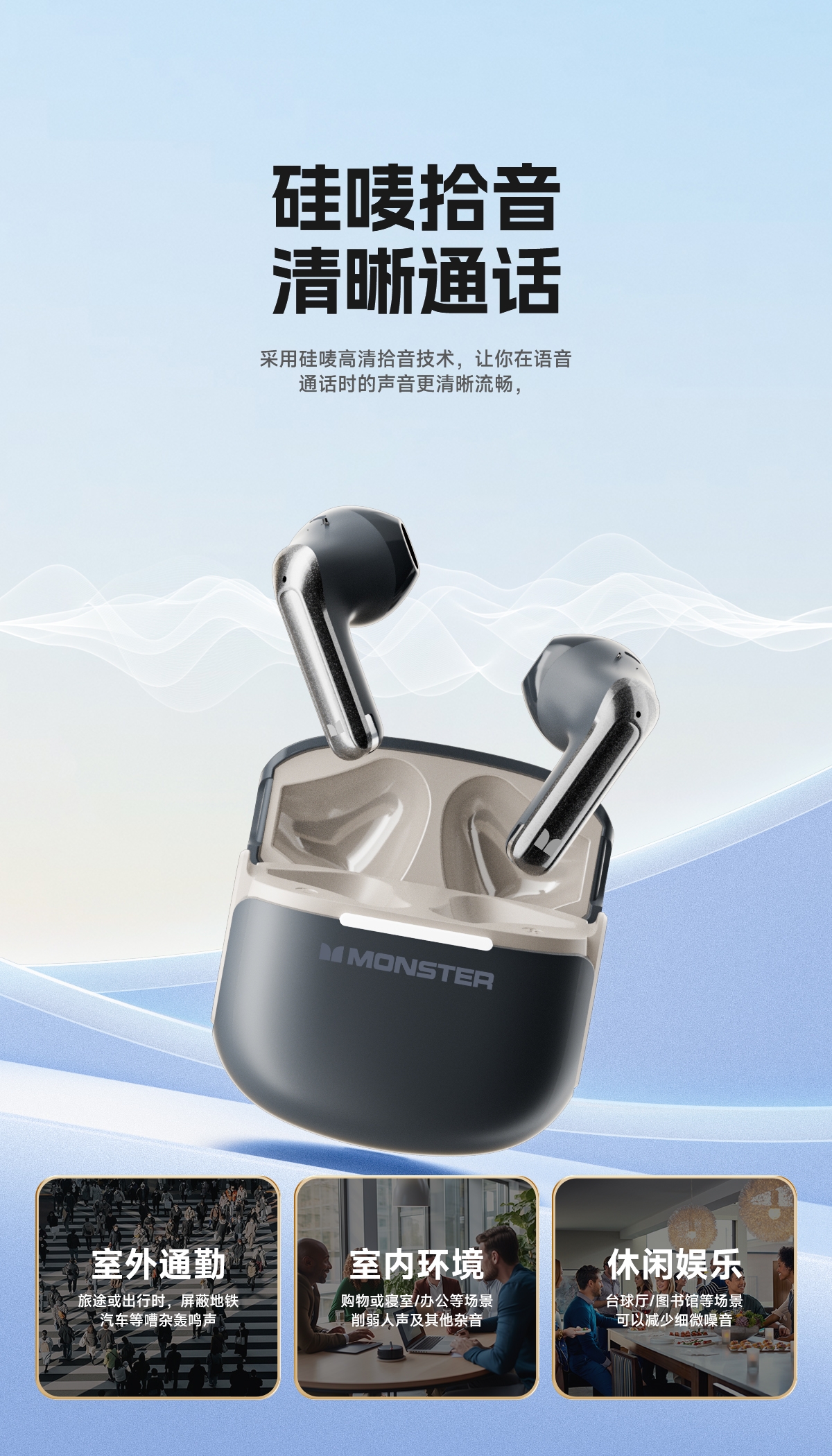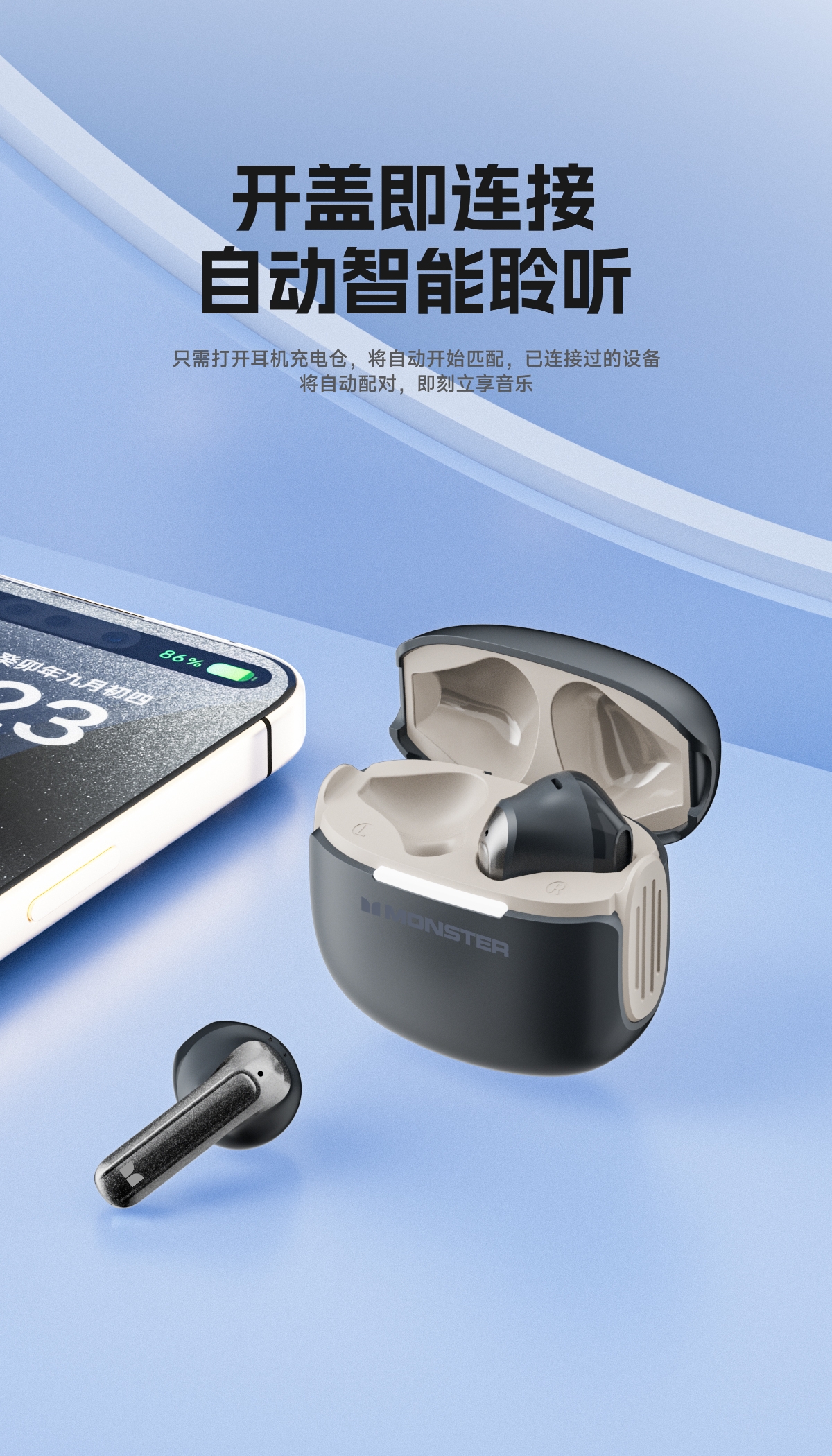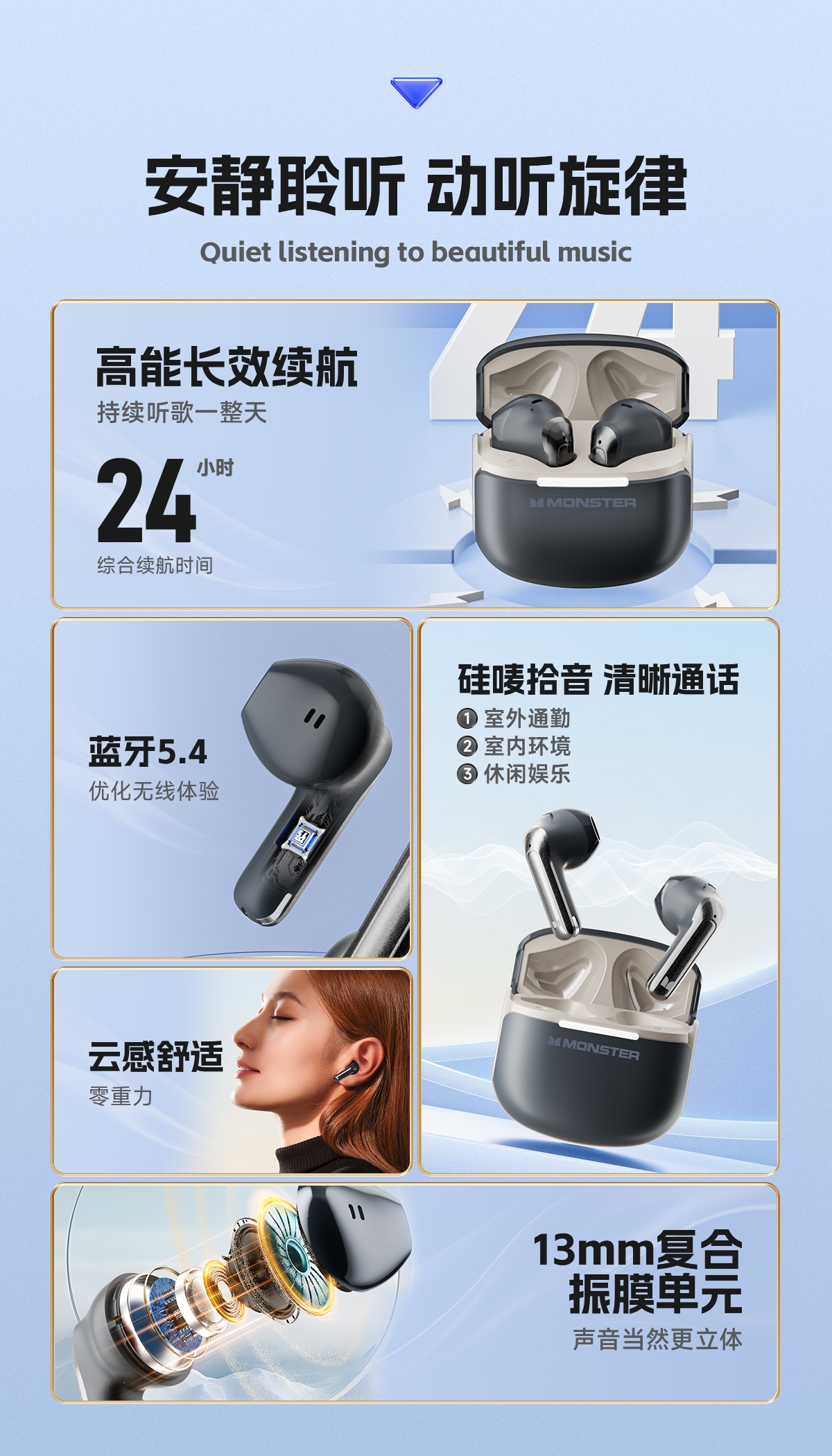 【外观工艺】哑面细纹,局部高光,小巧精致的外观设计;【产品性能】升级5.4的蓝牙版本,取出即连不断连;【通话效果】硅唛+ENC算术,高清通话,大幅消除风