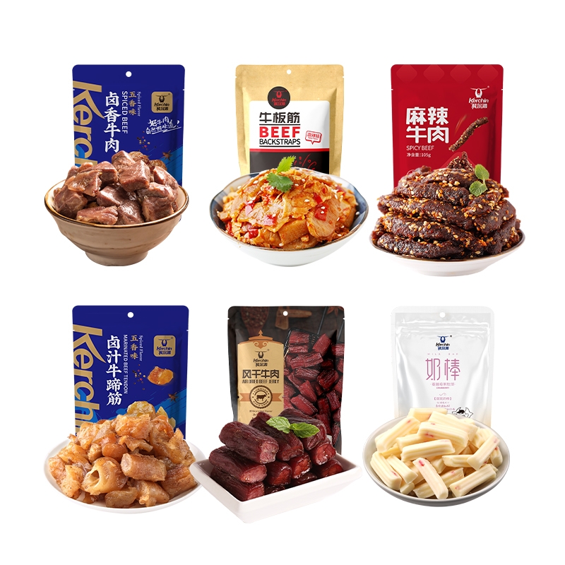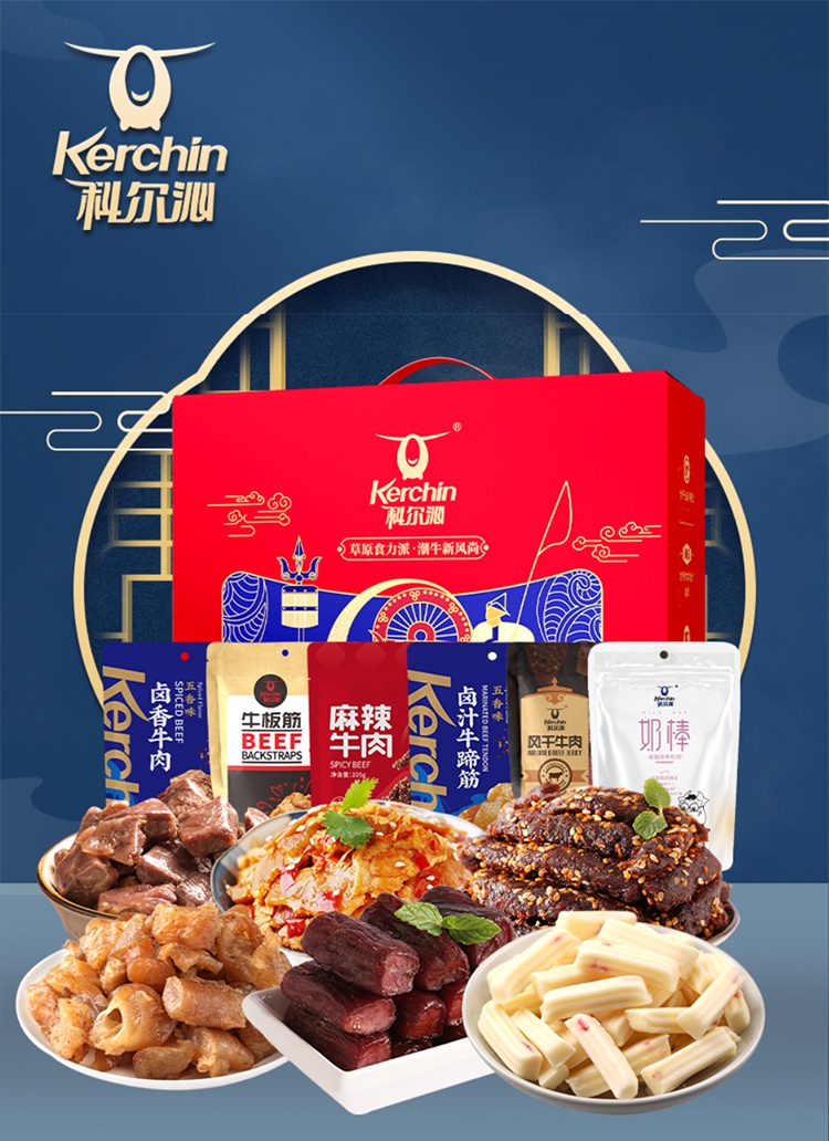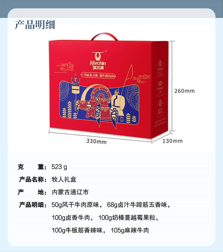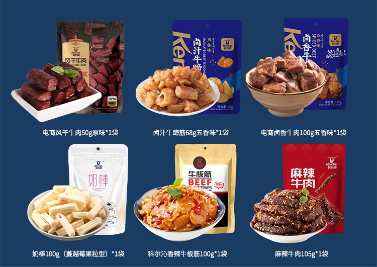 配置清单:科尔沁电商卤香牛肉五香味100g、科尔沁香辣牛板筋100g、科尔沁麻辣牛肉105g、科尔沁卤汁牛蹄筋五香味68g、科尔沁电商风干牛肉原味50g、科尔沁奶棒100g(蔓越莓果粒型)、科尔沁金戈铁马盒子