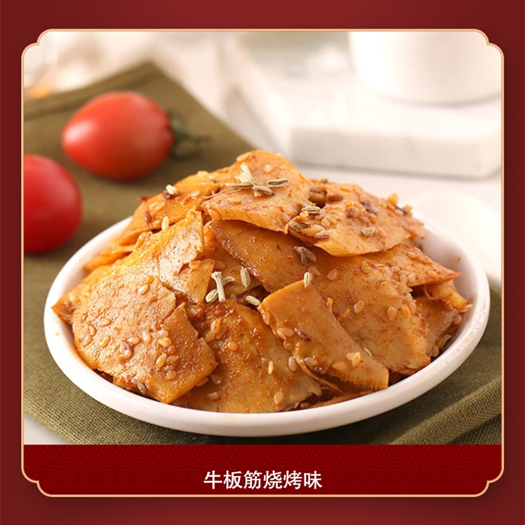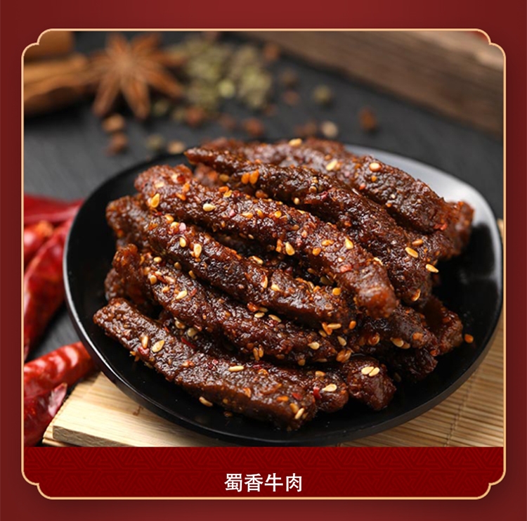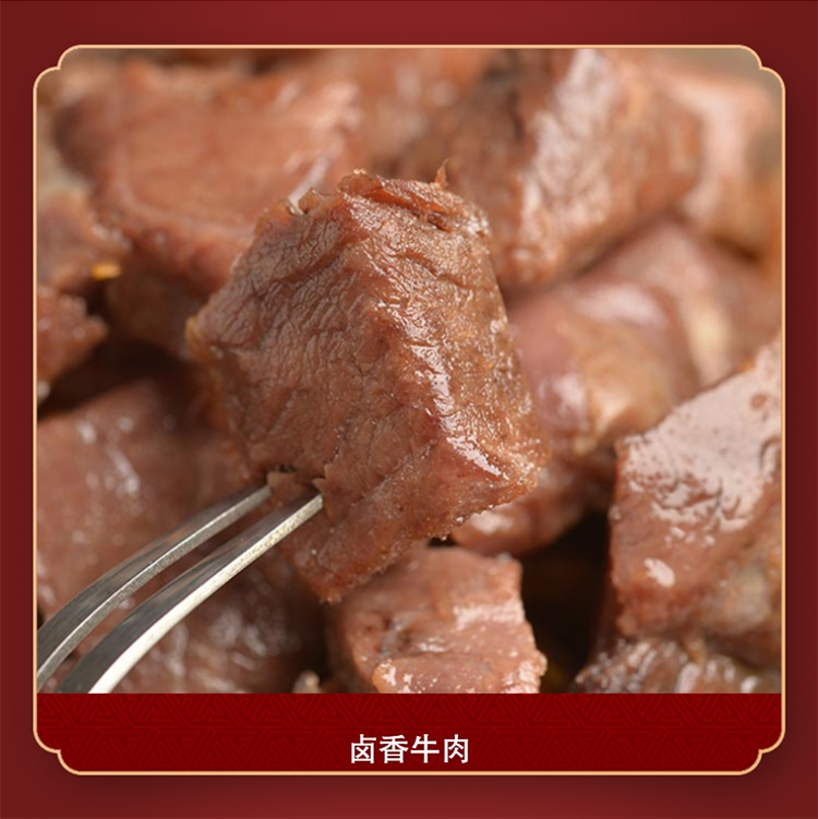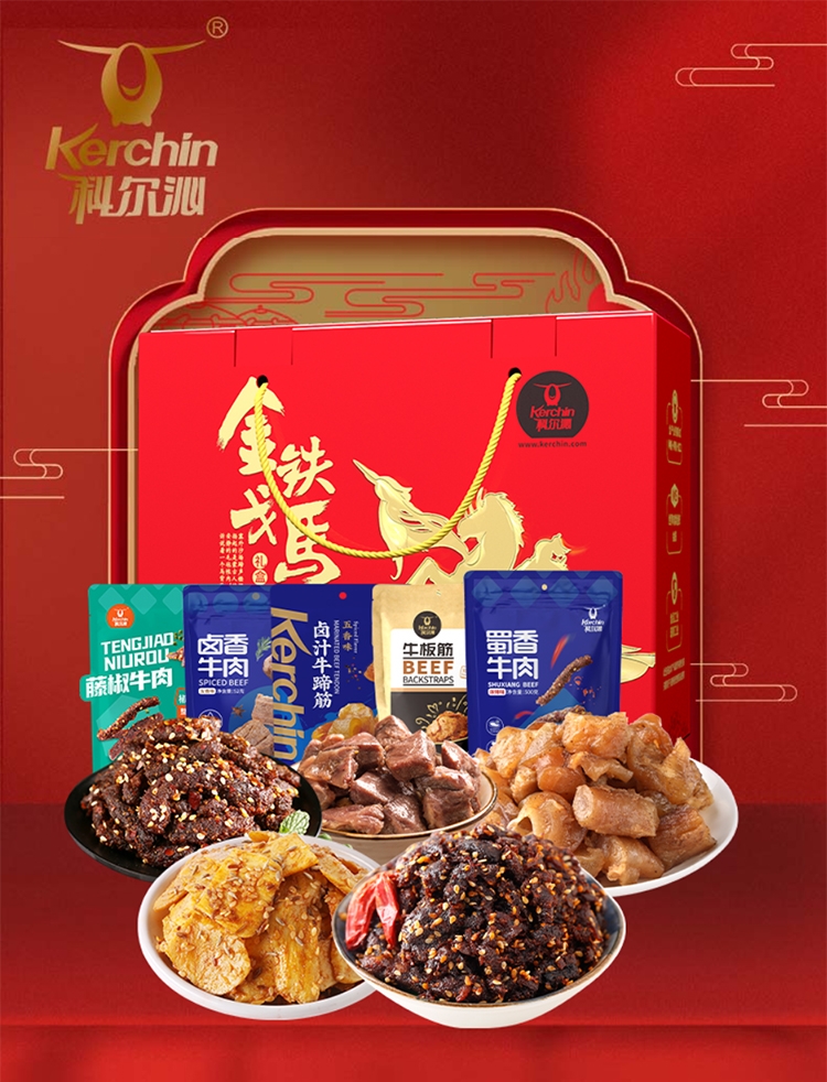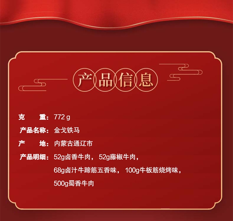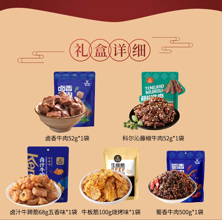 配置清单:科尔沁藤椒牛肉52g 科尔沁卤香牛肉52g 科尔沁卤汁牛蹄筋68g五香味 科尔沁牛板筋烧烤味(新)100g 科尔沁蜀香牛肉500g 科尔沁金戈铁马盒子