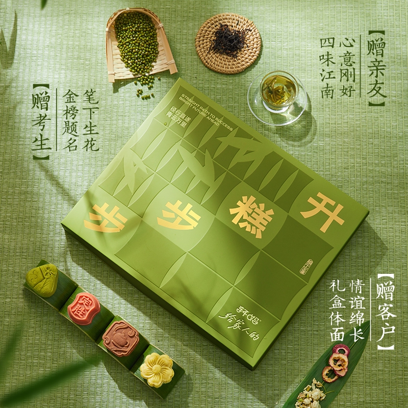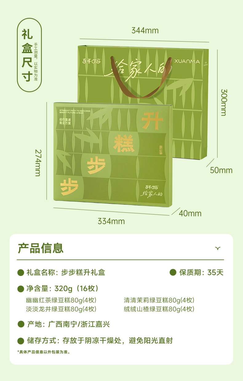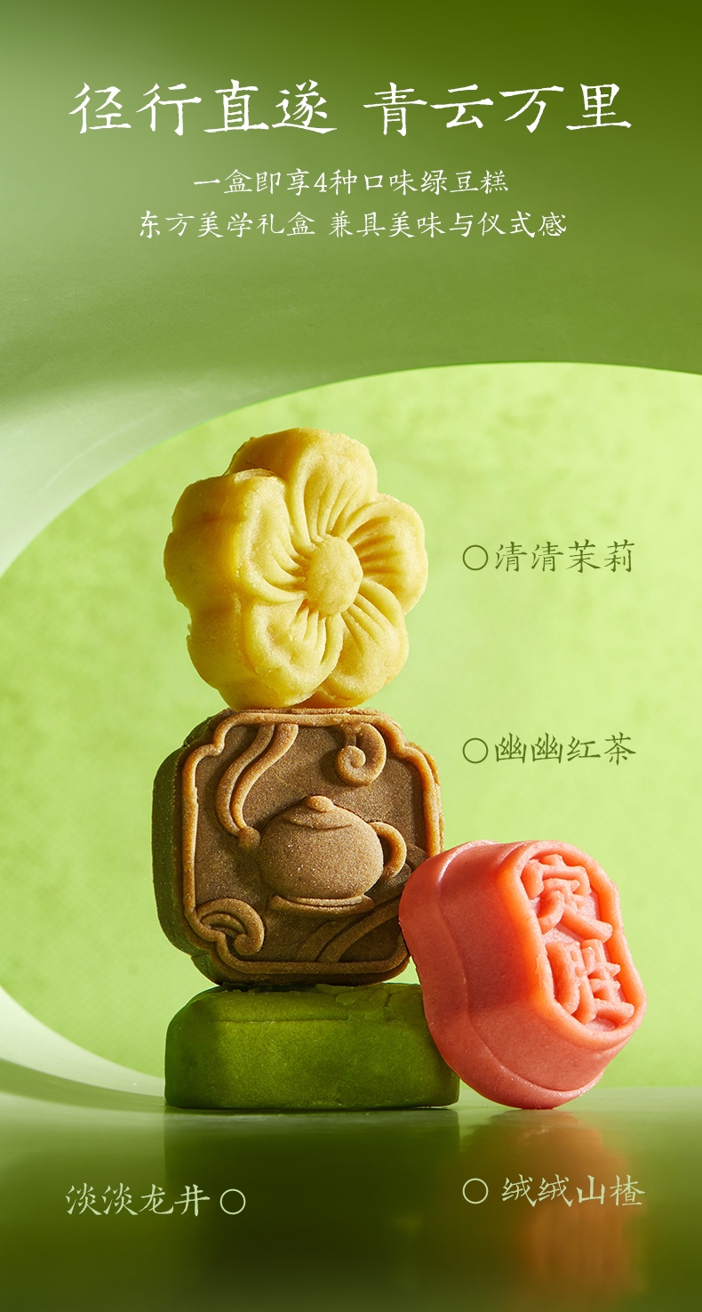 配置清单:幽幽红茶·绿豆糕*4枚*20g, 清清茉莉·绿豆糕4枚*20g, 淡淡龙井·绿豆糕4枚*20g,绒绒山楂·绿豆糕4枚*20g,