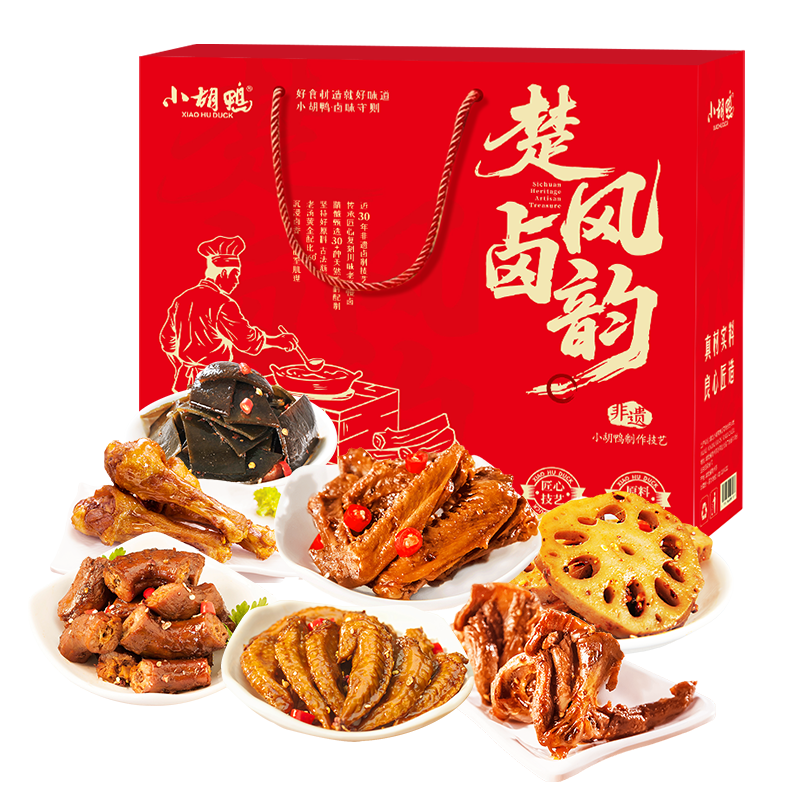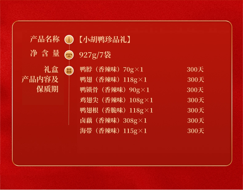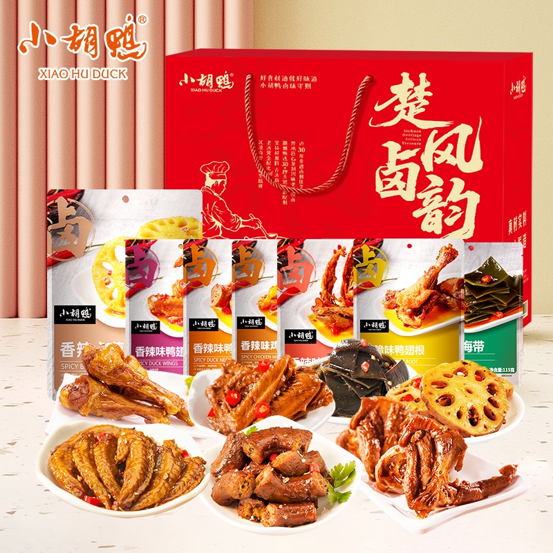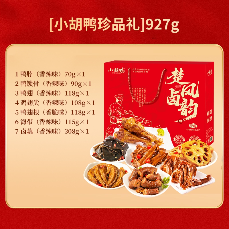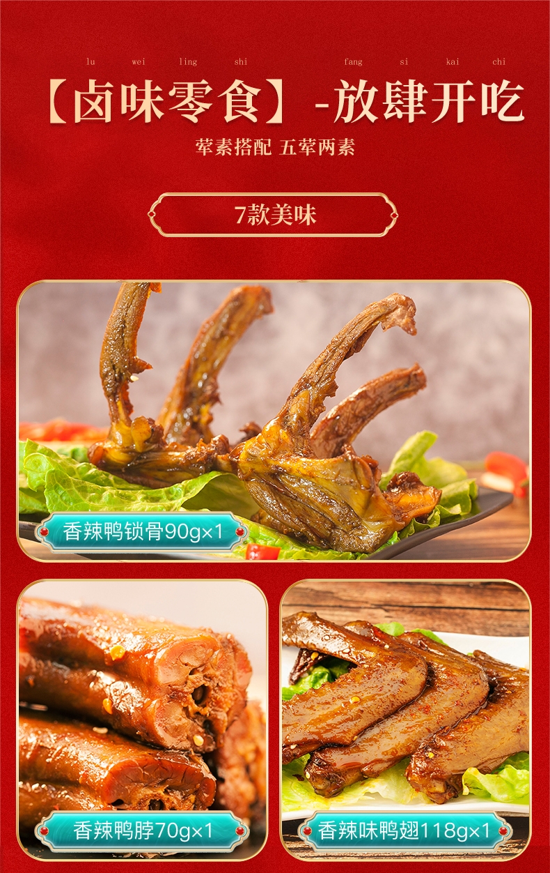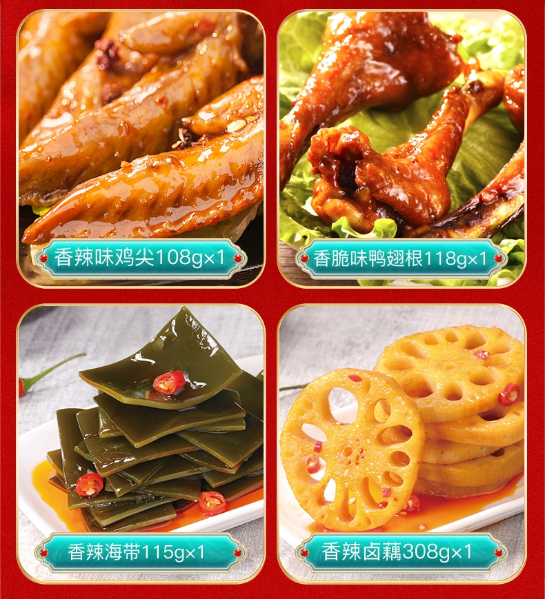 配置清单:70g香辣鸭脖*1 115g 香辣海带*1 118g 香脆鸭翅根*1 108g 香辣鸡翅尖*1 118g 香辣鸭翅*1 308g 香辣卤藕*1 90g 香辣鸭锁骨*1