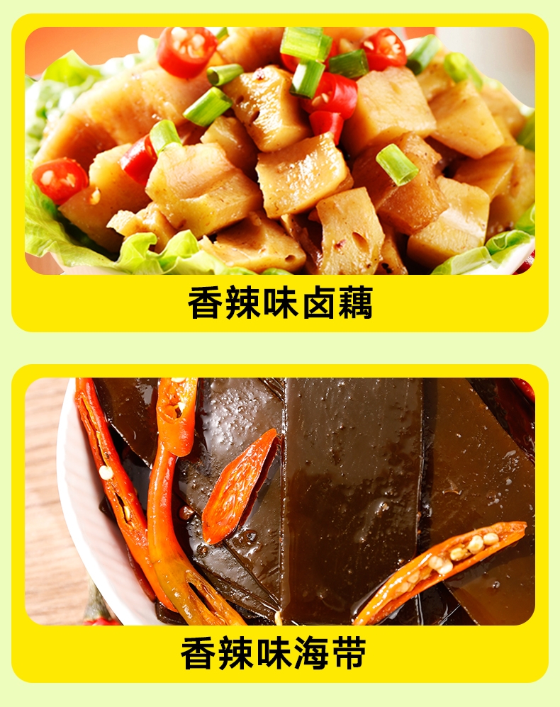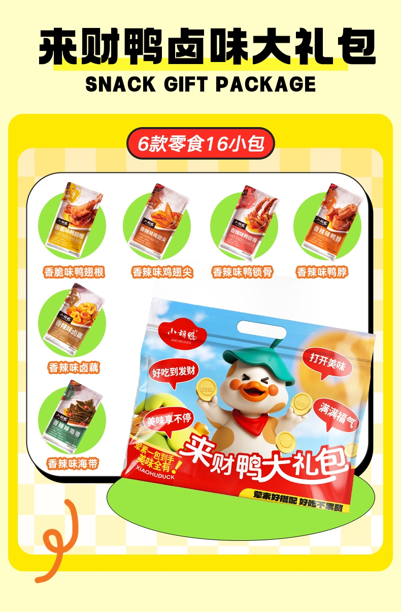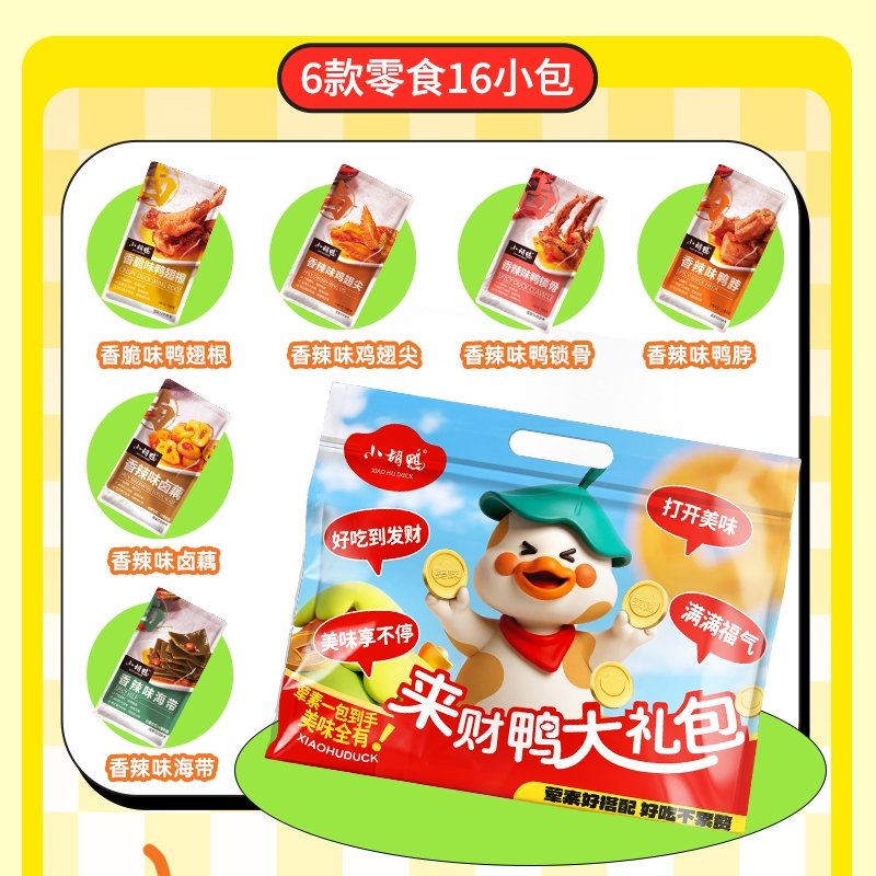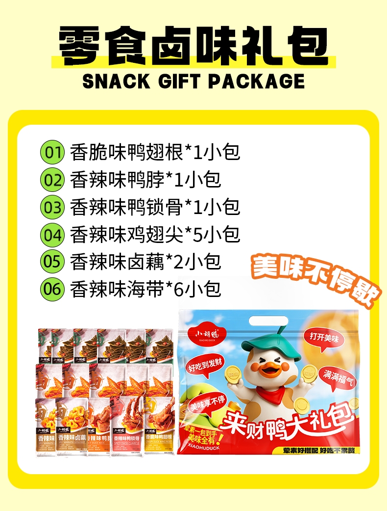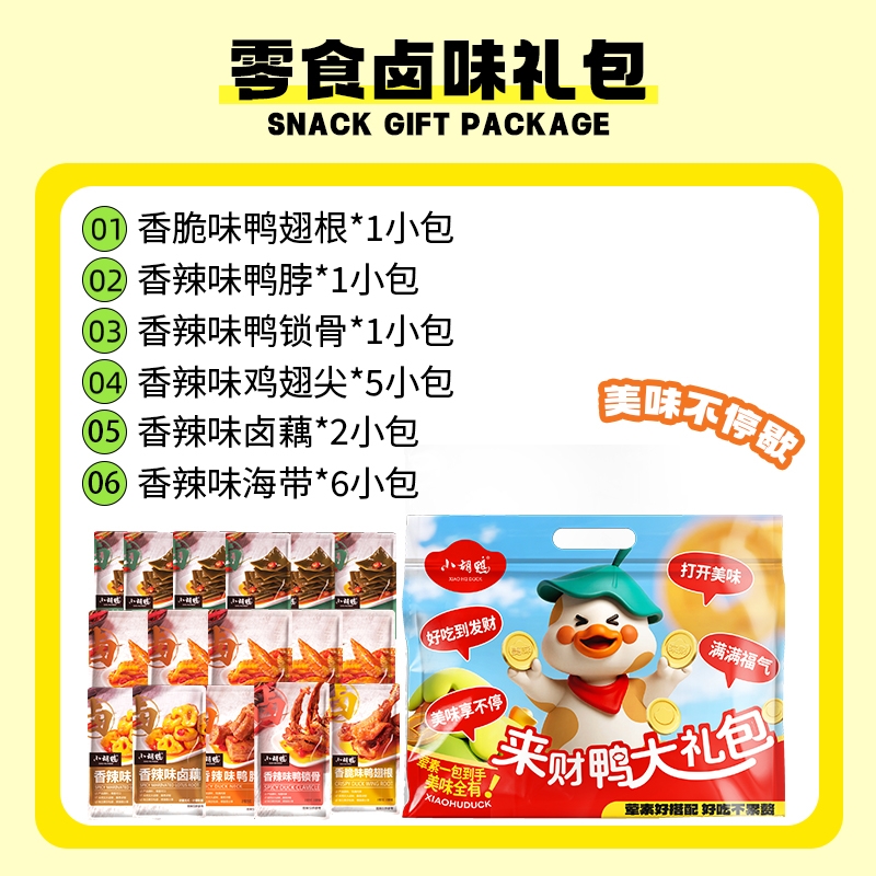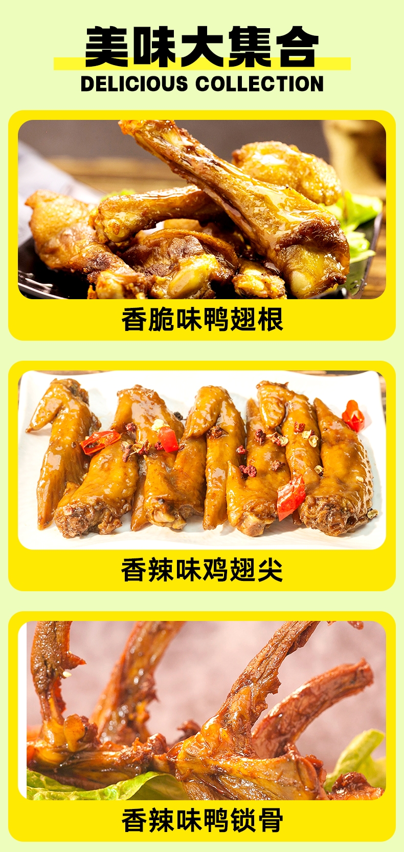 配置清单:香辣味鸭脖*1 香辣味鸭锁骨*1 香辣味鸡翅尖*5 香脆鸭翅根*1 香辣味海带*6 香辣味卤藕*2