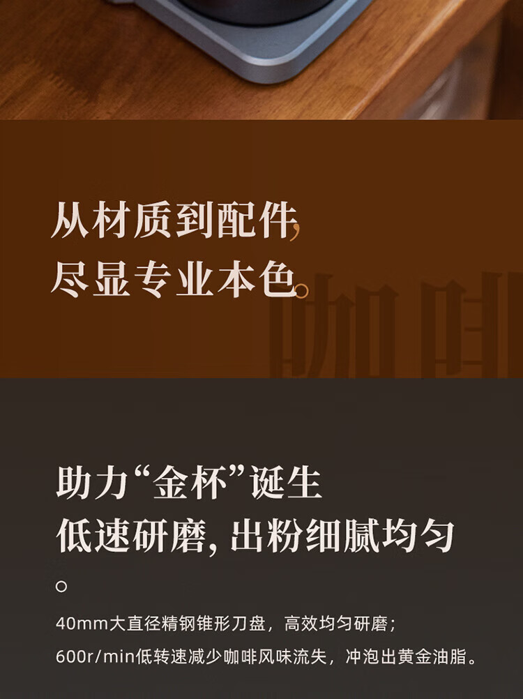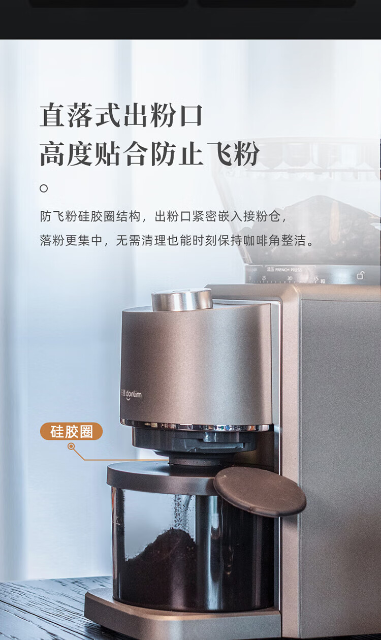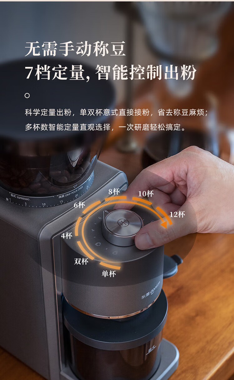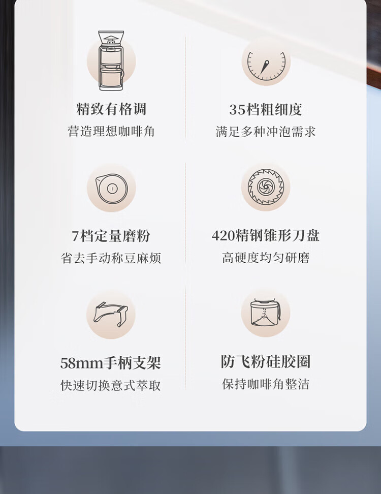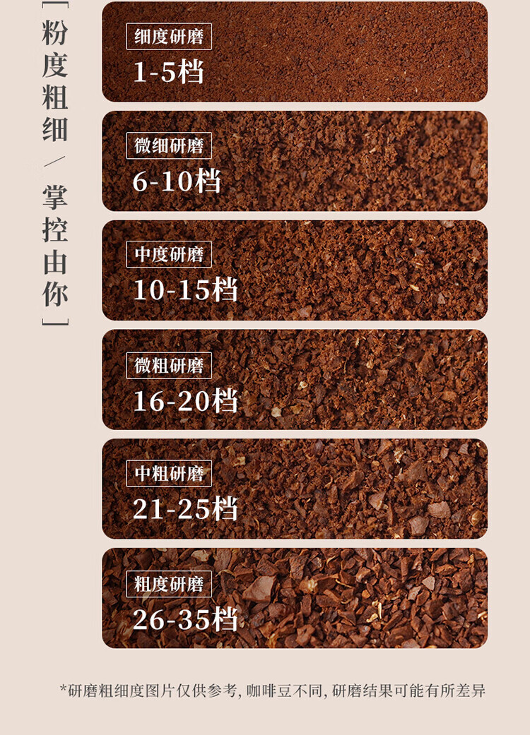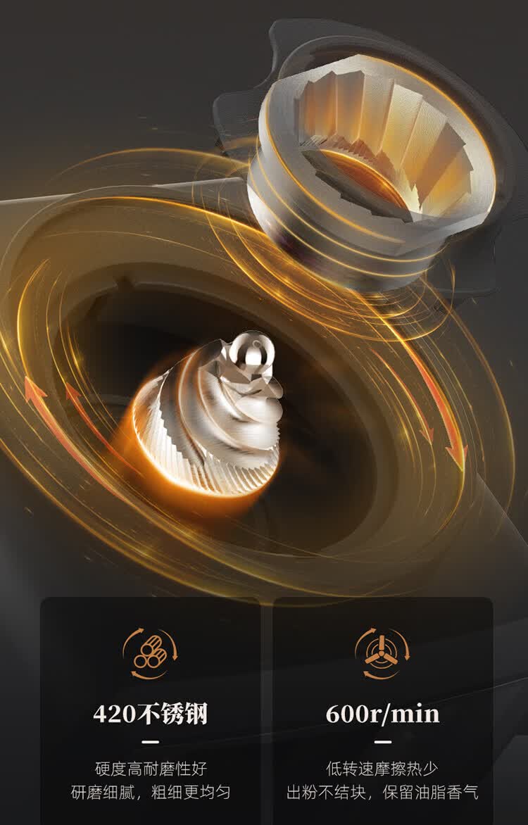 7档定量磨粉,智能控制出粉;420精钢锥形刀盘,低转速不结块;35档粗细度可调,针对不同需求场景