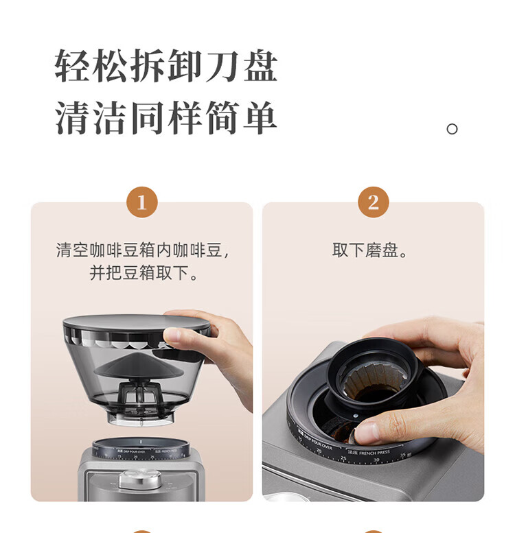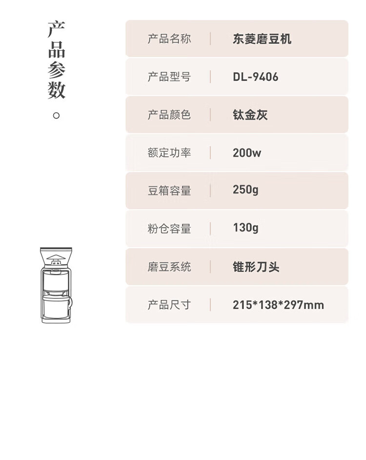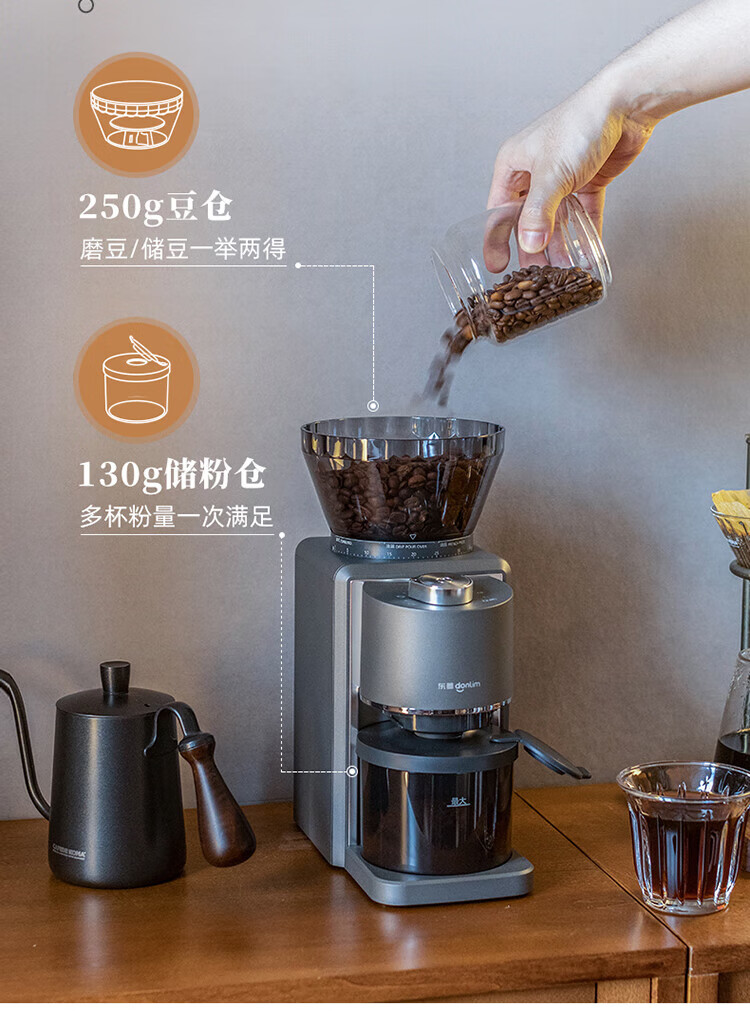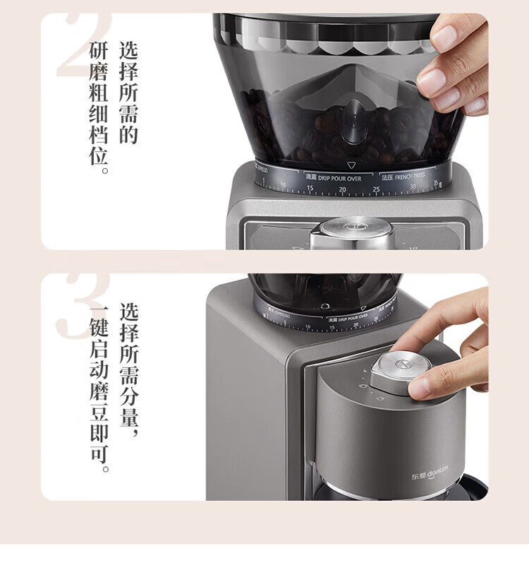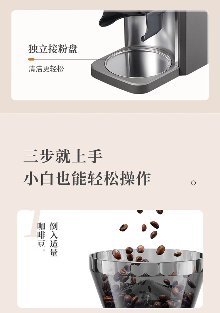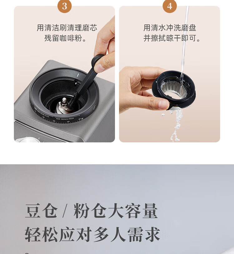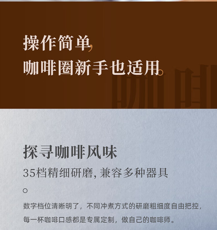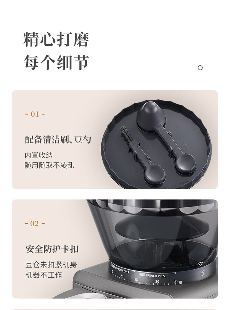 7档定量磨粉,智能控制出粉;420精钢锥形刀盘,低转速不结块;35档粗细度可调,针对不同需求场景