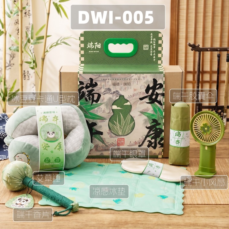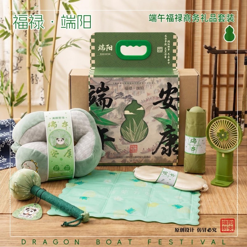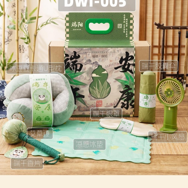 组合:便携三挡小风扇*1、冰豆豆卡通U形枕*1、端午香片(白茶香)*1、散热凉感冰垫35.5*3.5.5CM、眼罩*1、艾草养生锤*1、胶囊防晒伞*1