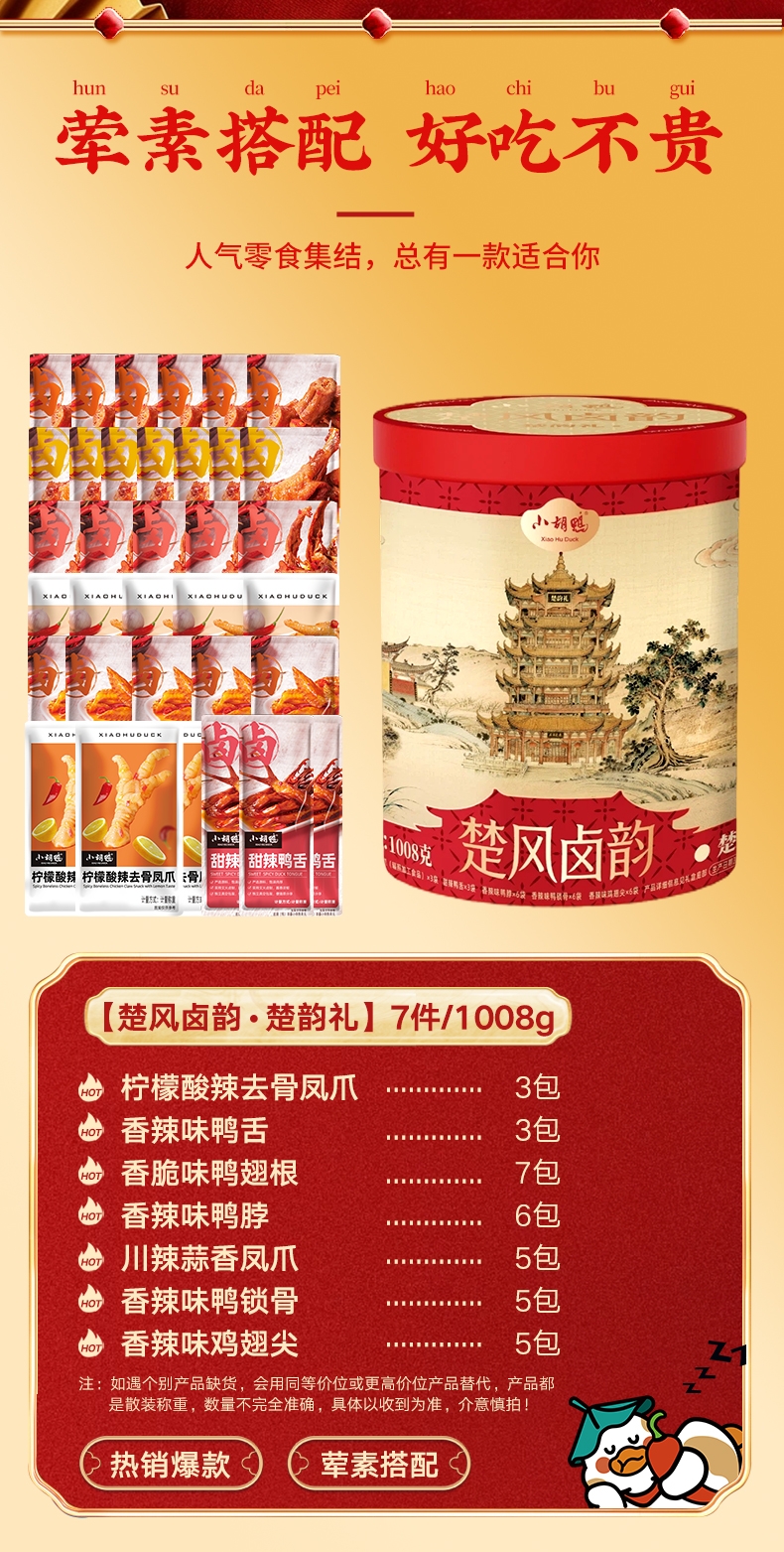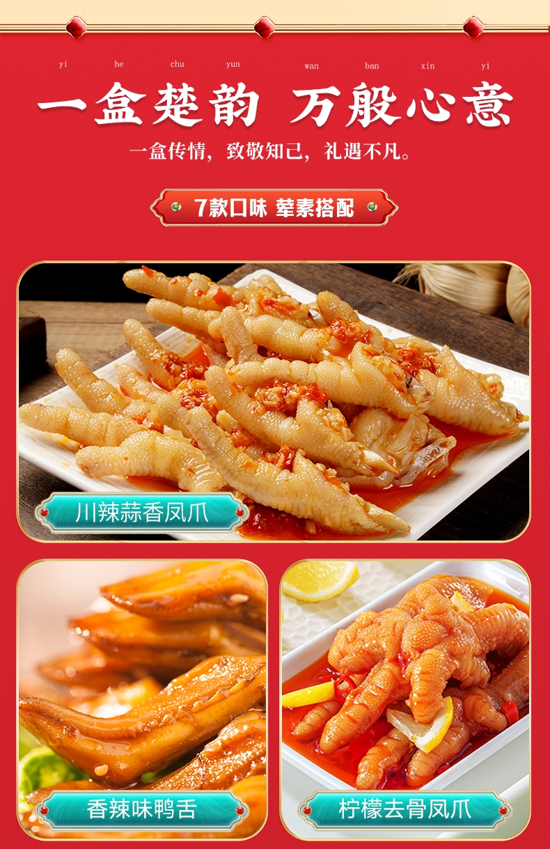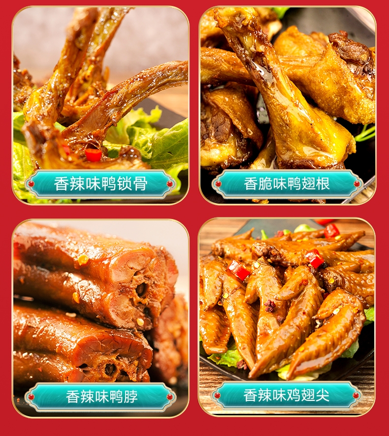 配置清单:香辣味鸭脖*6 香辣味鸭锁骨*5 香辣味鸡翅尖*5 香脆鸭翅根*7 川辣蒜香凤爪*5 柠檬酸辣去骨凤爪*3 甜辣鸭舌*3