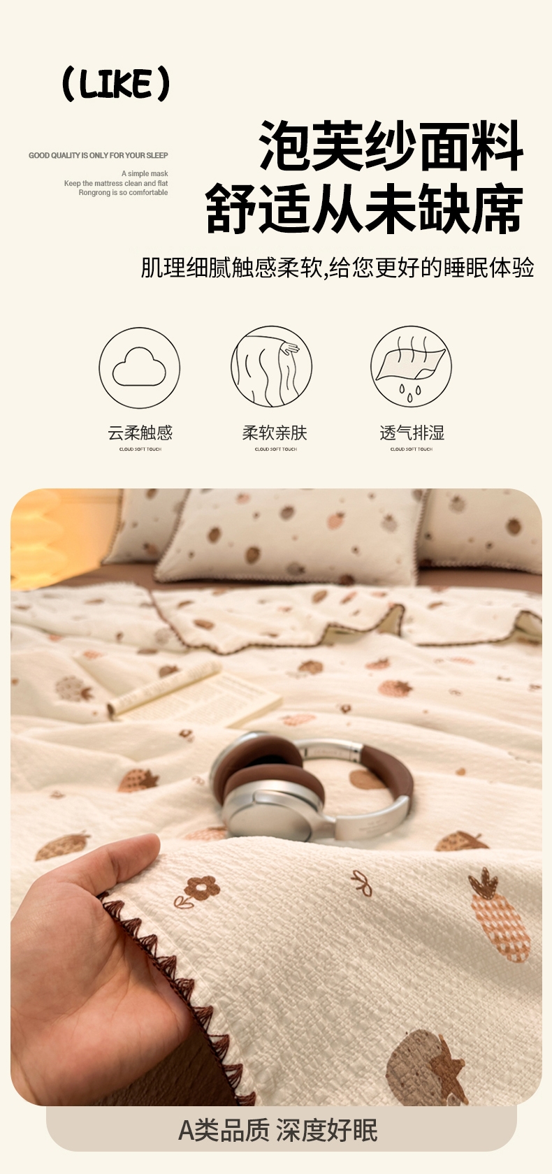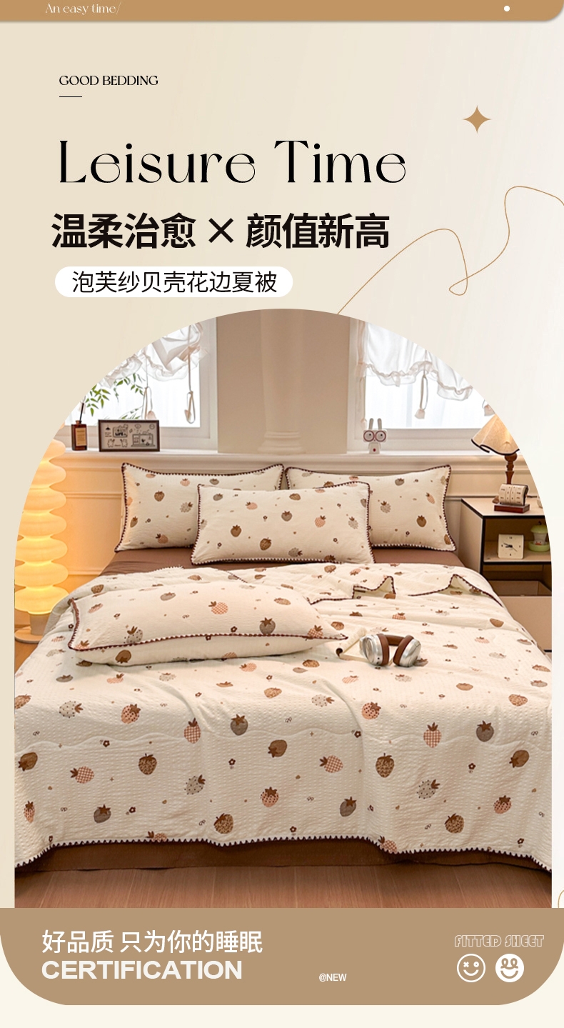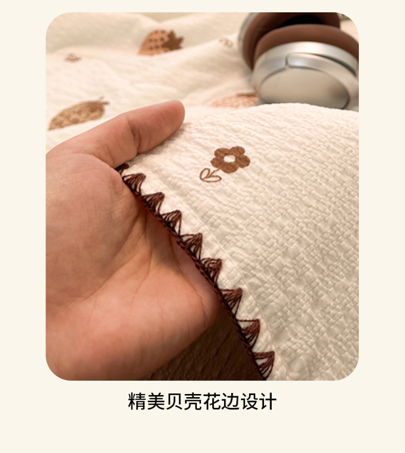 臻选超柔泡芙纱面料,亲肤柔软;整张抗菌纤维填充;蓬松柔软,轻薄不压身;贝壳花边设计,时尚且潮流,做工细致,美观大方