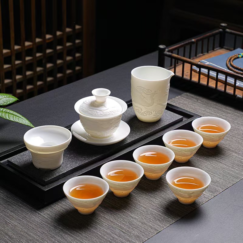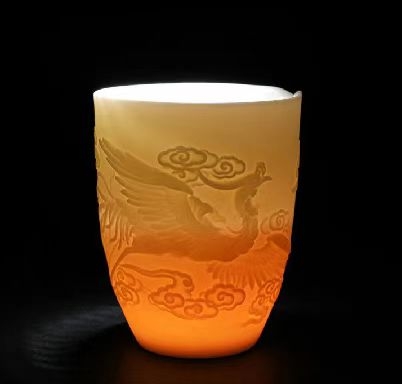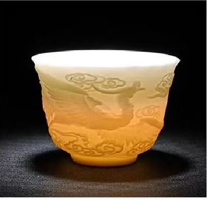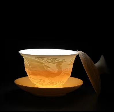 手工浮雕凤纹茶具,栩栩如生。高档羊脂玉瓷;瓷质细腻温润,触感舒适。似凝脂,如美玉;在阳光照射下,呈半透明羊油状,洁白滋润,故称羊脂玉
