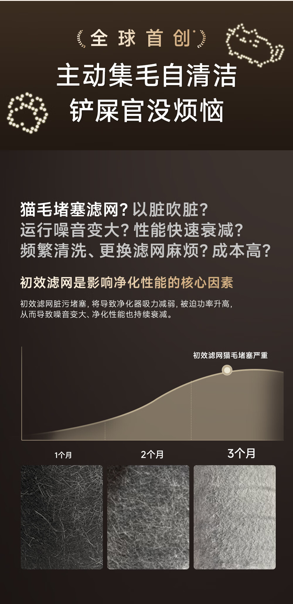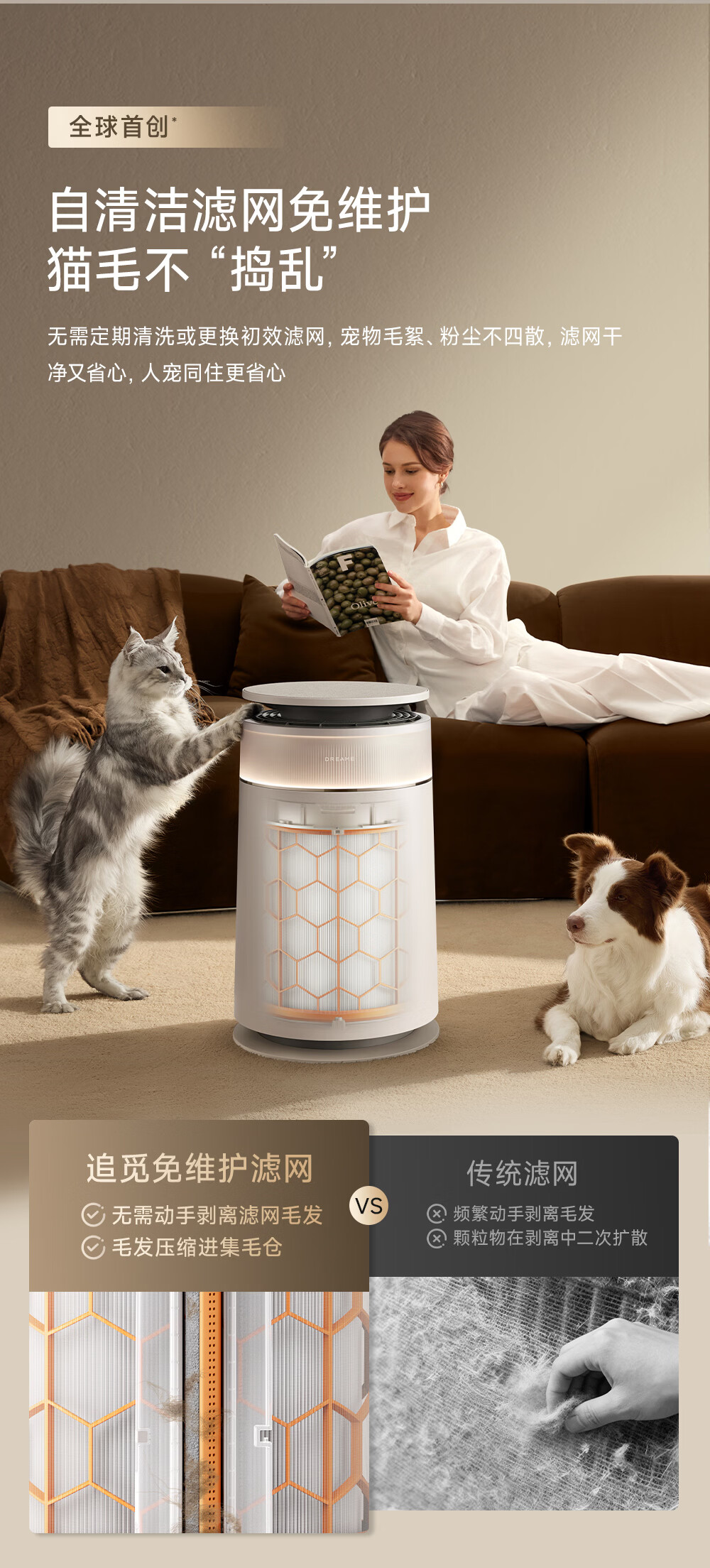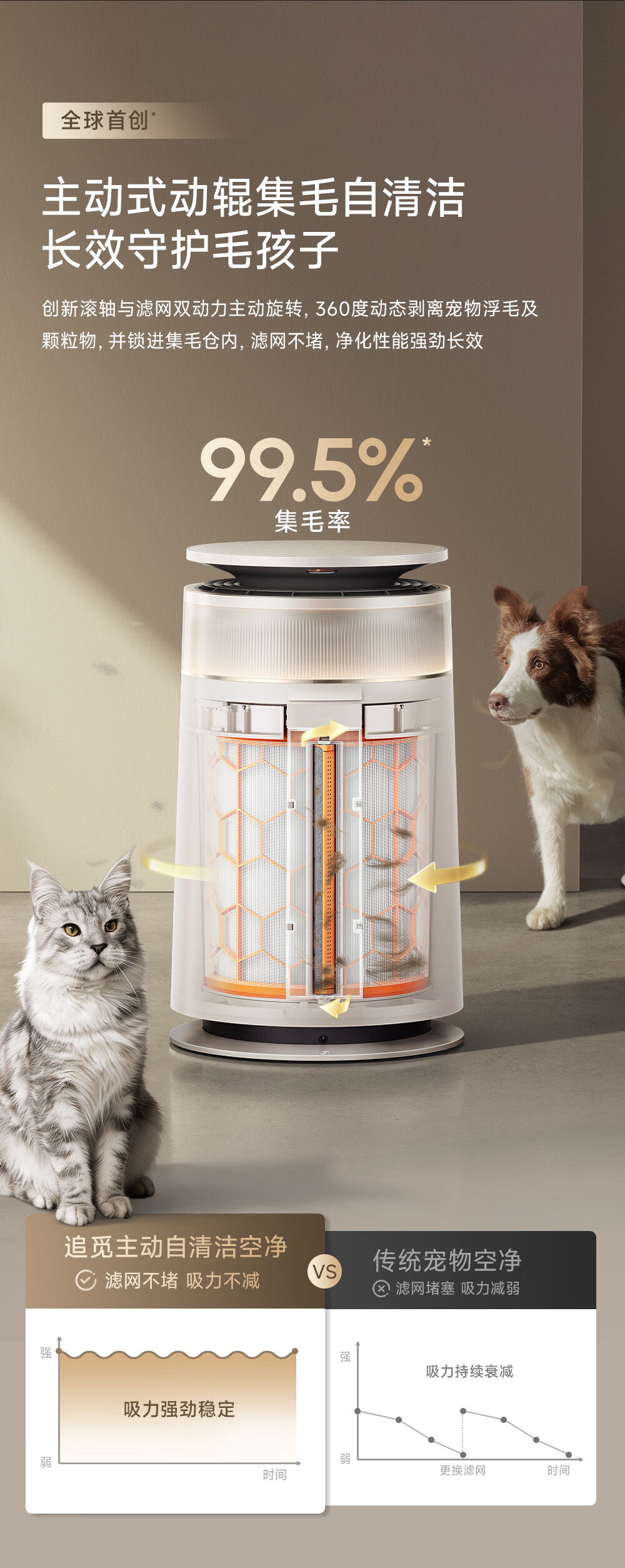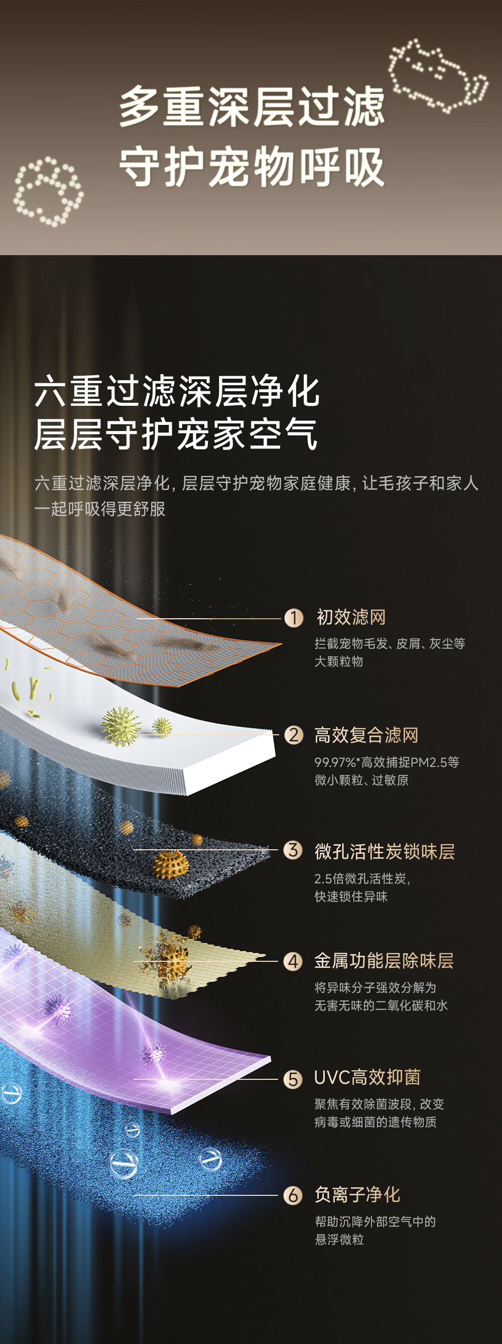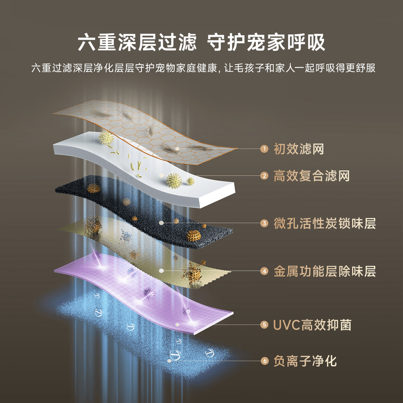 主动式动辊集毛自清洁长效守护毛孩子;免维护滤网0耗材猫毛不“捣乱”;六重过滤深层净化层层守护宠家空气