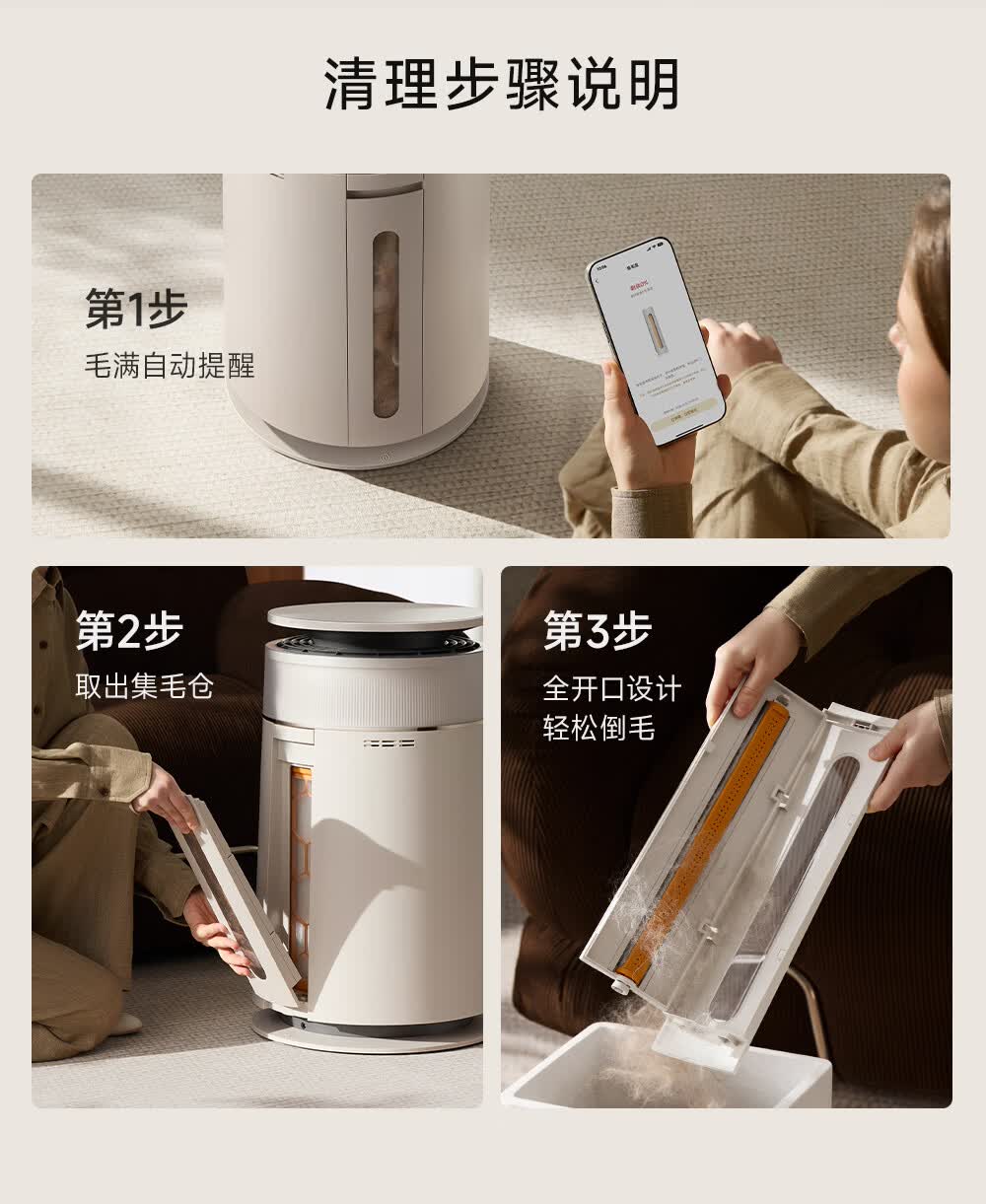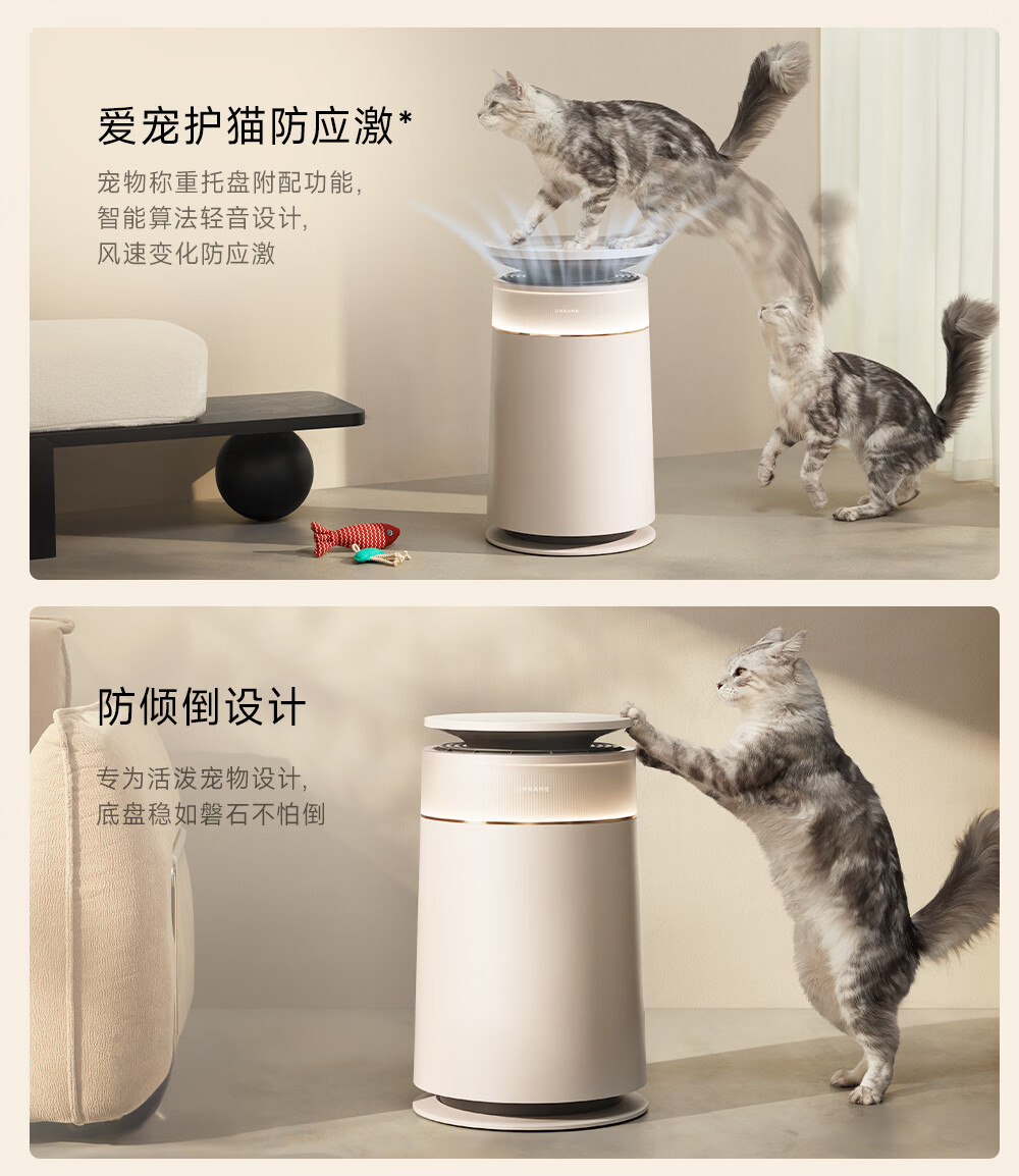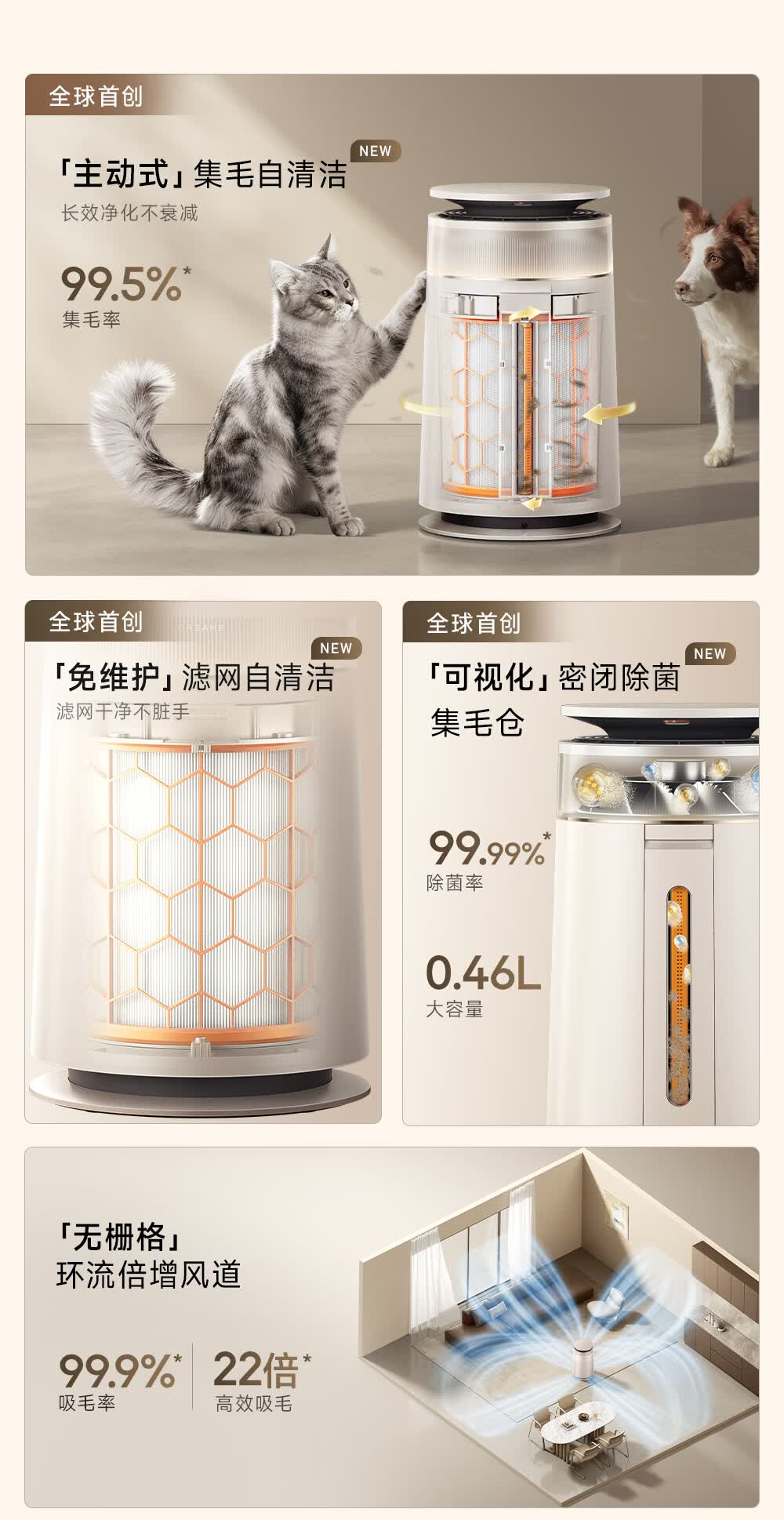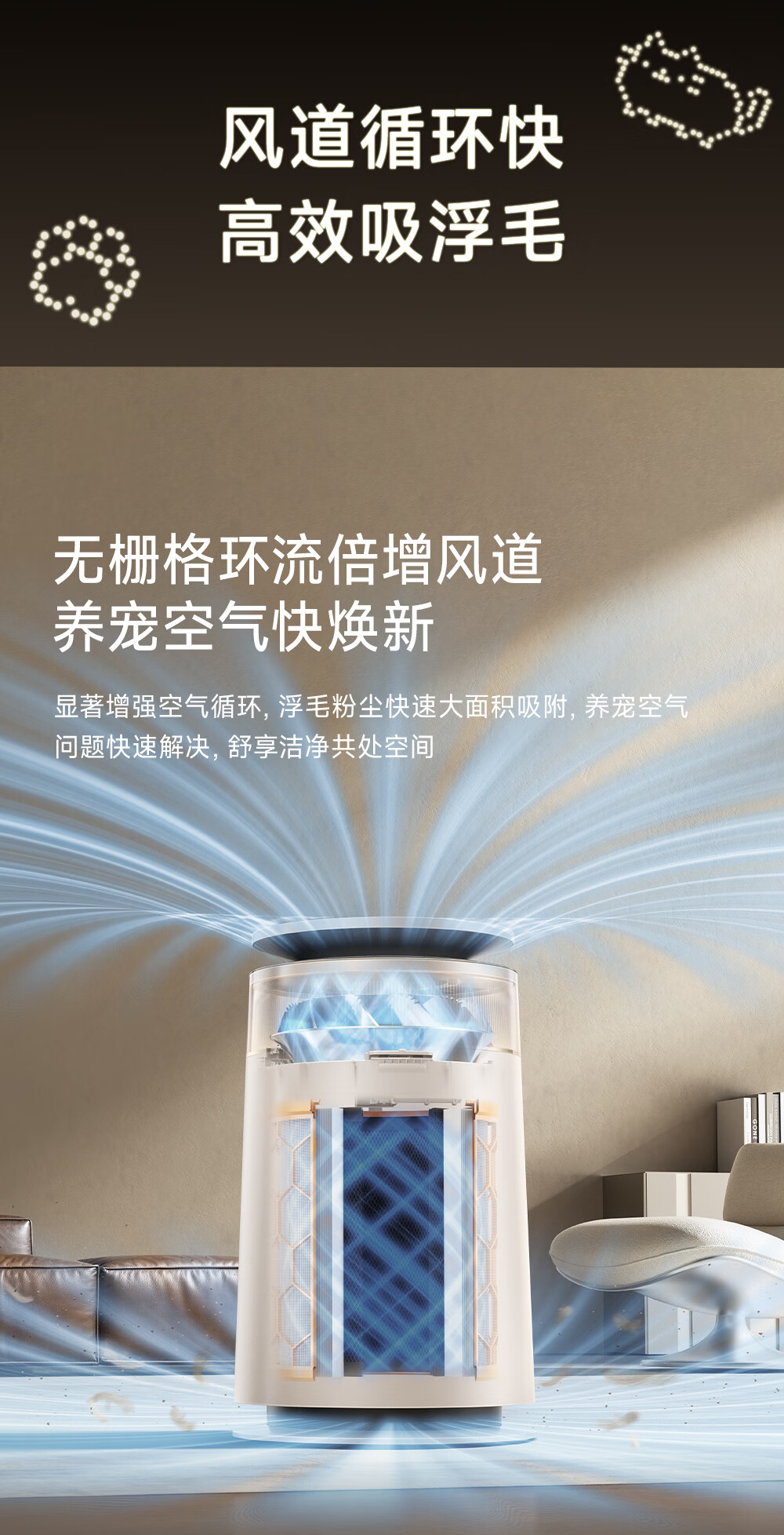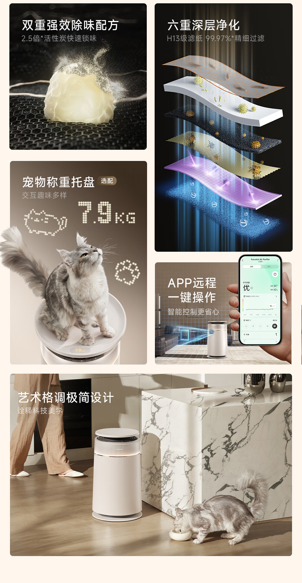 主动式动辊集毛自清洁长效守护毛孩子;免维护滤网0耗材猫毛不“捣乱”;六重过滤深层净化层层守护宠家空气