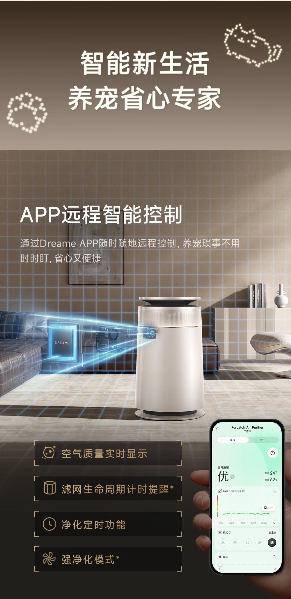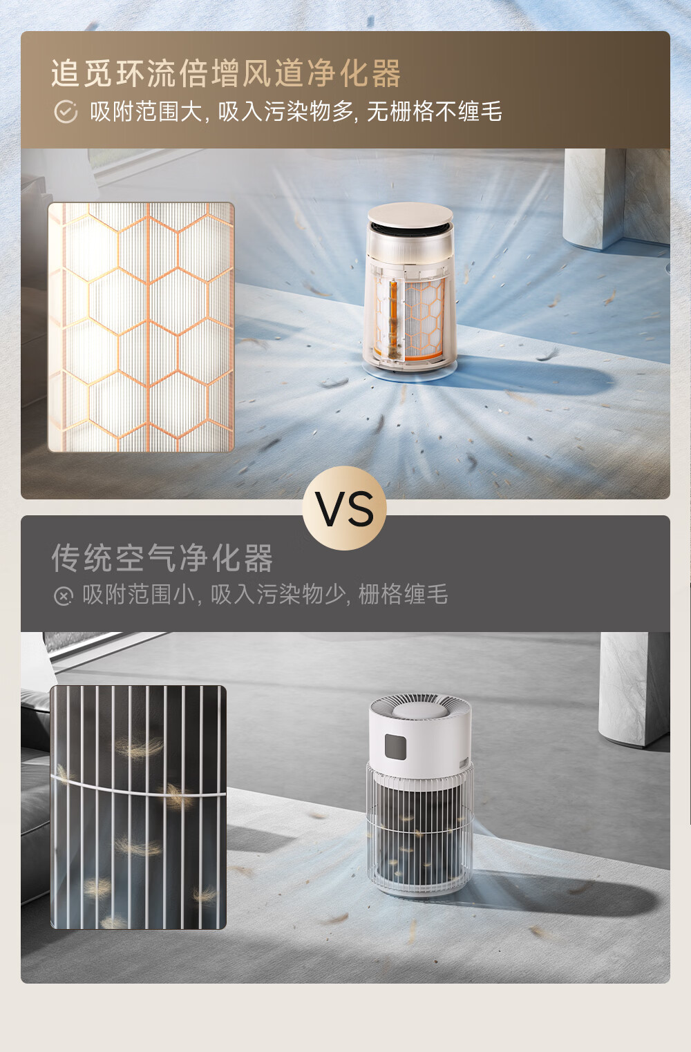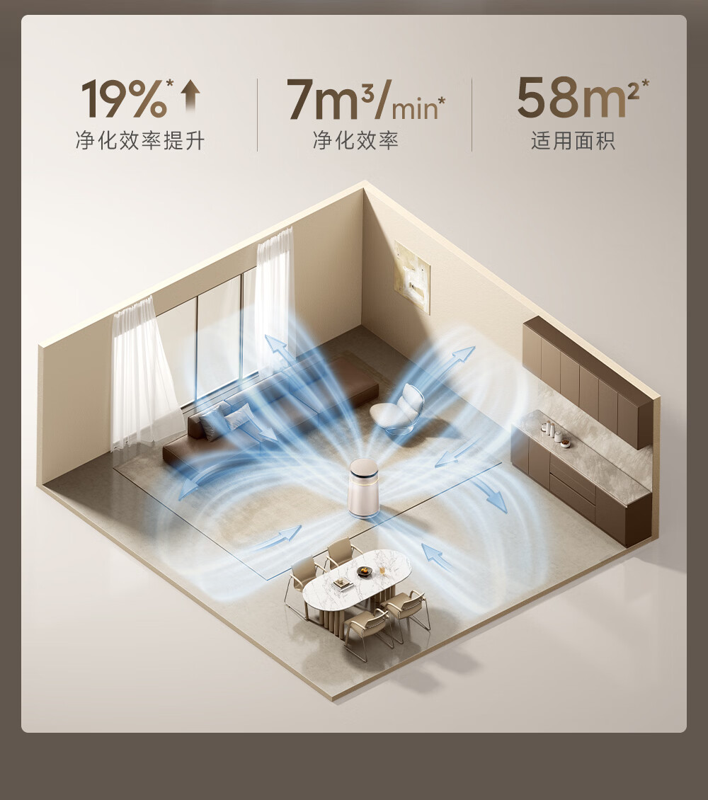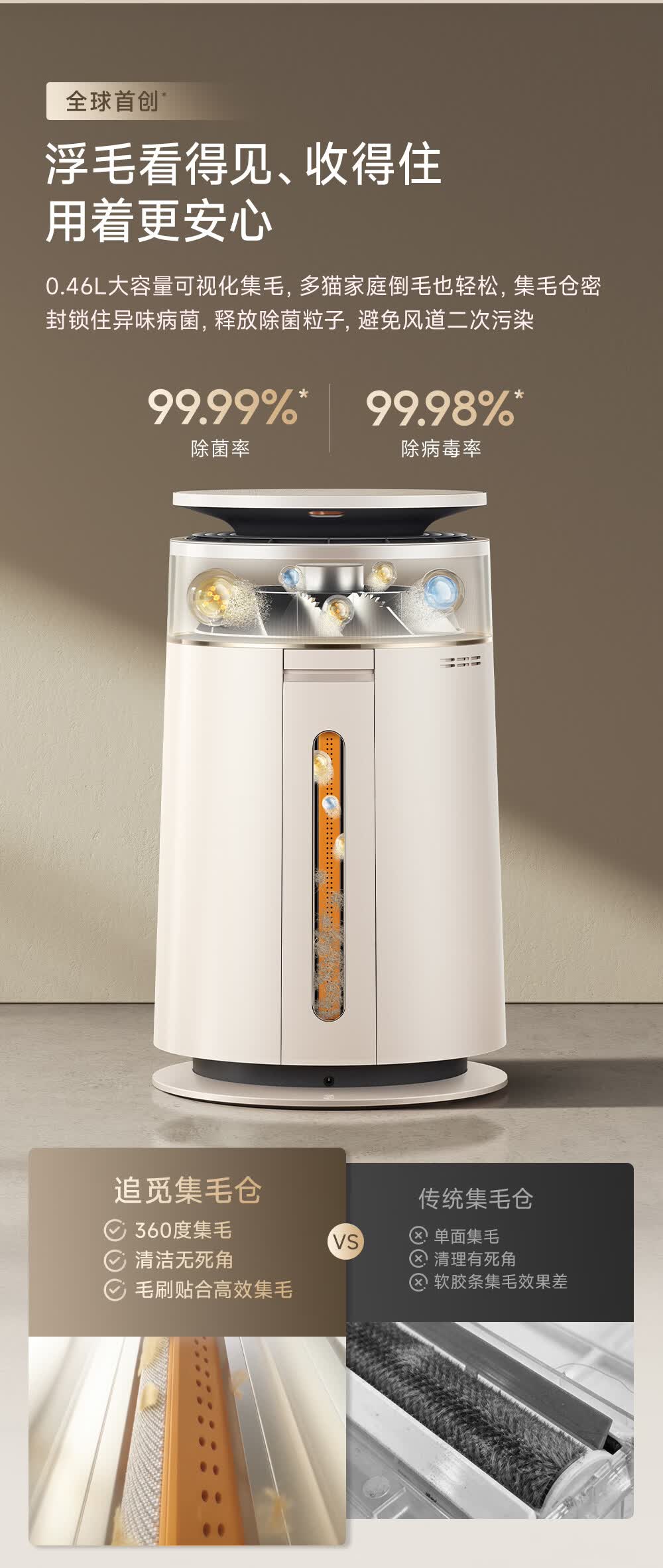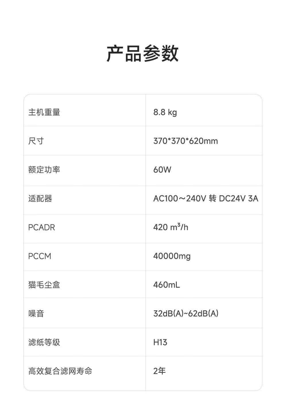 主动式动辊集毛自清洁长效守护毛孩子;免维护滤网0耗材猫毛不“捣乱”;六重过滤深层净化层层守护宠家空气