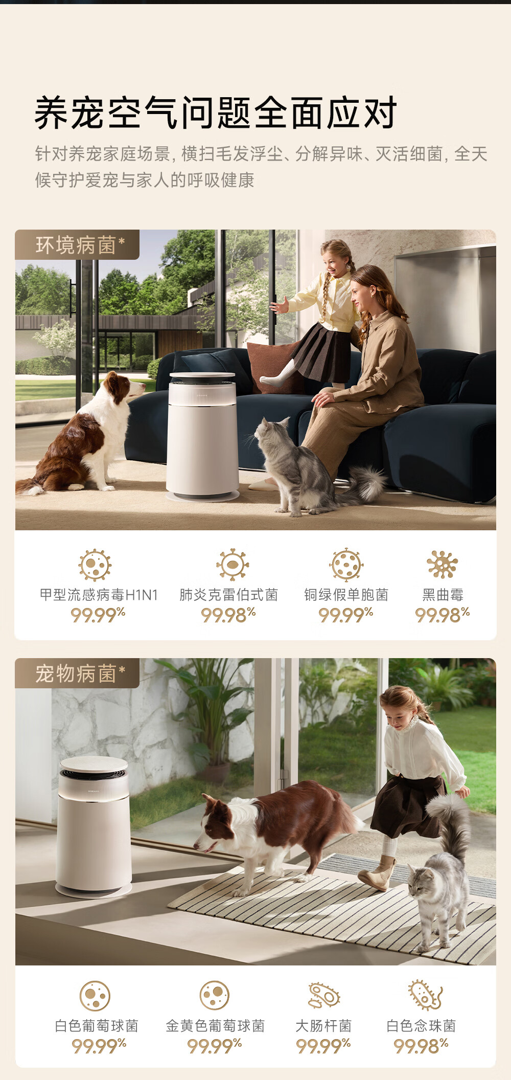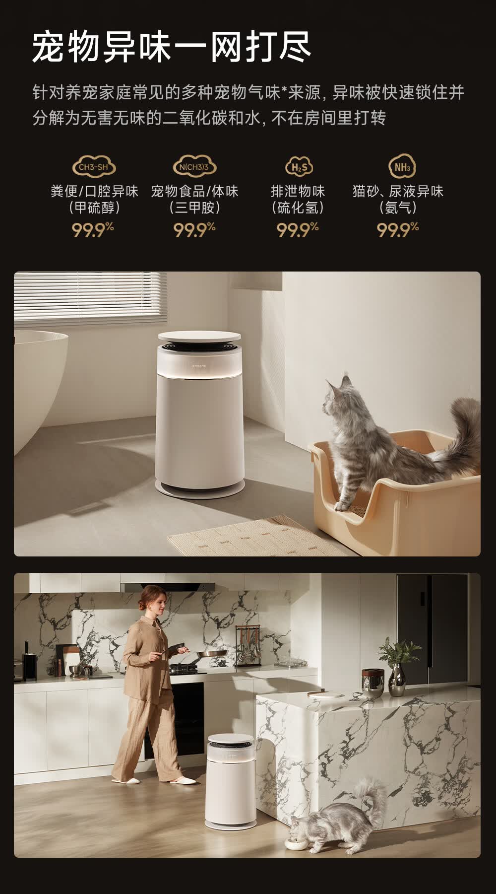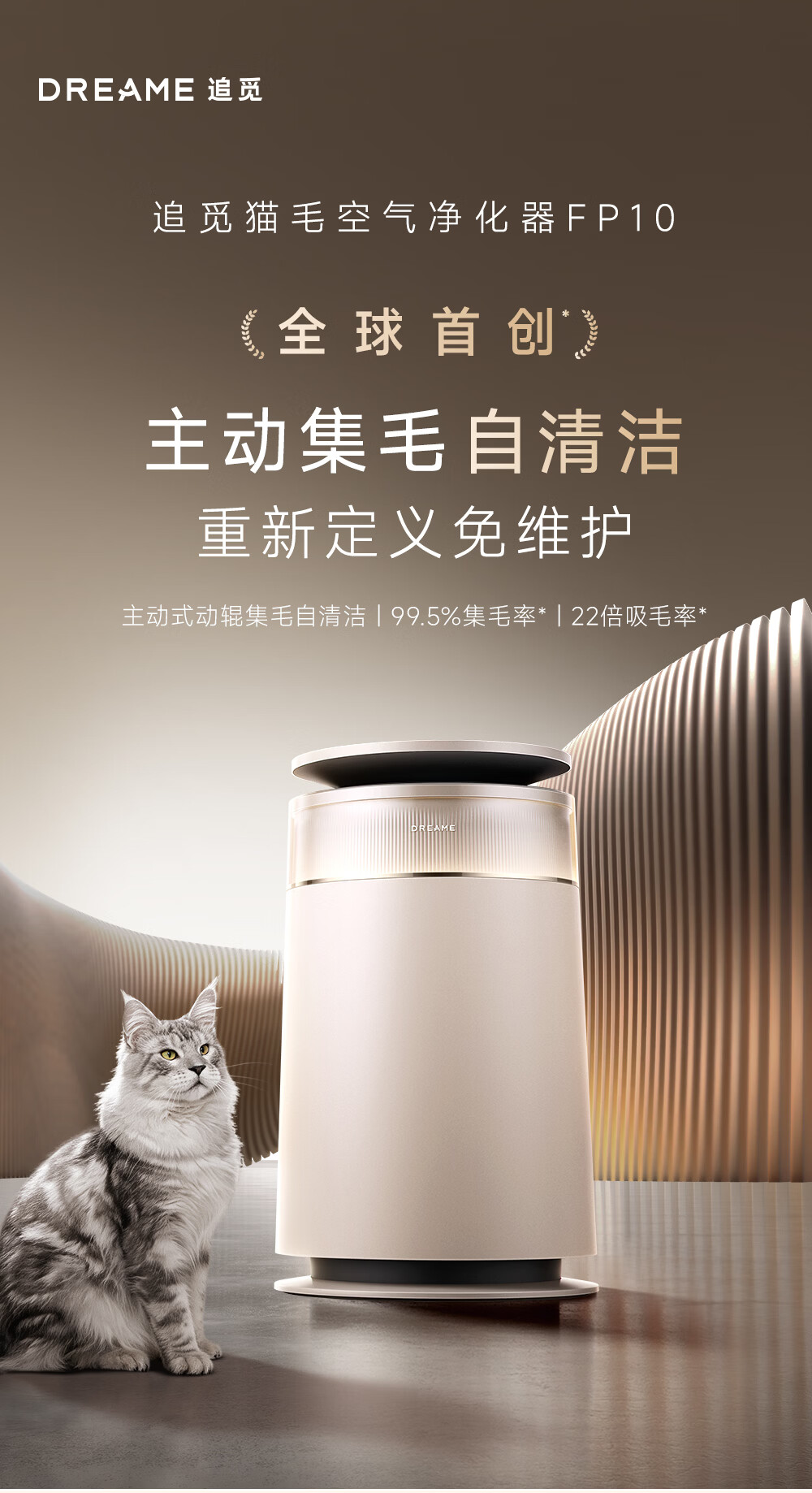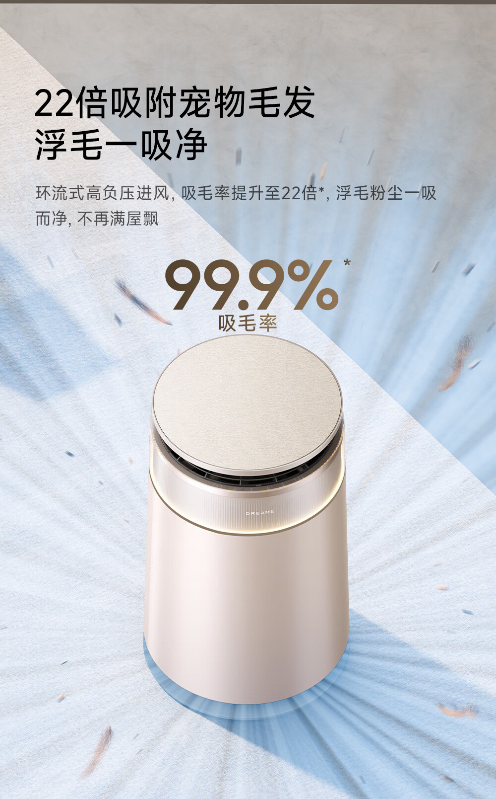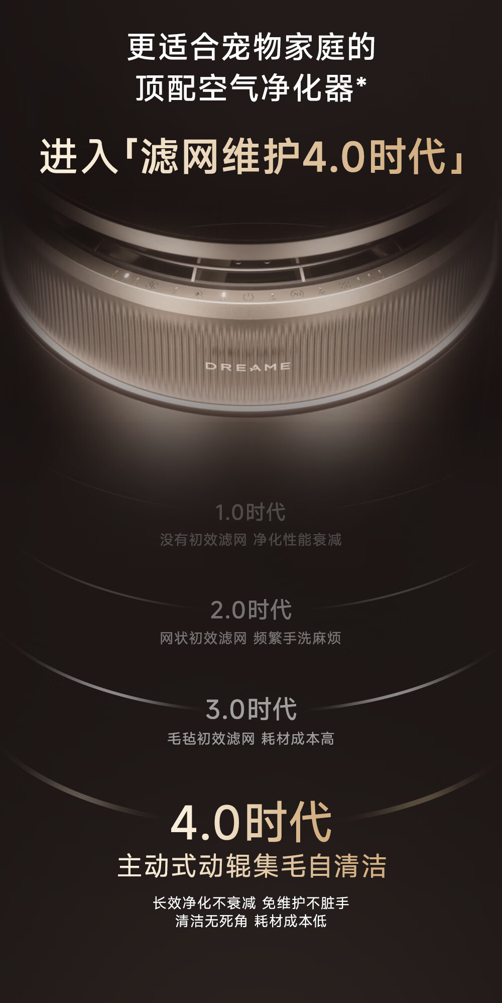 主动式动辊集毛自清洁长效守护毛孩子;免维护滤网0耗材猫毛不“捣乱”;六重过滤深层净化层层守护宠家空气
