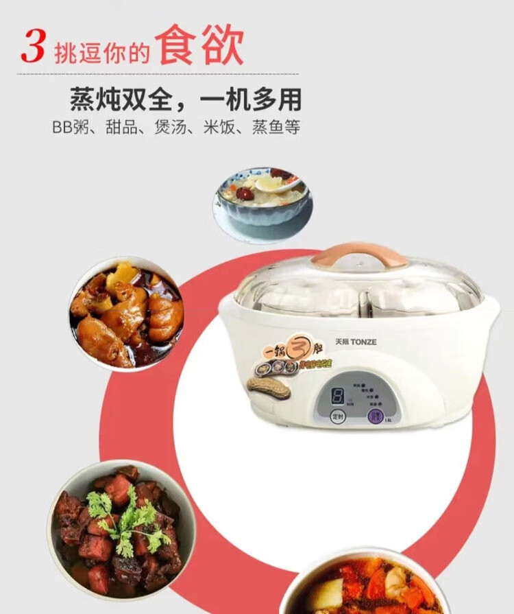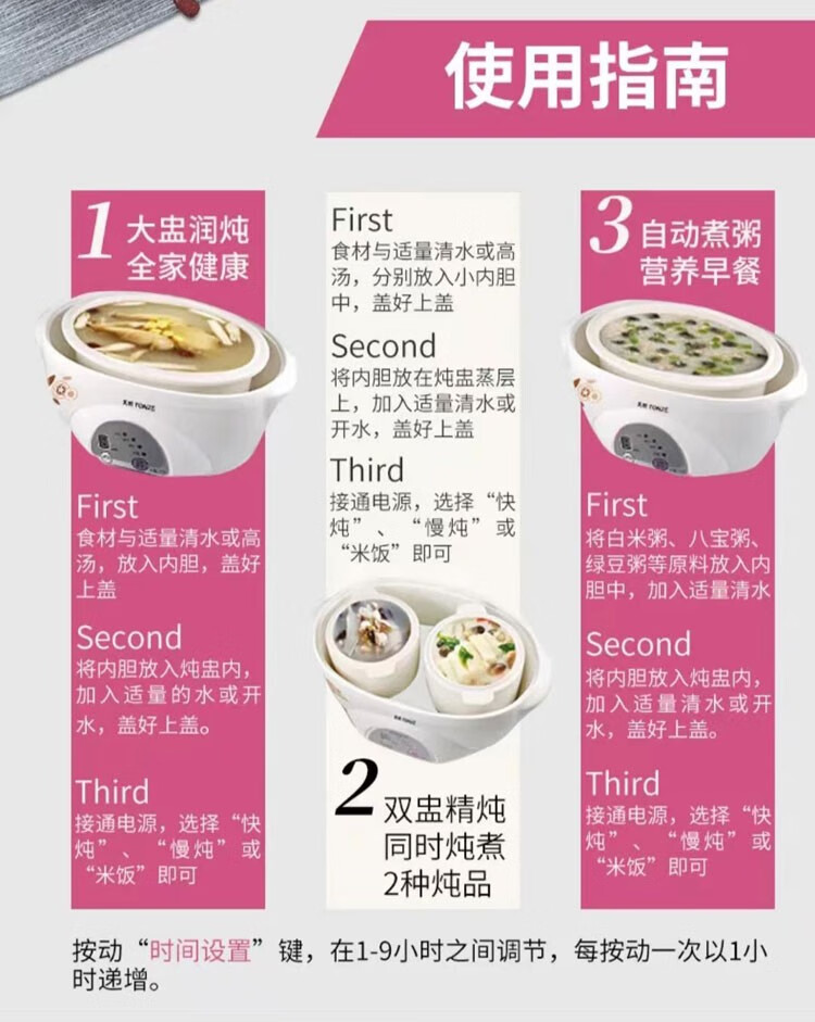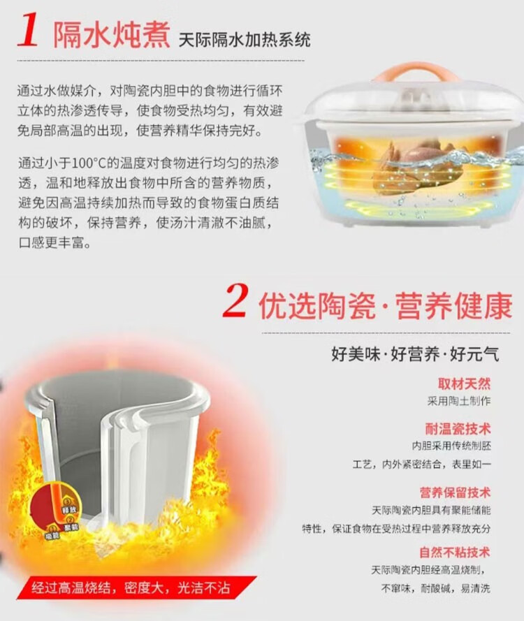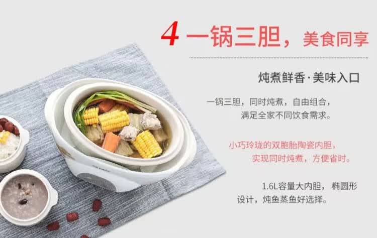 功能:燕窝,营养蒸,蒸蛋羹,炖,卤肉,,煮白粥,煮杂粮粥,煮辅食,炖甜品,煲营养汤,炖鱼胶
