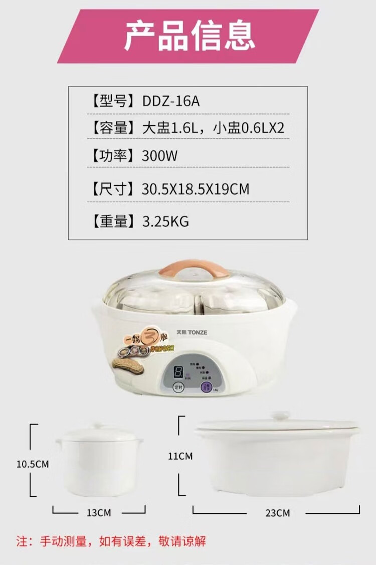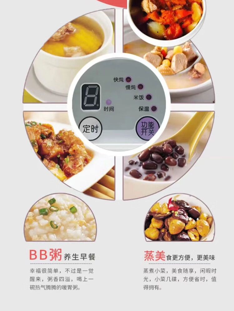 【类型】双层PP;【控制/显示】按键/一位数码管;【主要功能】快炖、慢炖、米饭