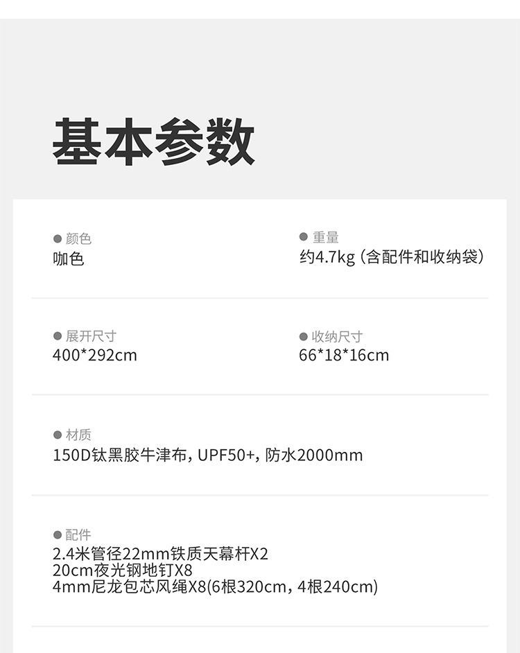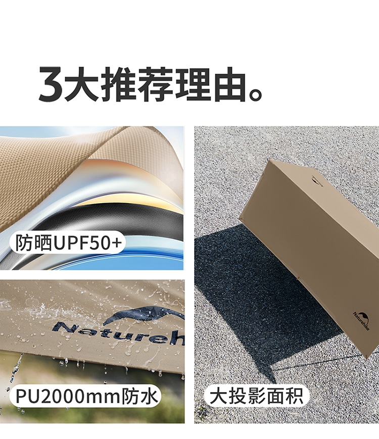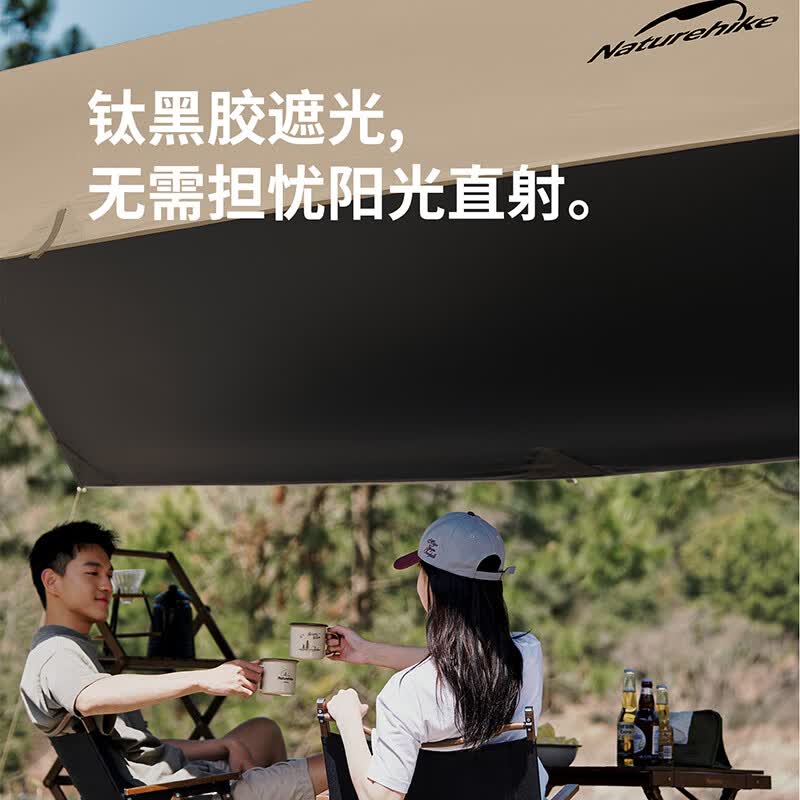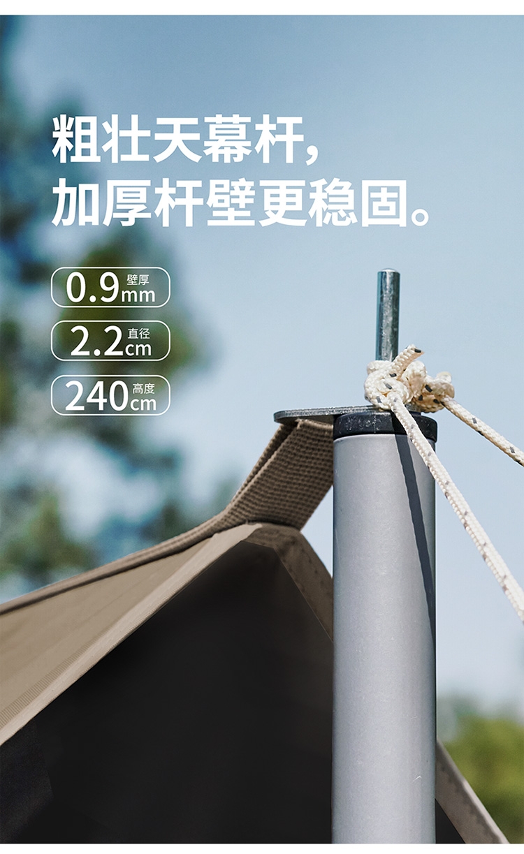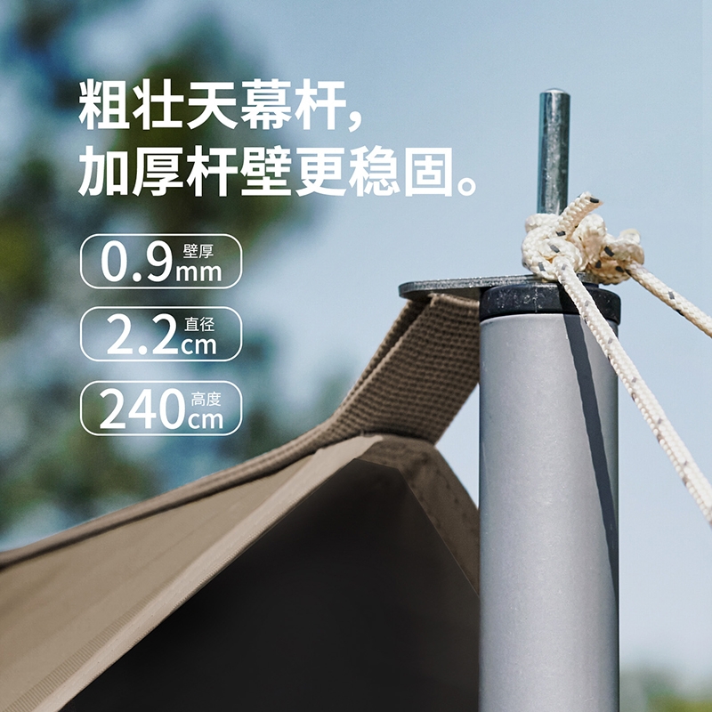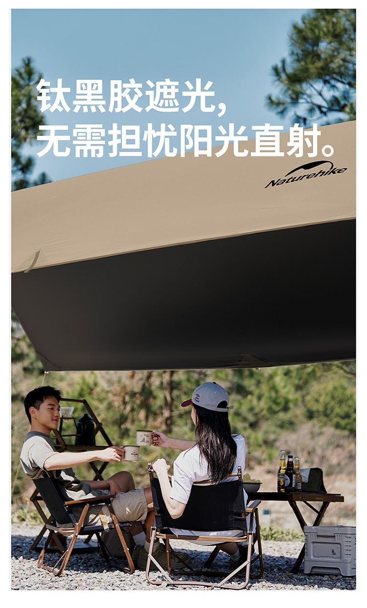 粗壮天幕杆,加厚杆壁更稳固。;隔热遮光,钛黑胶防晒;大遮阳面积,聚会体验更惬意。