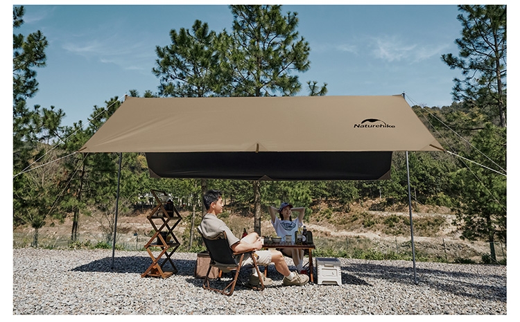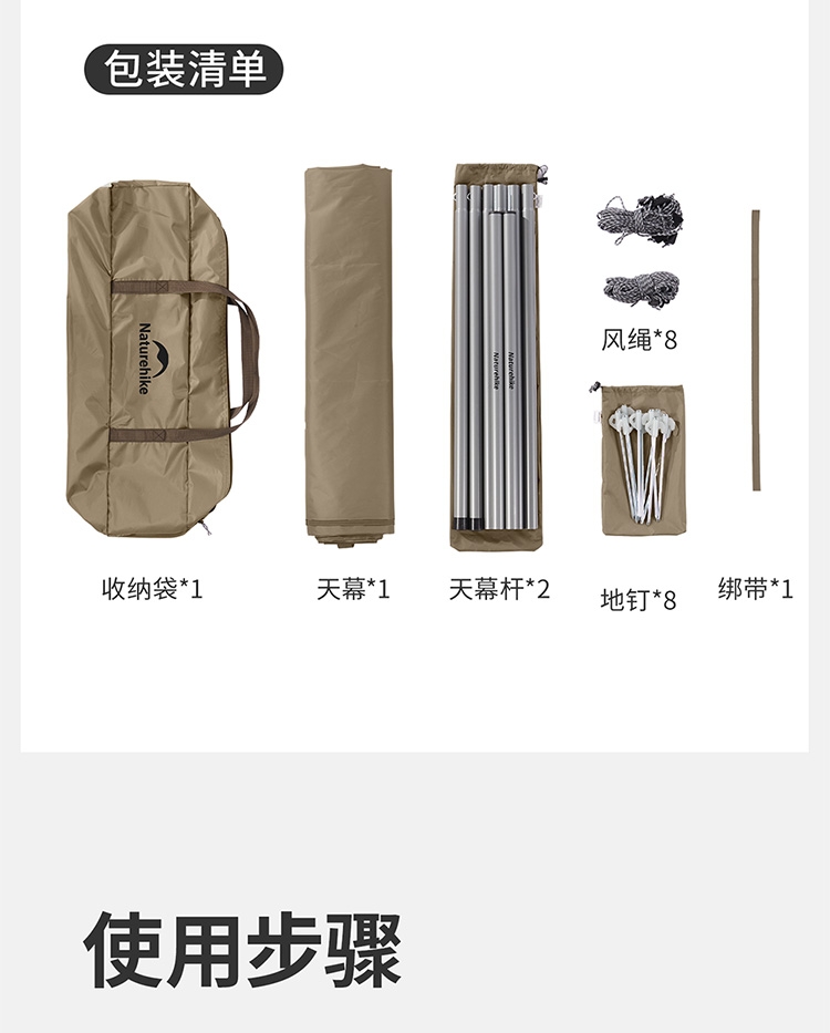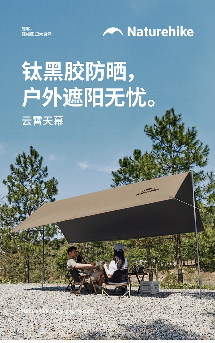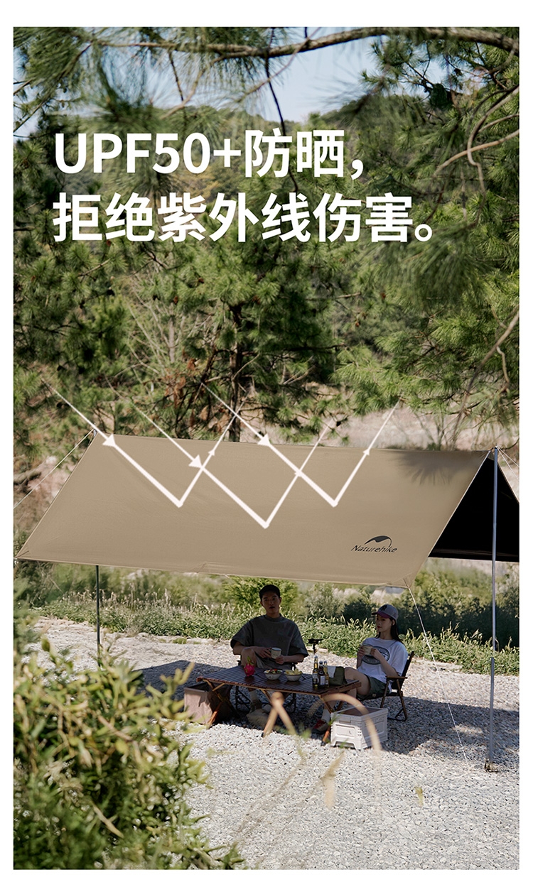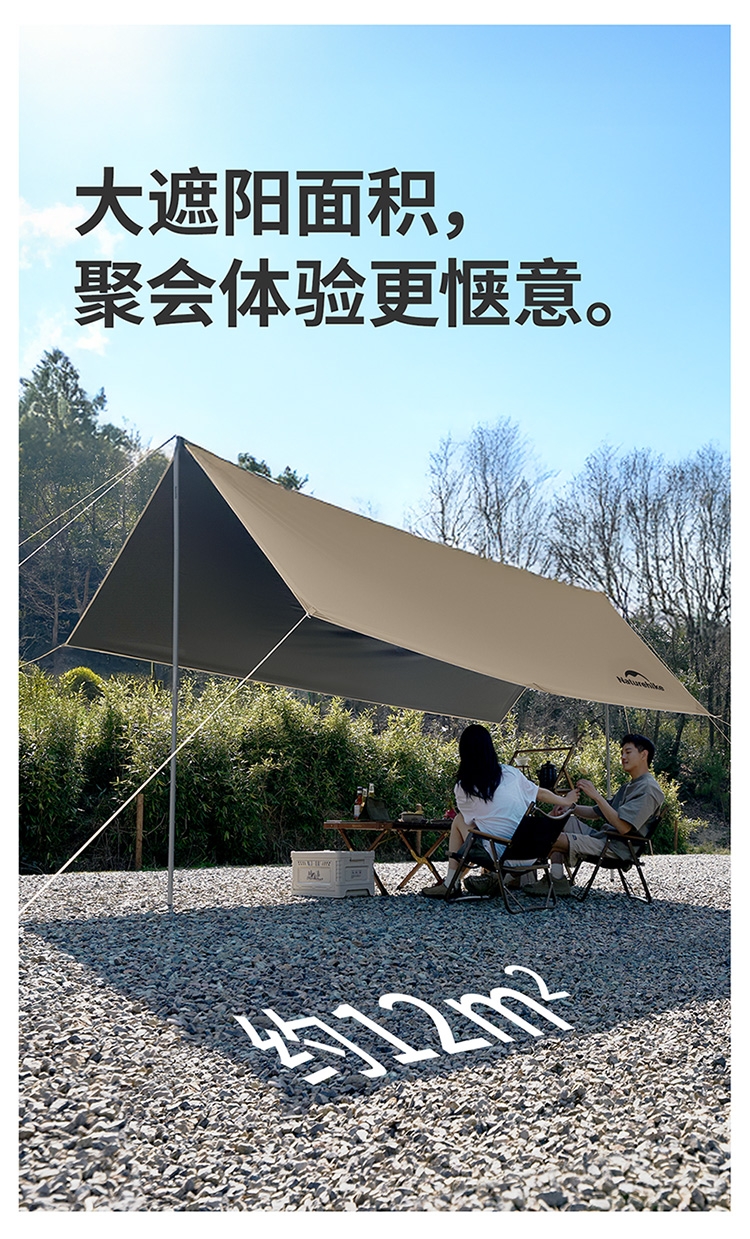 粗壮天幕杆,加厚杆壁更稳固。;隔热遮光,钛黑胶防晒;大遮阳面积,聚会体验更惬意。