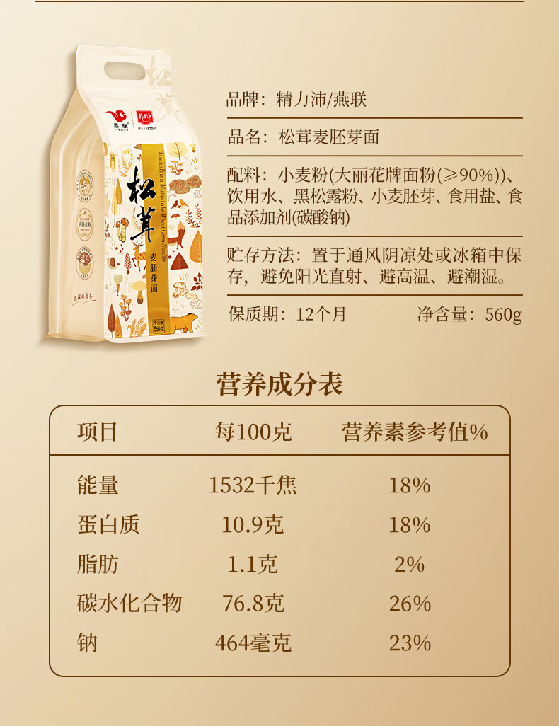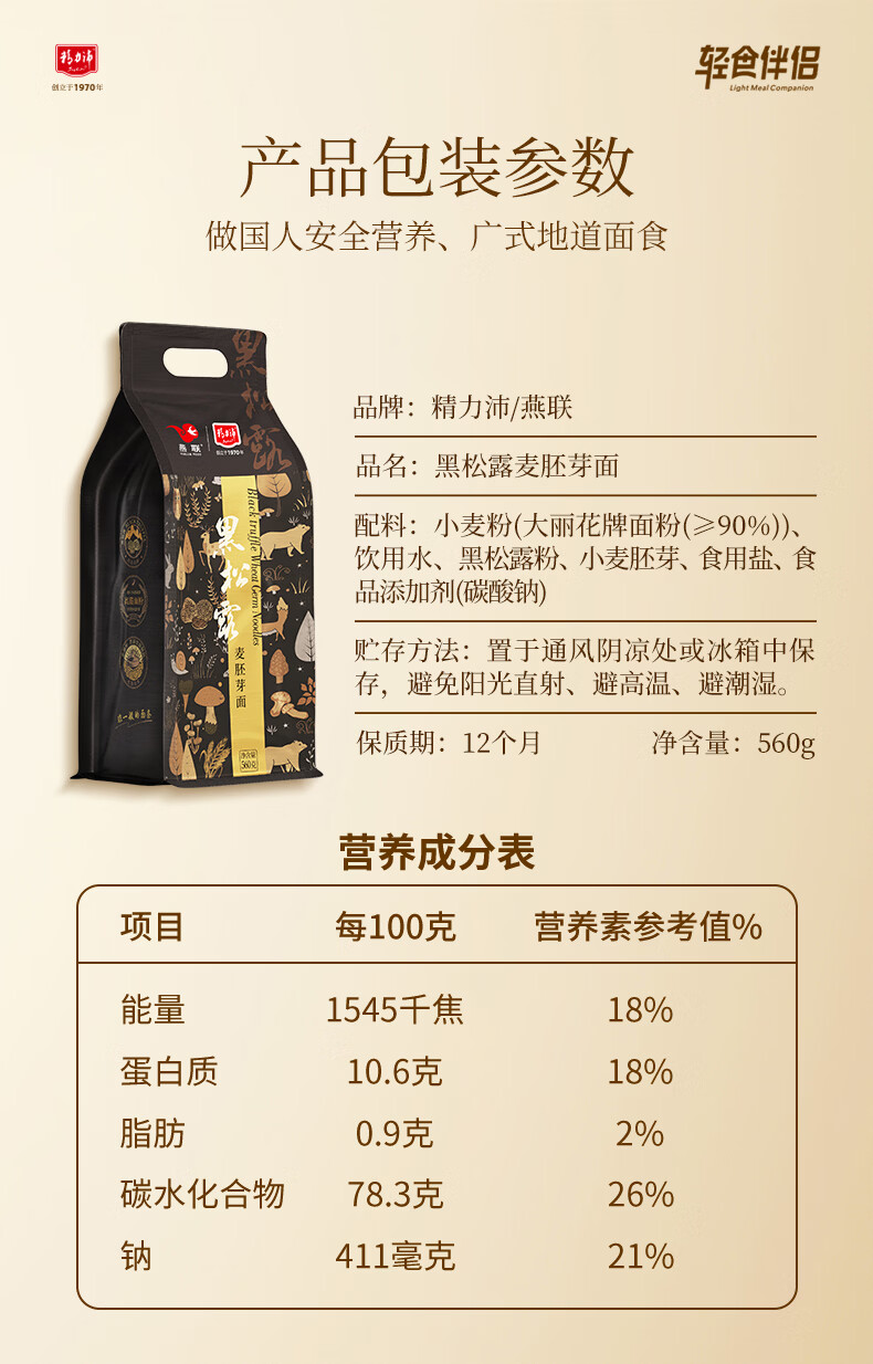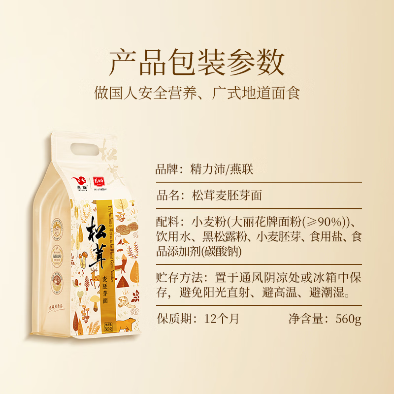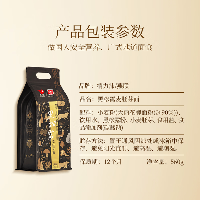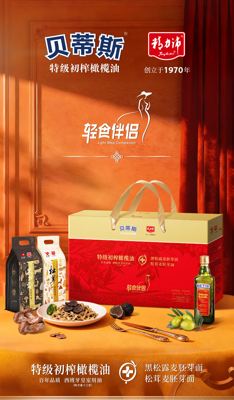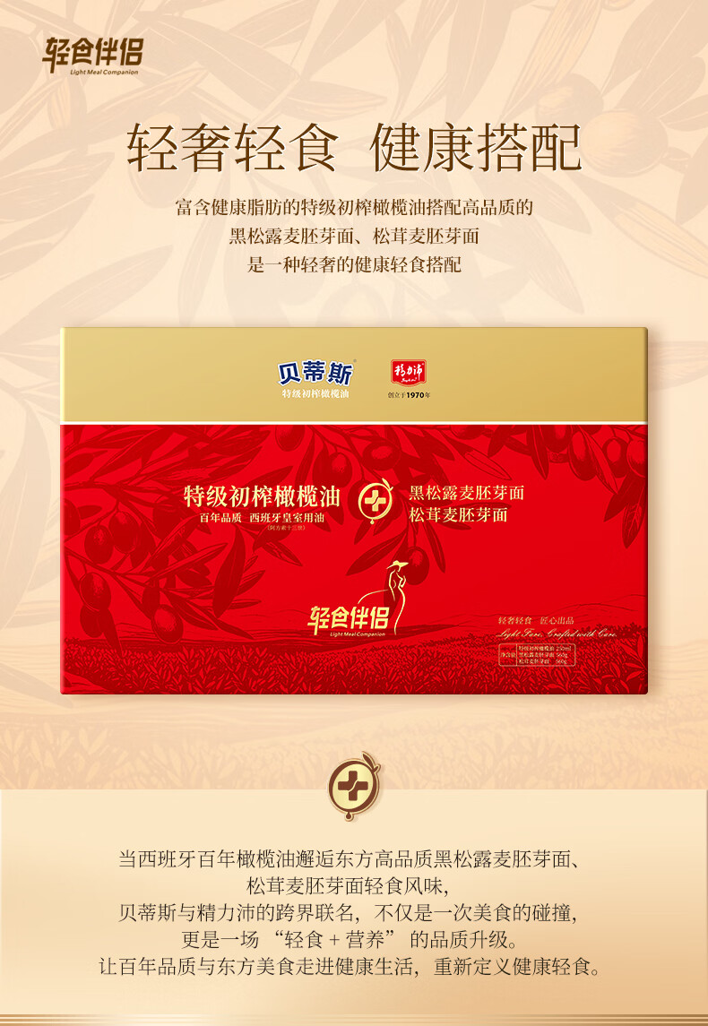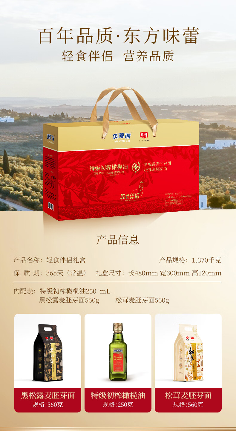 配置清单:250ml贝蒂斯特级初榨橄榄油,560kg燕联黑松露麦胚芽面;560kg燕联松茸麦胚芽面