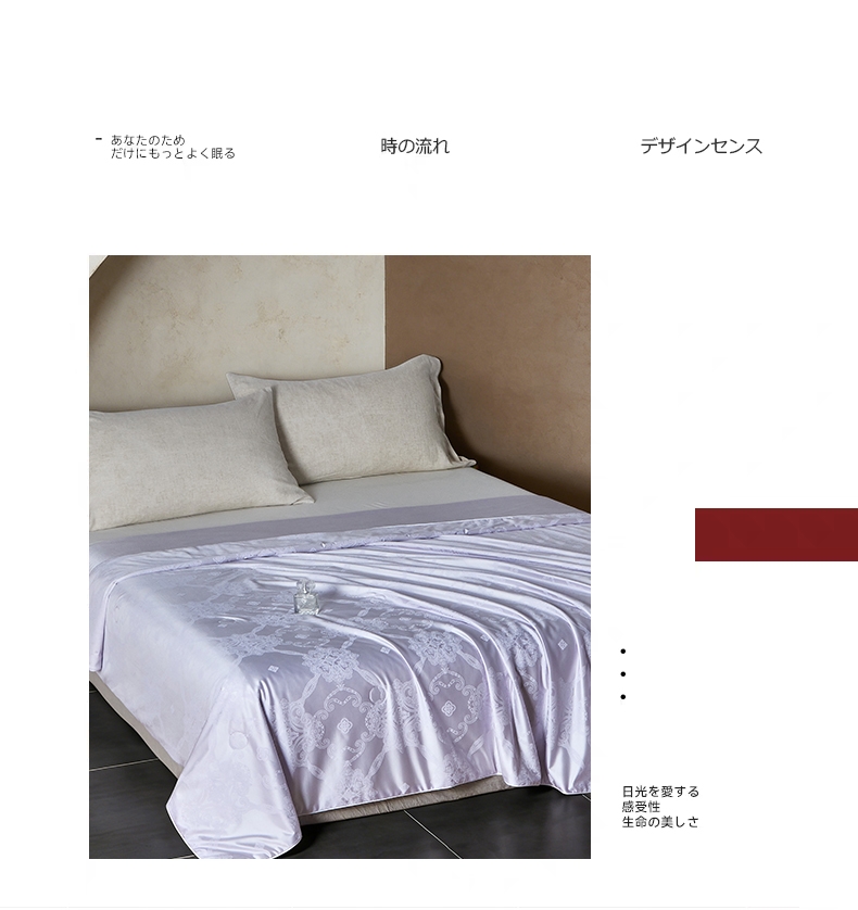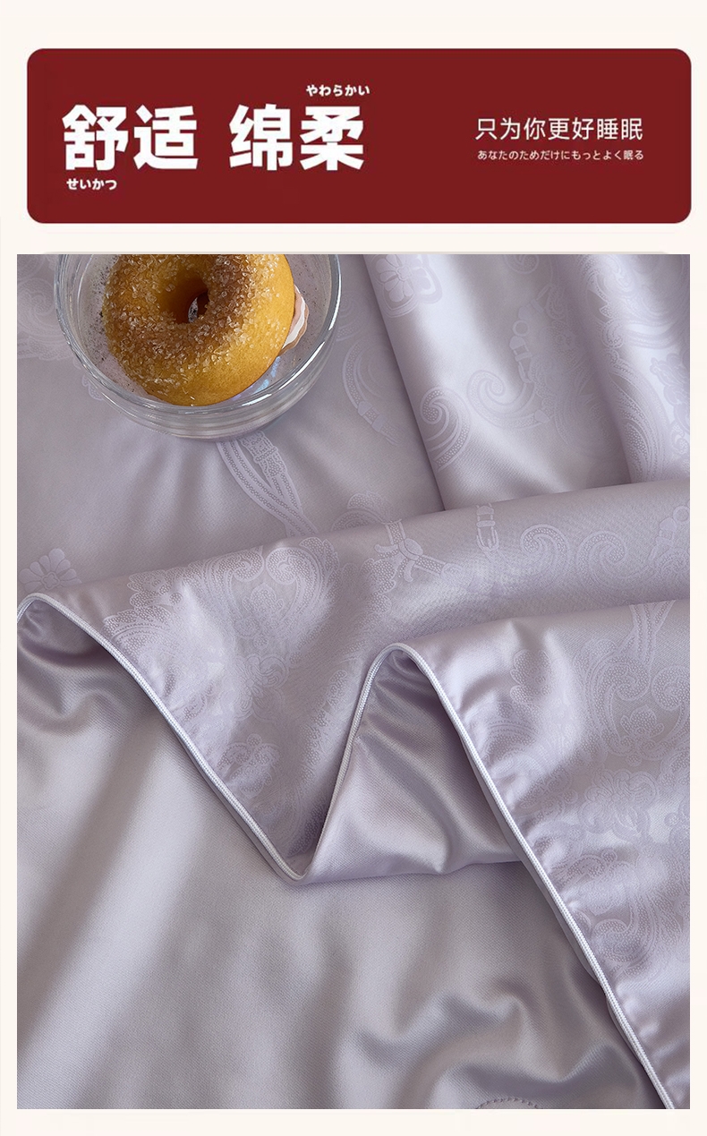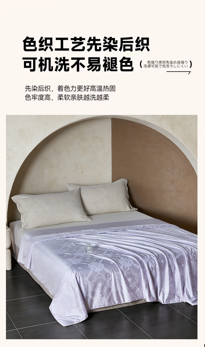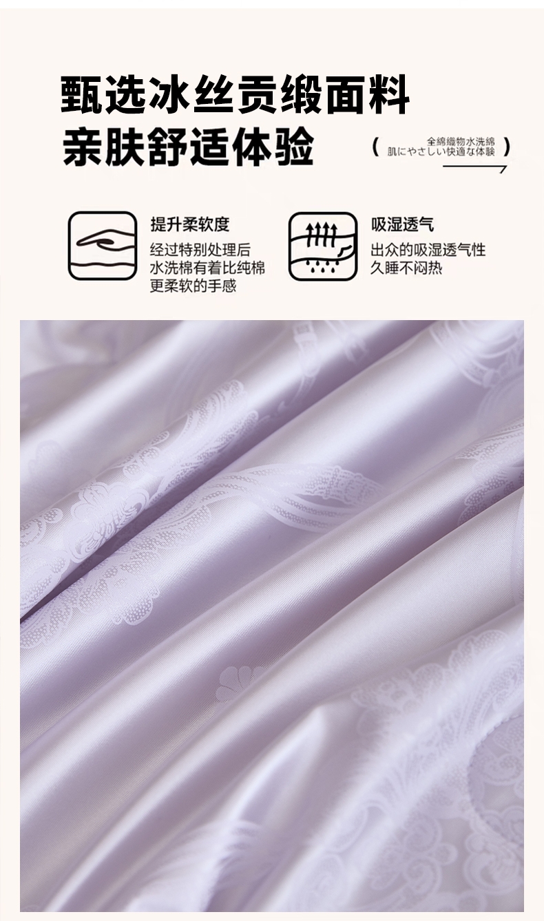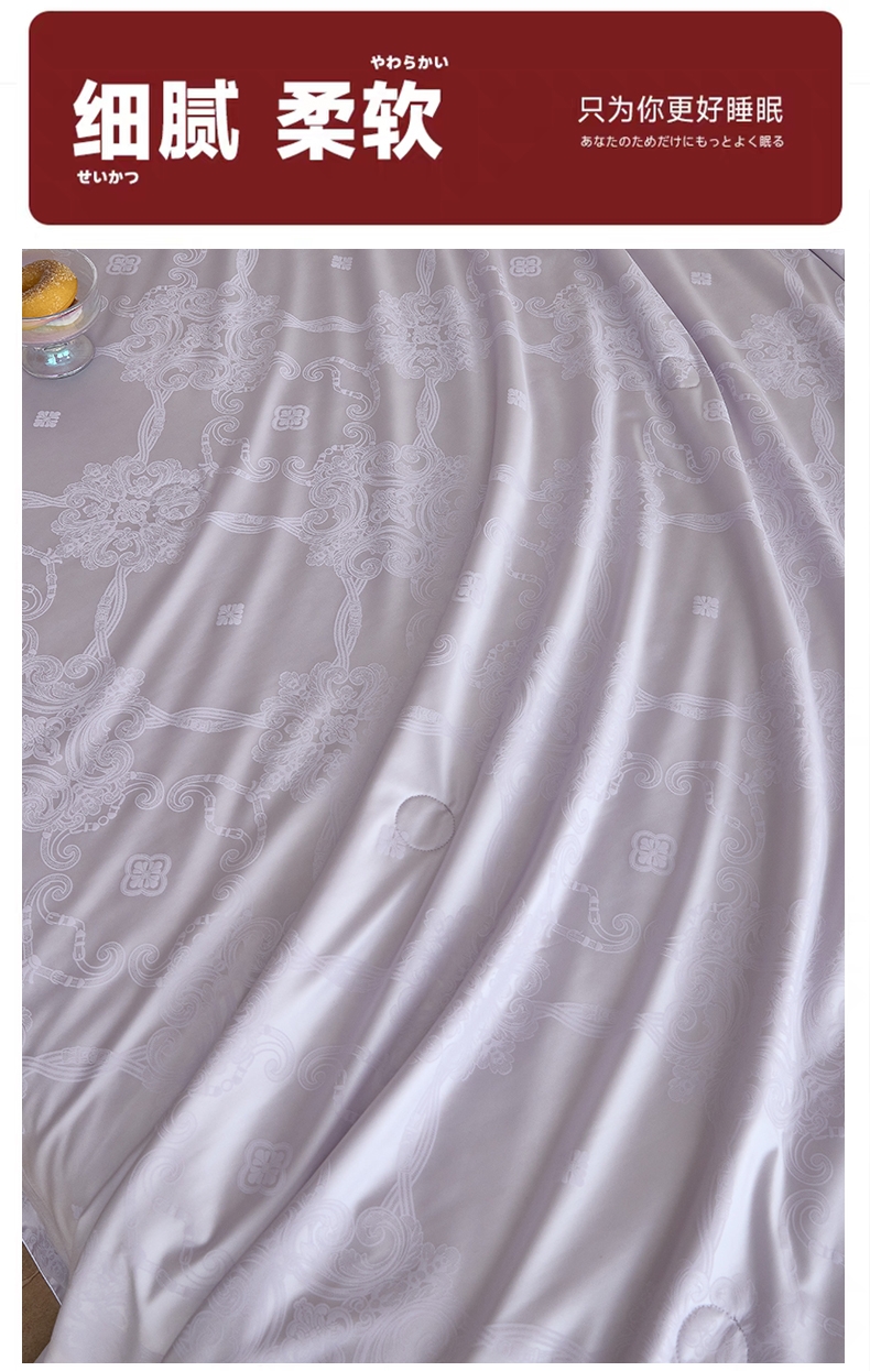 优选凉感冰丝面料,水洗工艺处理,提升拉力强度;蚕丝被称为“纤维皇后”因其中含有丰富的氨基酸;产生“天然调温”功能; 给您一个时尚健康的完美睡眠