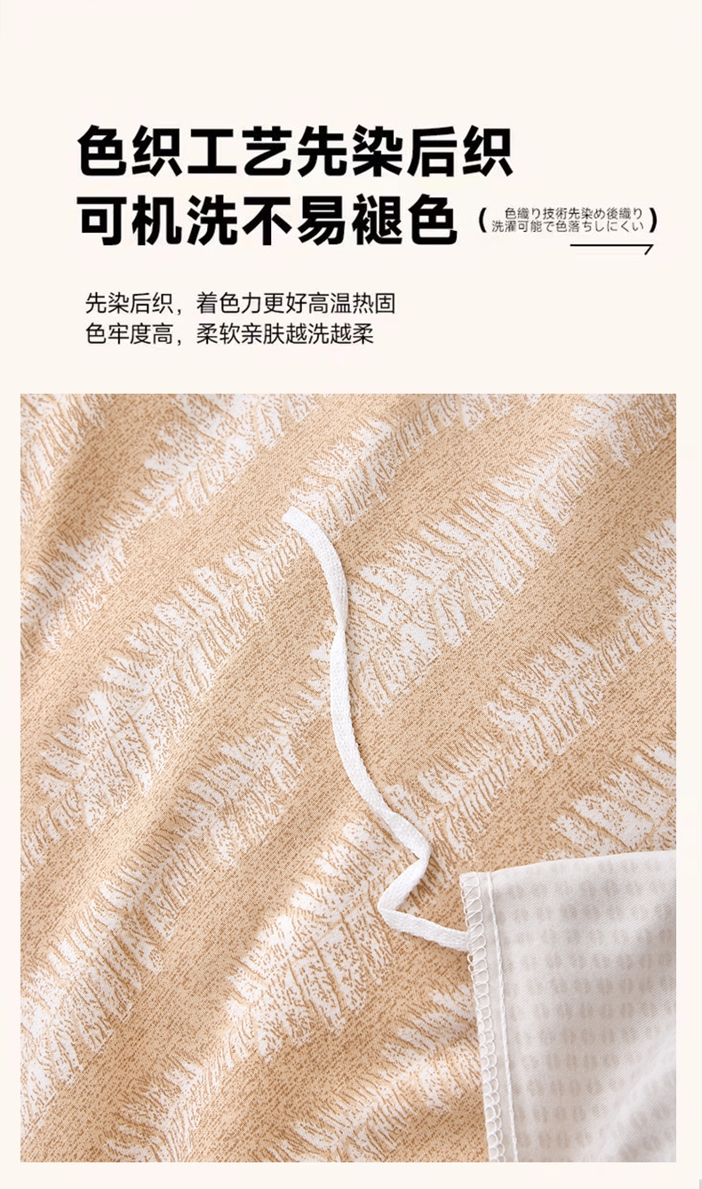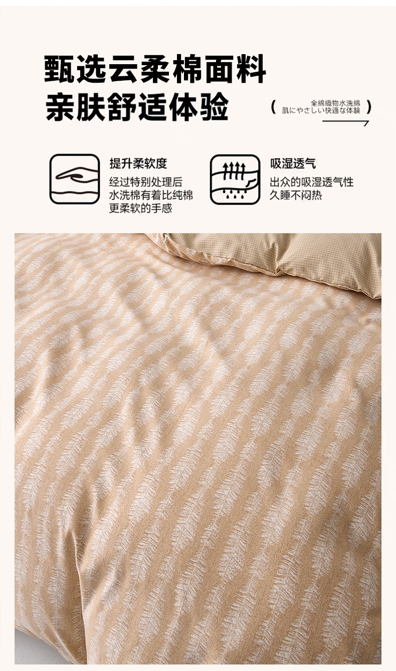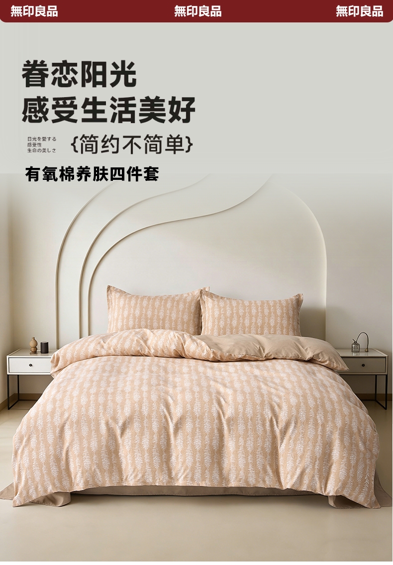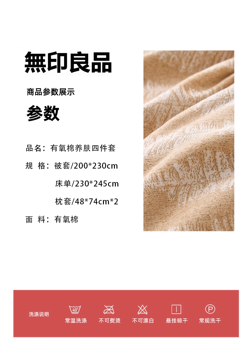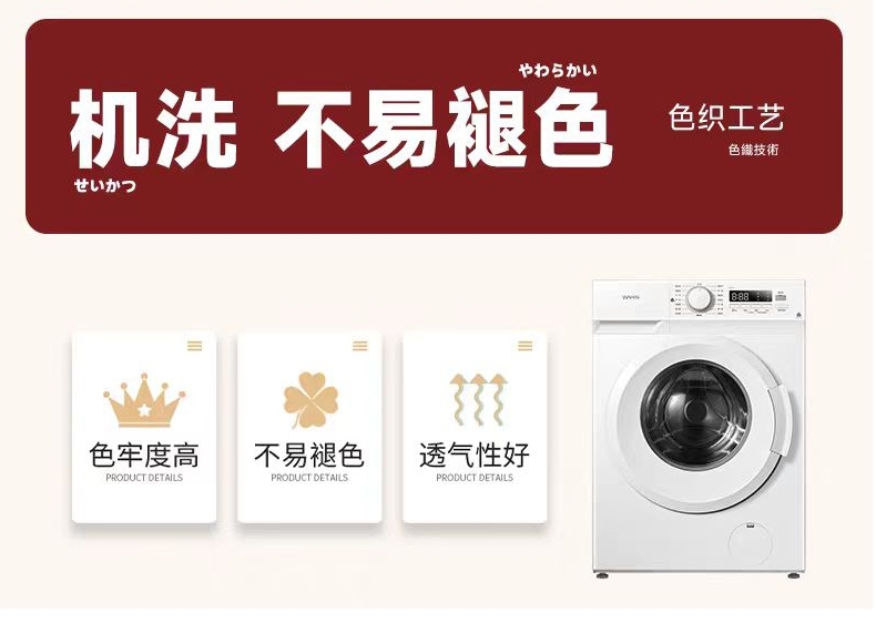 精选有氧棉磨毛面料,使面料具有水洗以后的柔软特性;采用绿色环保的印染工艺,不起球不褪色;精致简约的绣花工艺结合无印良品特有的简约风设计