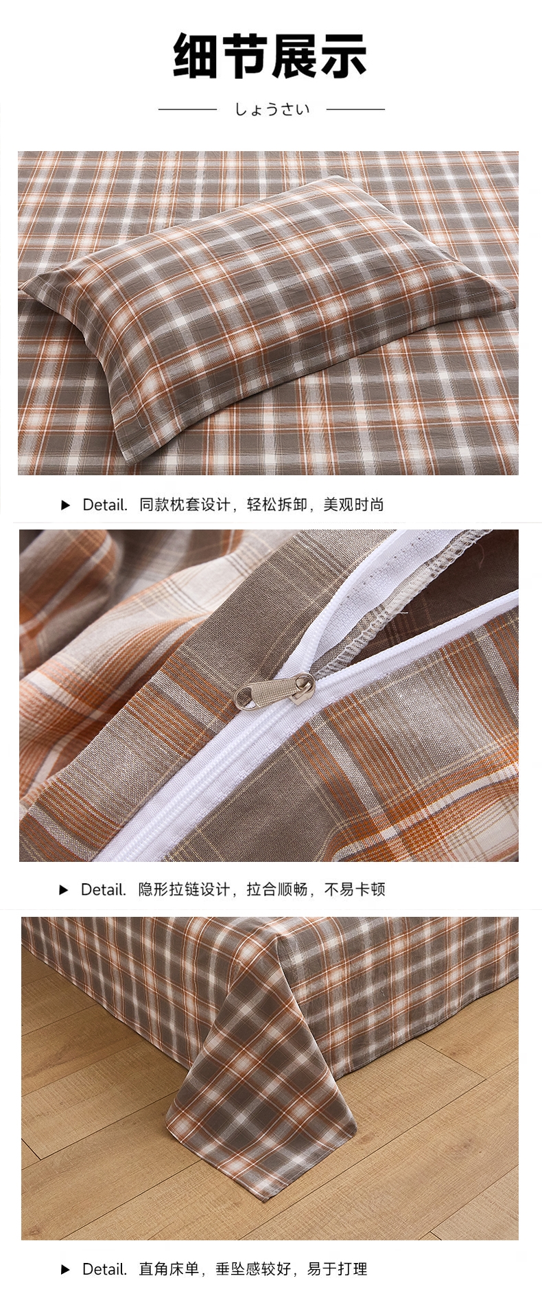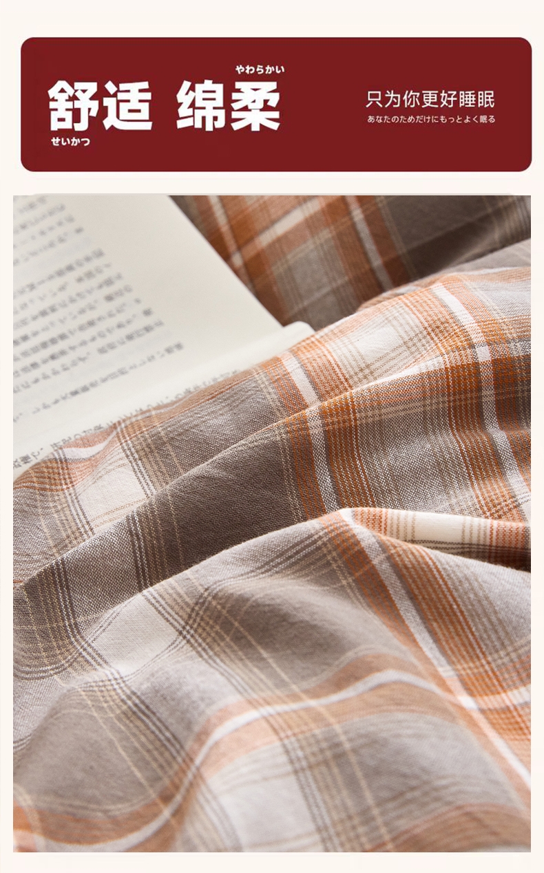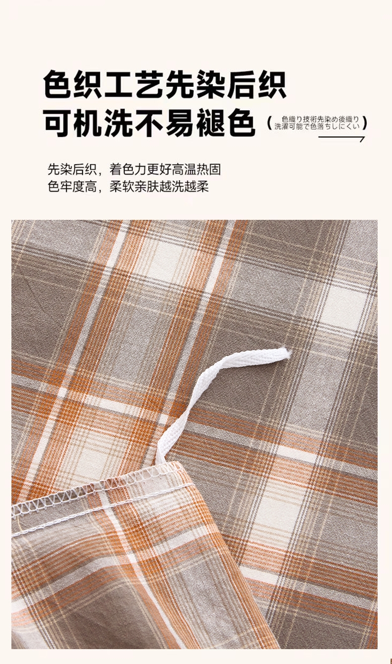 选用优质水洗色织棉面料,全工艺活性印染结合水洗处理;增加产品的舒适度、柔软度、拉力强度等; ;贡缎色织麻手感织造工艺,环保健康印染技术,简约时尚