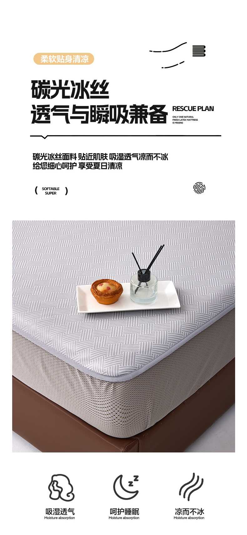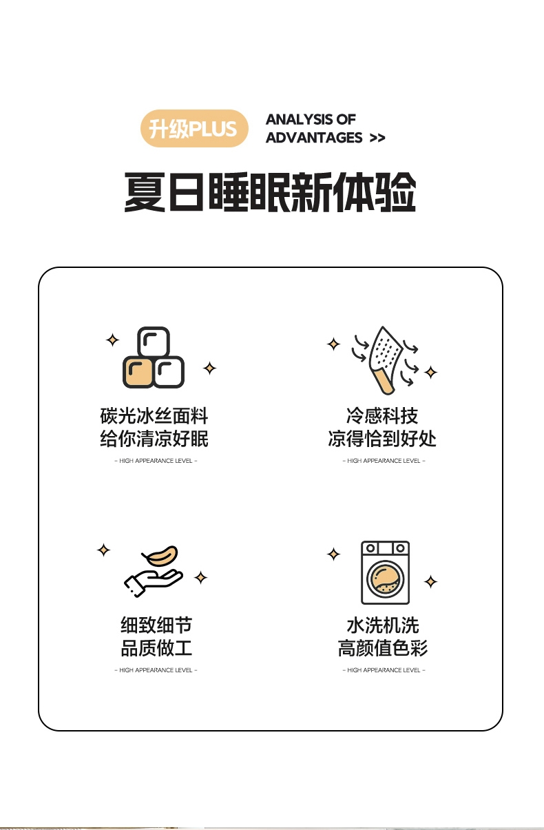 高密碳光冰丝席,自然清凉,凉而不冰,久睡不粘;可以破坏细菌的寄生环境,有效防止细菌滋生进入;有效起到抗菌效果,洁净卫生,适合裸睡。