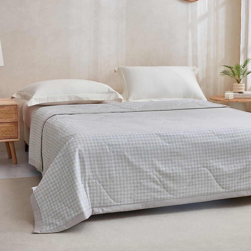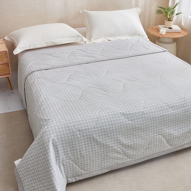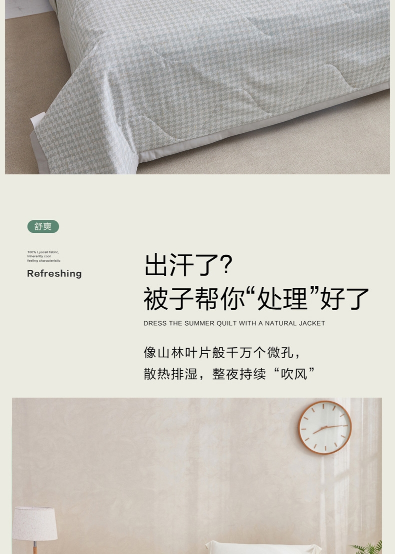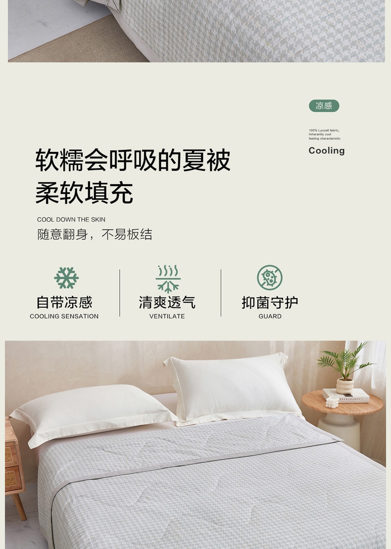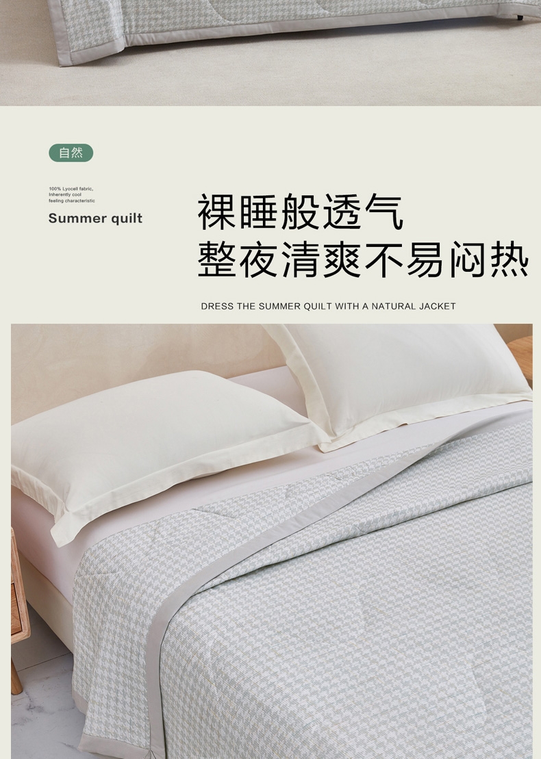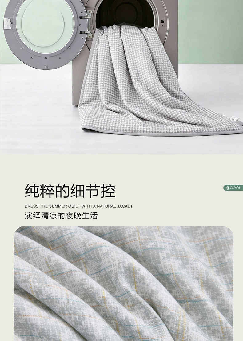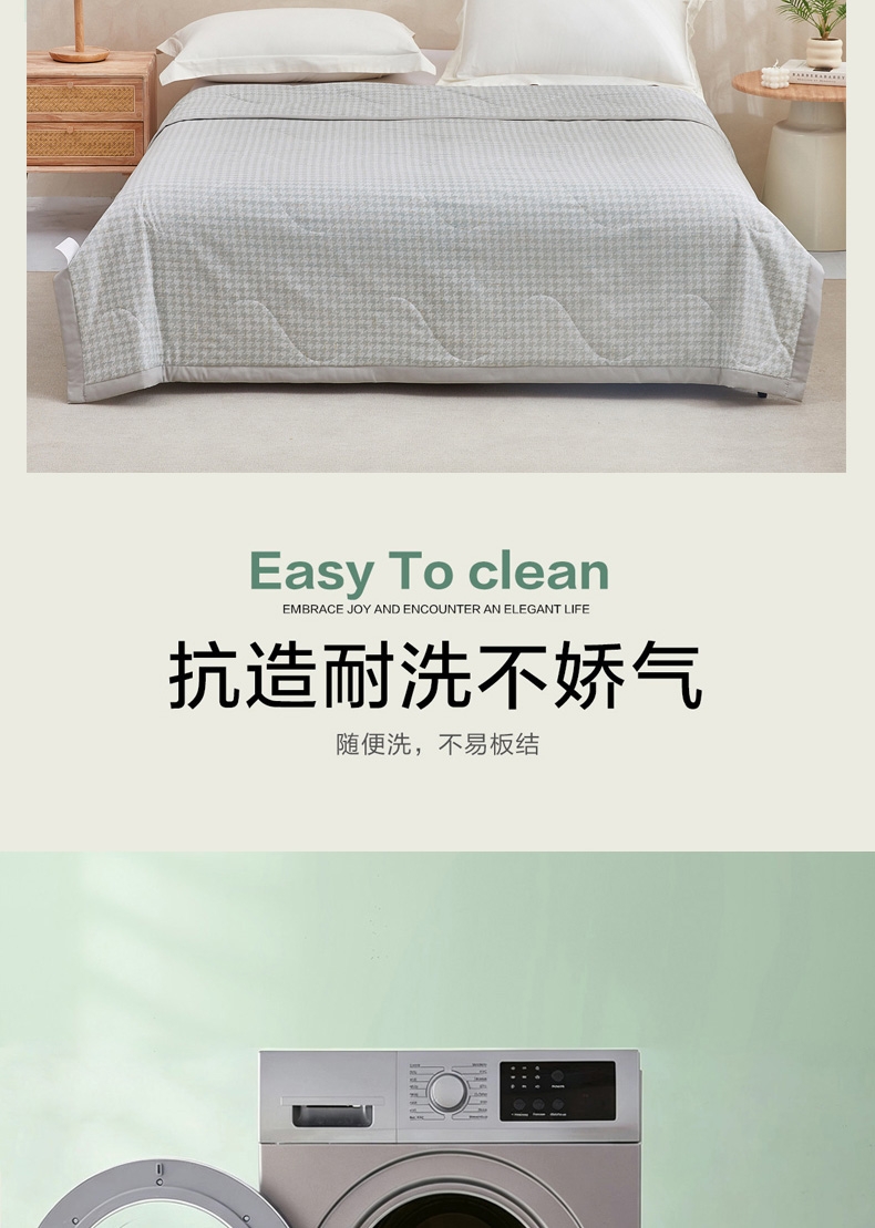 整条被子采用整张棉填充,机洗不变形 ;多点位绗缝技术,久用不跑偏 ;面料注入金银花抗菌因子,具有抗细菌,解热作用