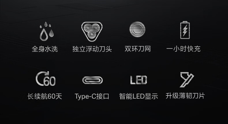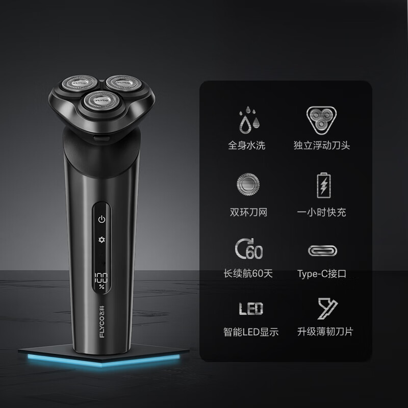 全身水洗、智能防夹须、双环贴面刀网;1小时快充,使用时常可达一个月;飞科是上市企业