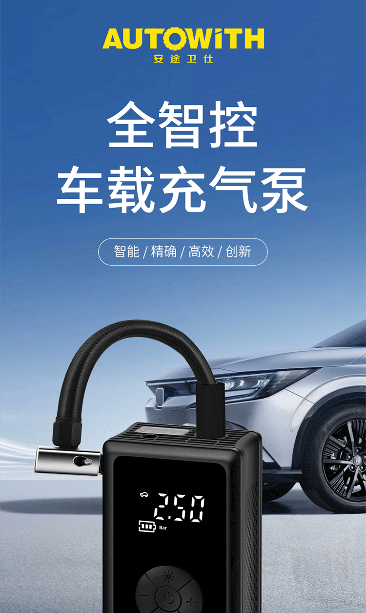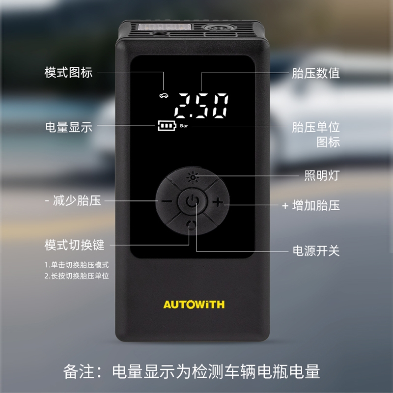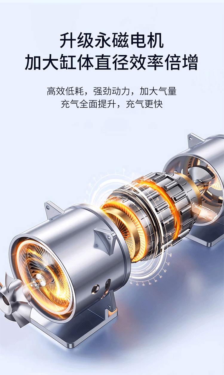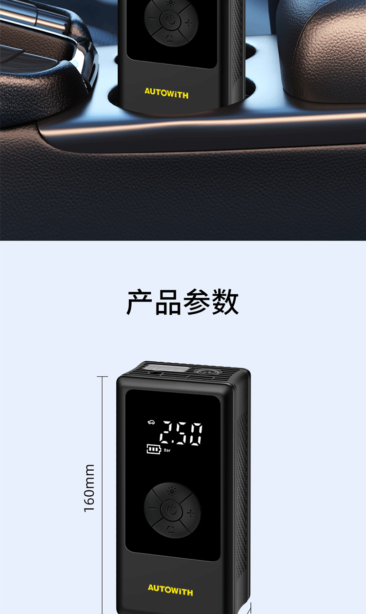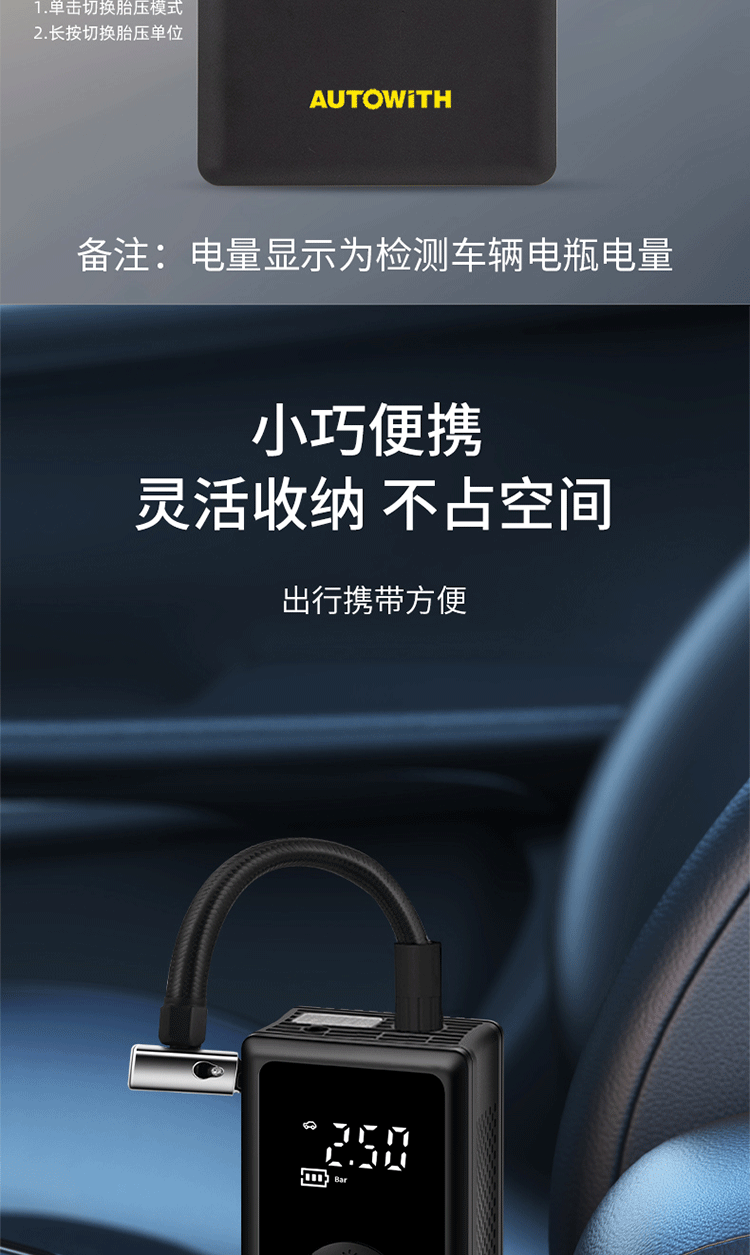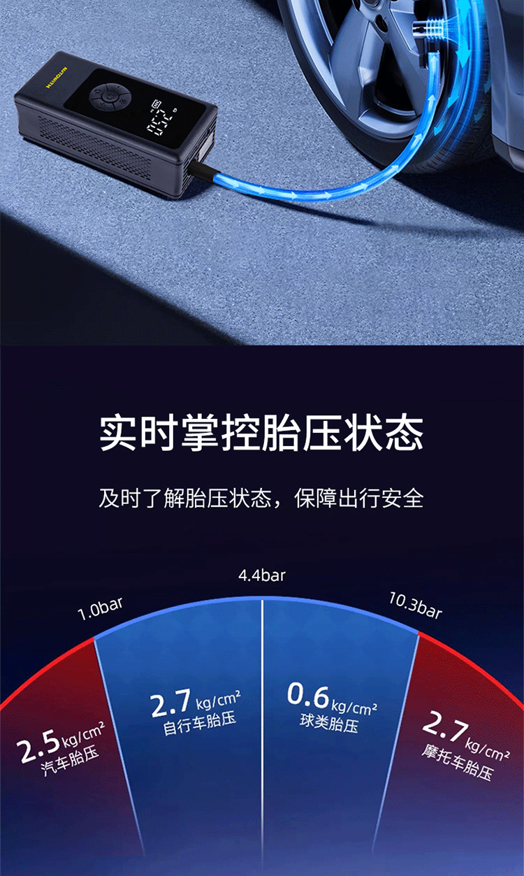 可测量车辆电瓶电量,随时掌握车辆电瓶电量情况;全铜超长车充线,带收纳袋,可收纳气管电线及主机;全铜大功率机芯,快速完成充气,智能过载保护系统