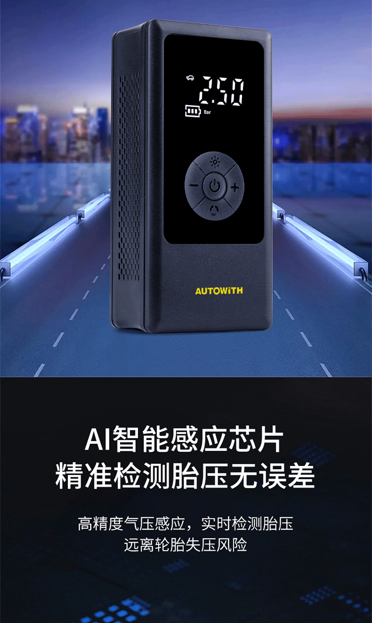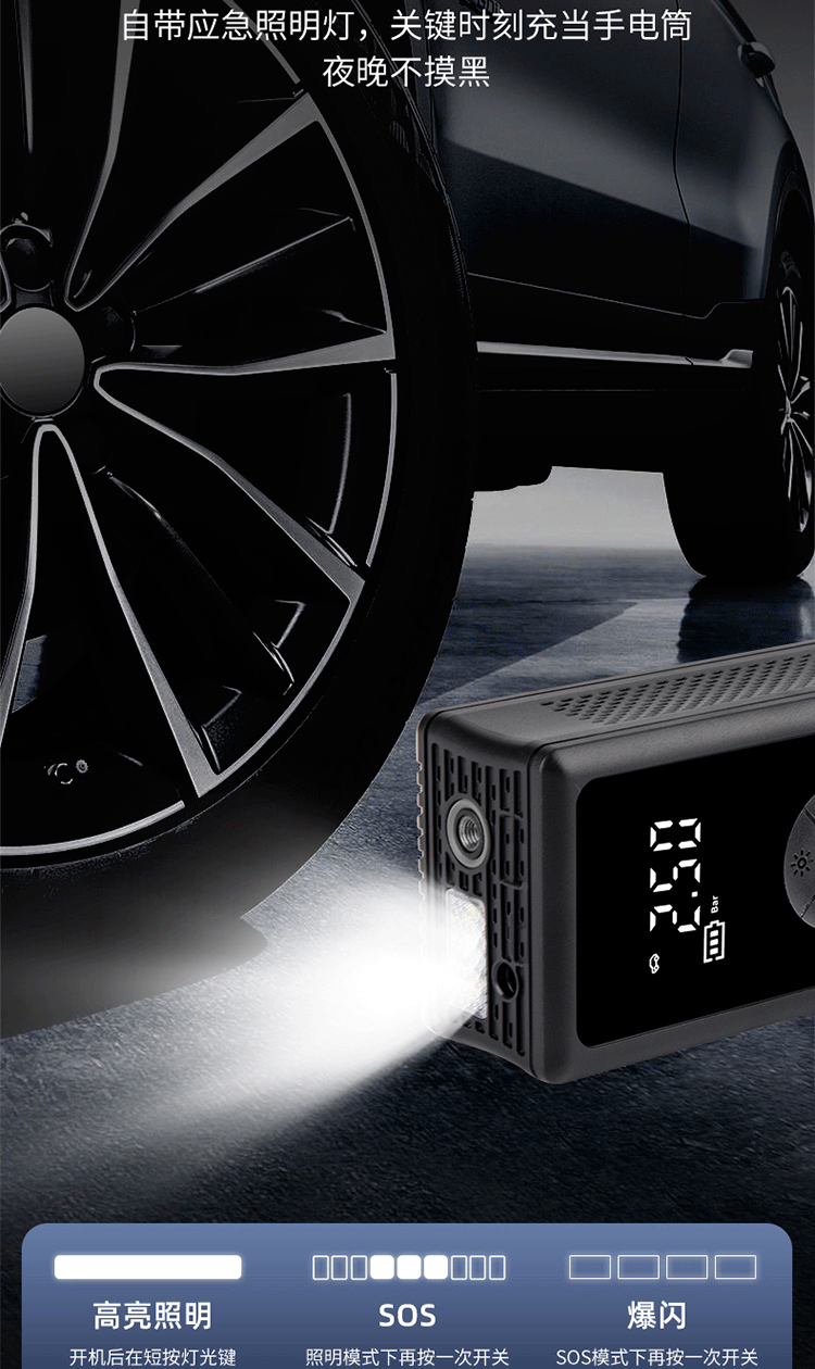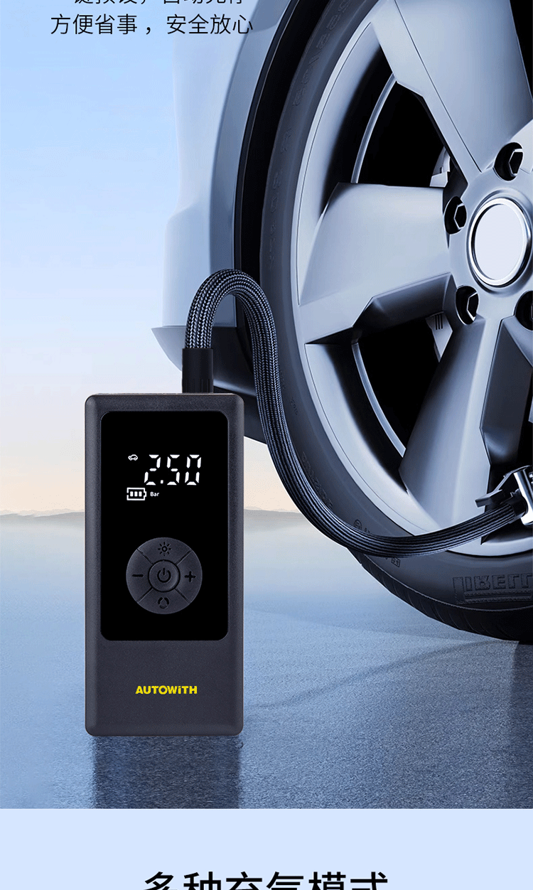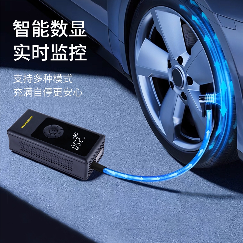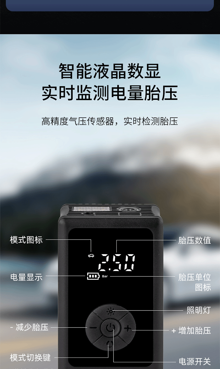 可测量车辆电瓶电量,随时掌握车辆电瓶电量情况;全铜超长车充线,带收纳袋,可收纳气管电线及主机;全铜大功率机芯,快速完成充气,智能过载保护系统