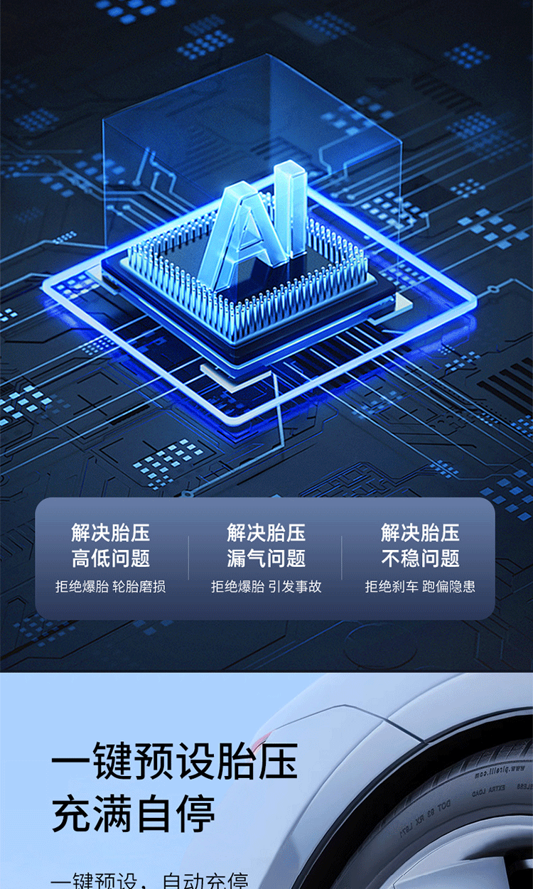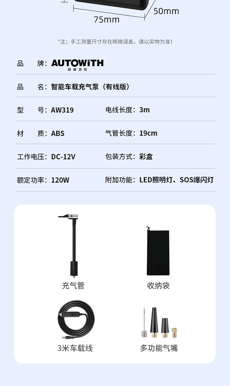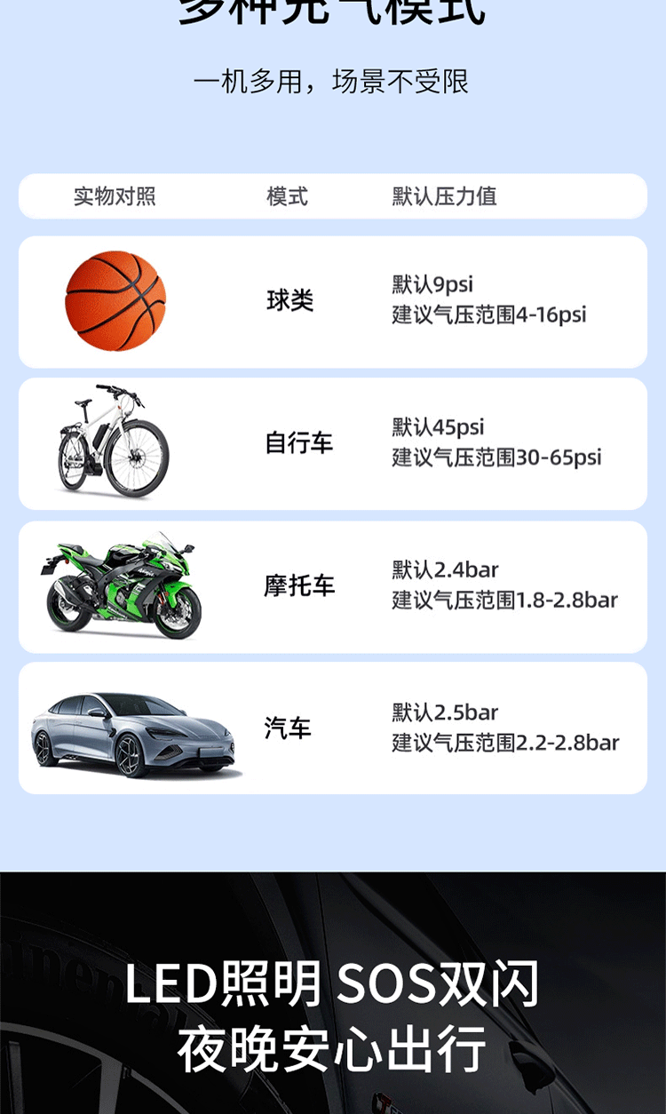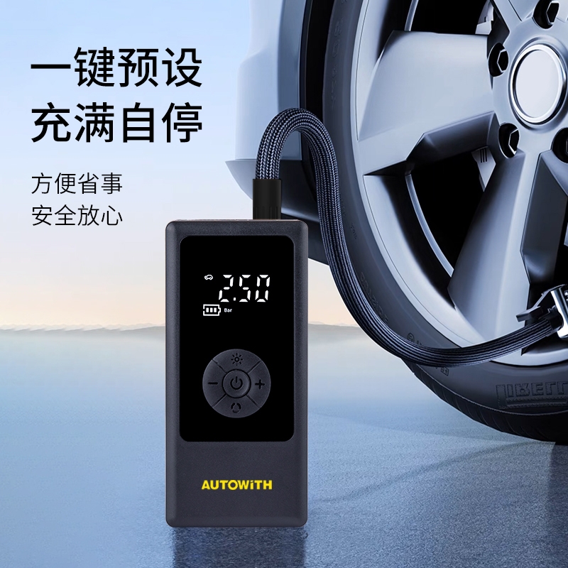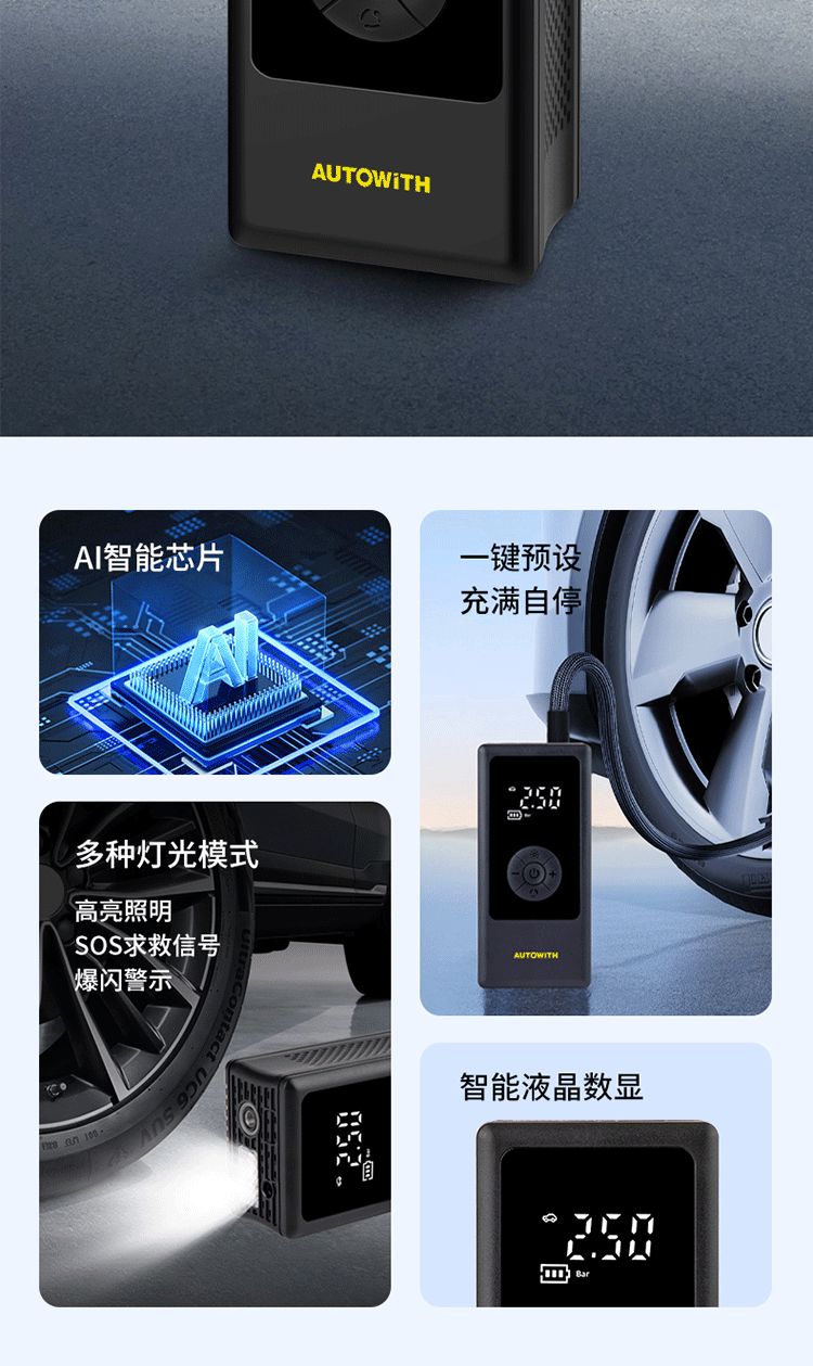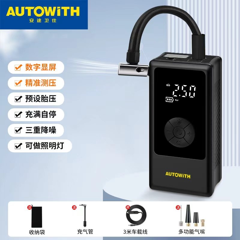 可测量车辆电瓶电量,随时掌握车辆电瓶电量情况;全铜超长车充线,带收纳袋,可收纳气管电线及主机;全铜大功率机芯,快速完成充气,智能过载保护系统
