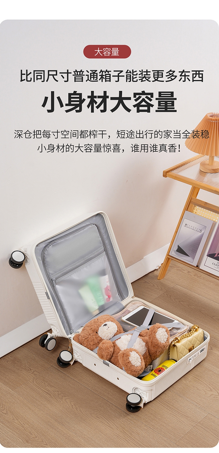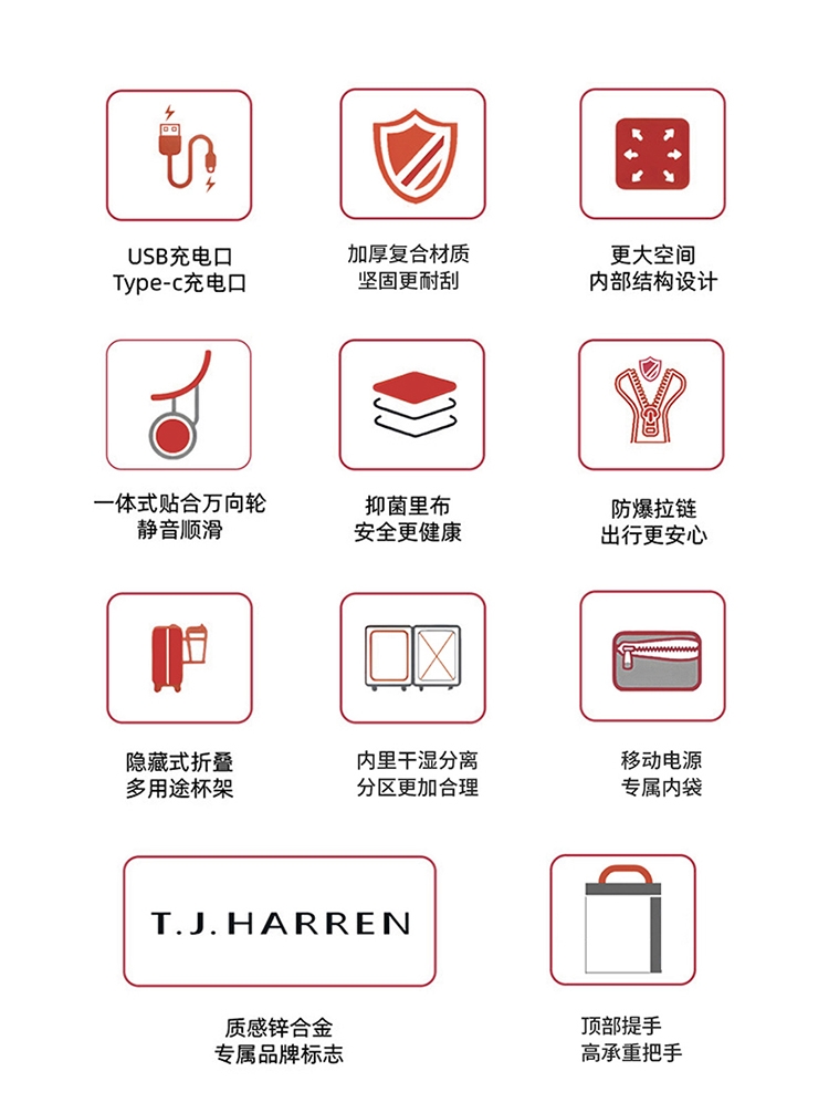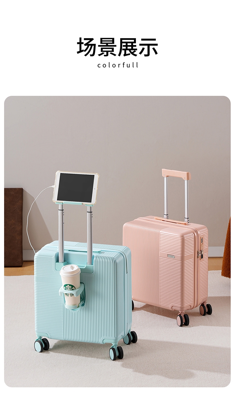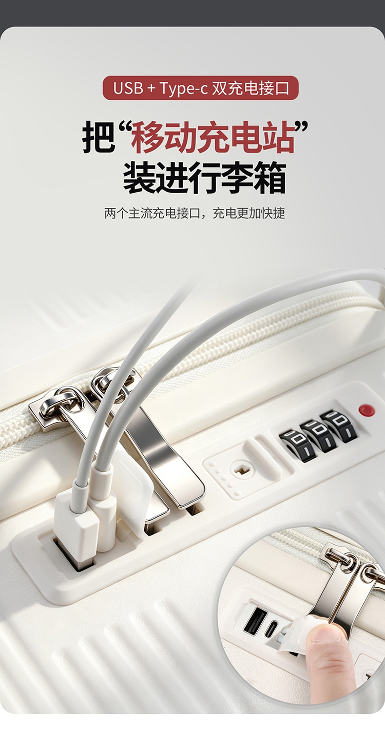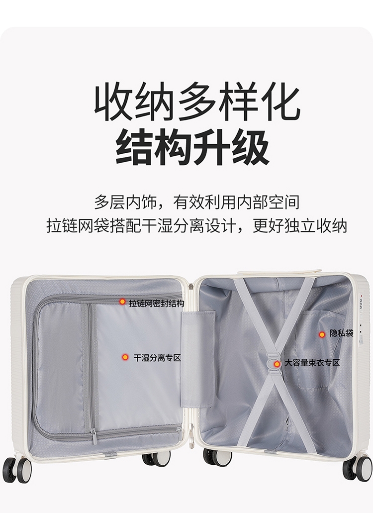 新一代人性化设计多功能拉杆箱,配置拉满,更具性价比;内里采用抑菌里布,干湿分离,分区合理;带USB及Type-C充电口,同时配置移动电源内袋