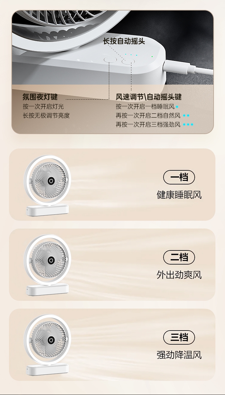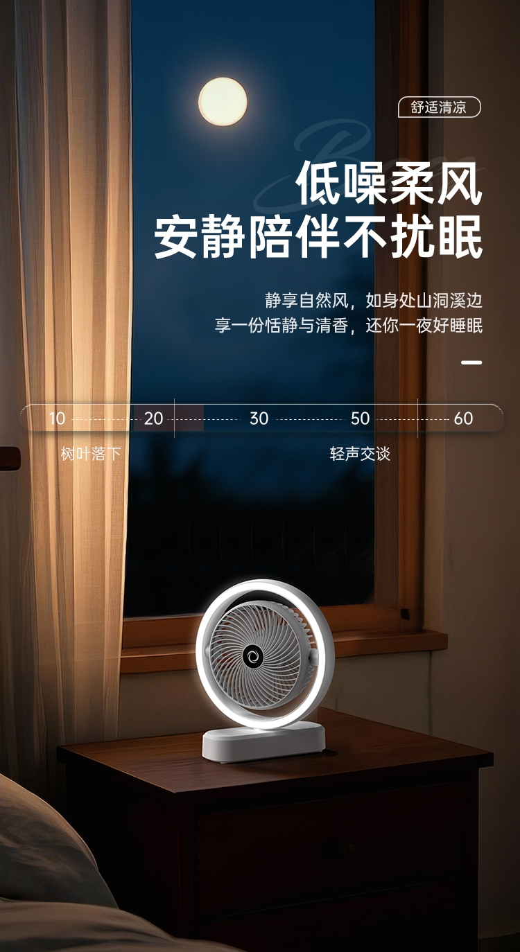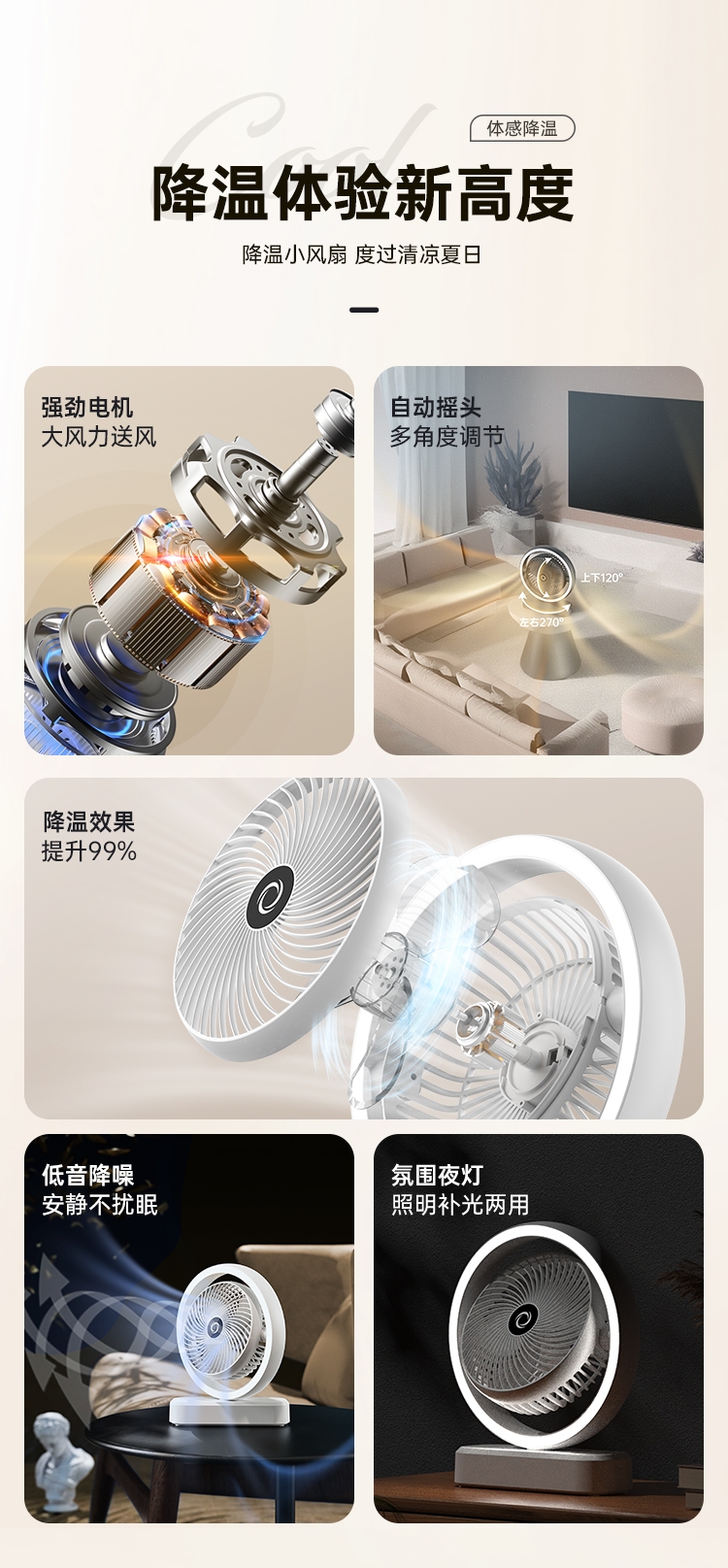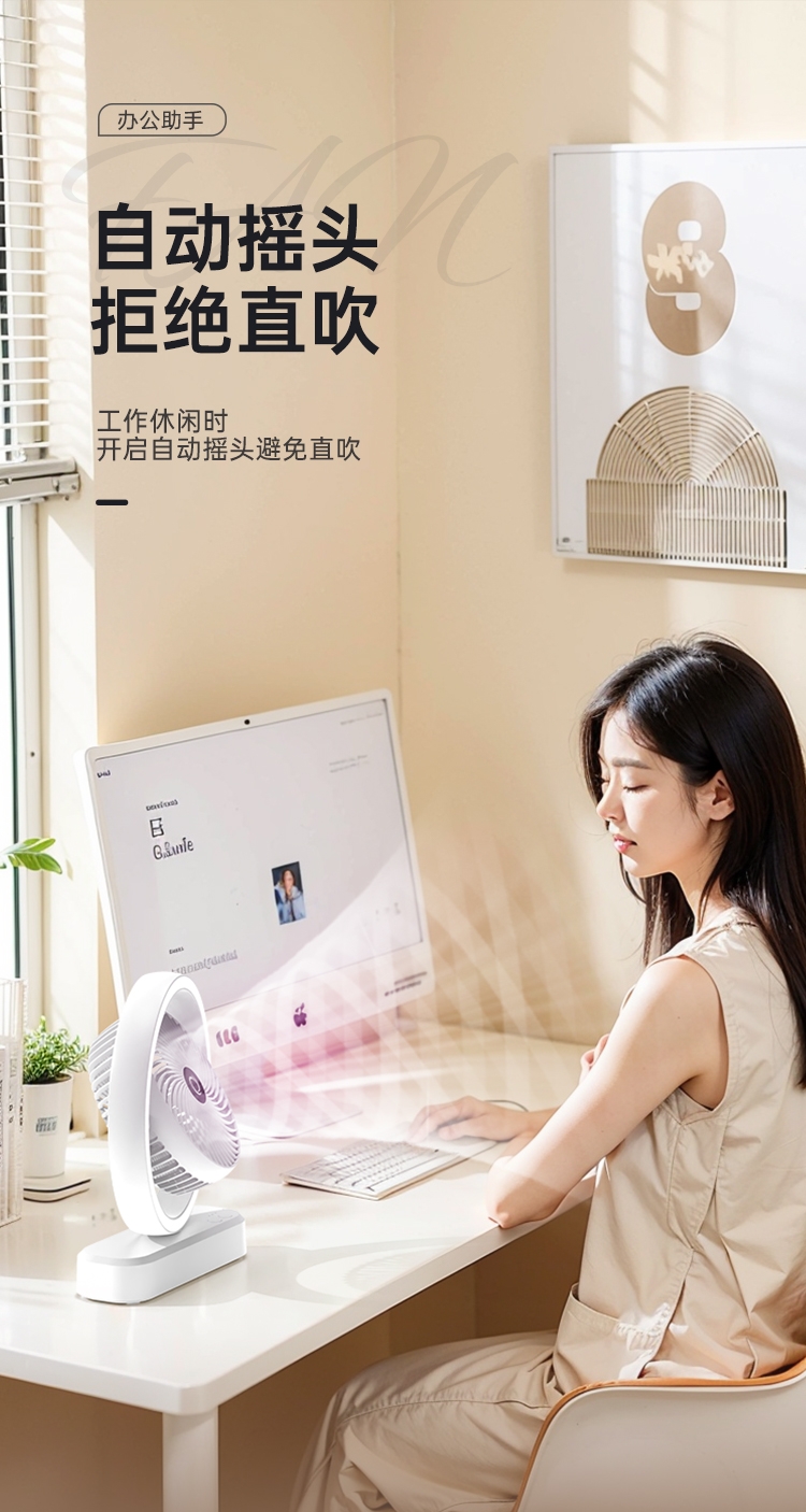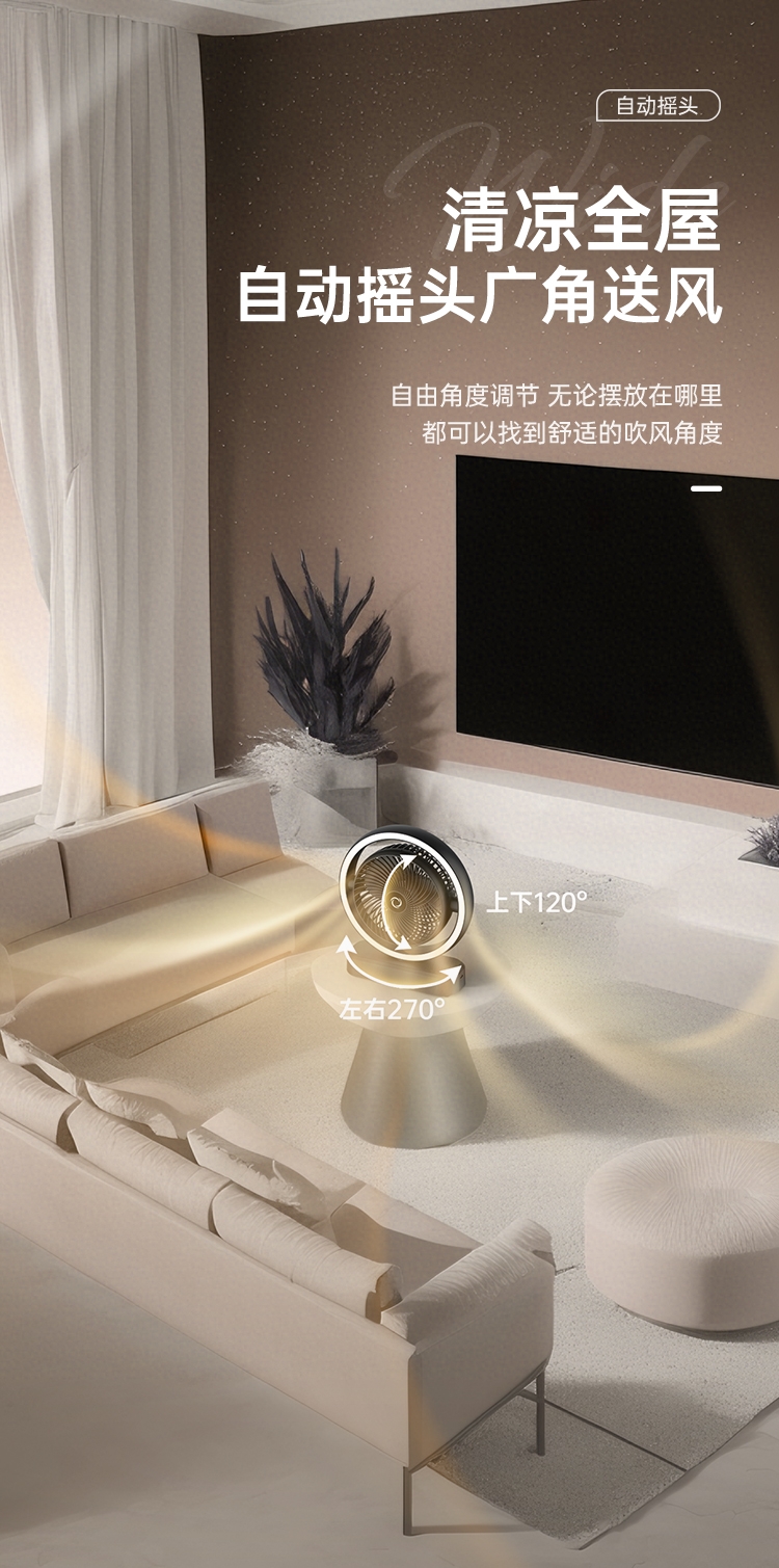 强劲电机,大风力送风;自动摇头,多角度调节;降温效果提升99%