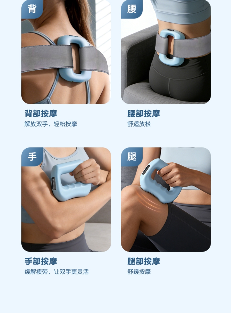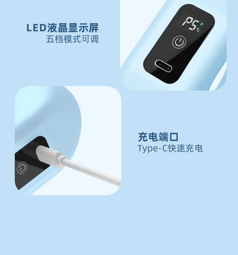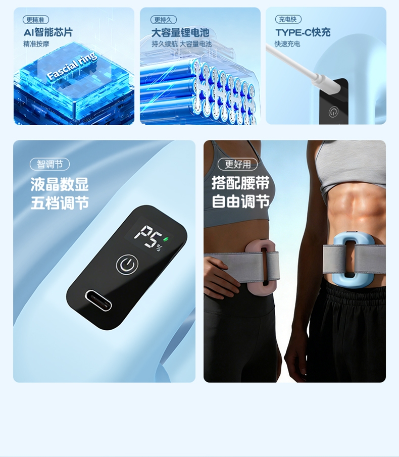 液晶数显,五档调节;大容量锂电池,持久续航 ;AI智能芯片,精准按摩