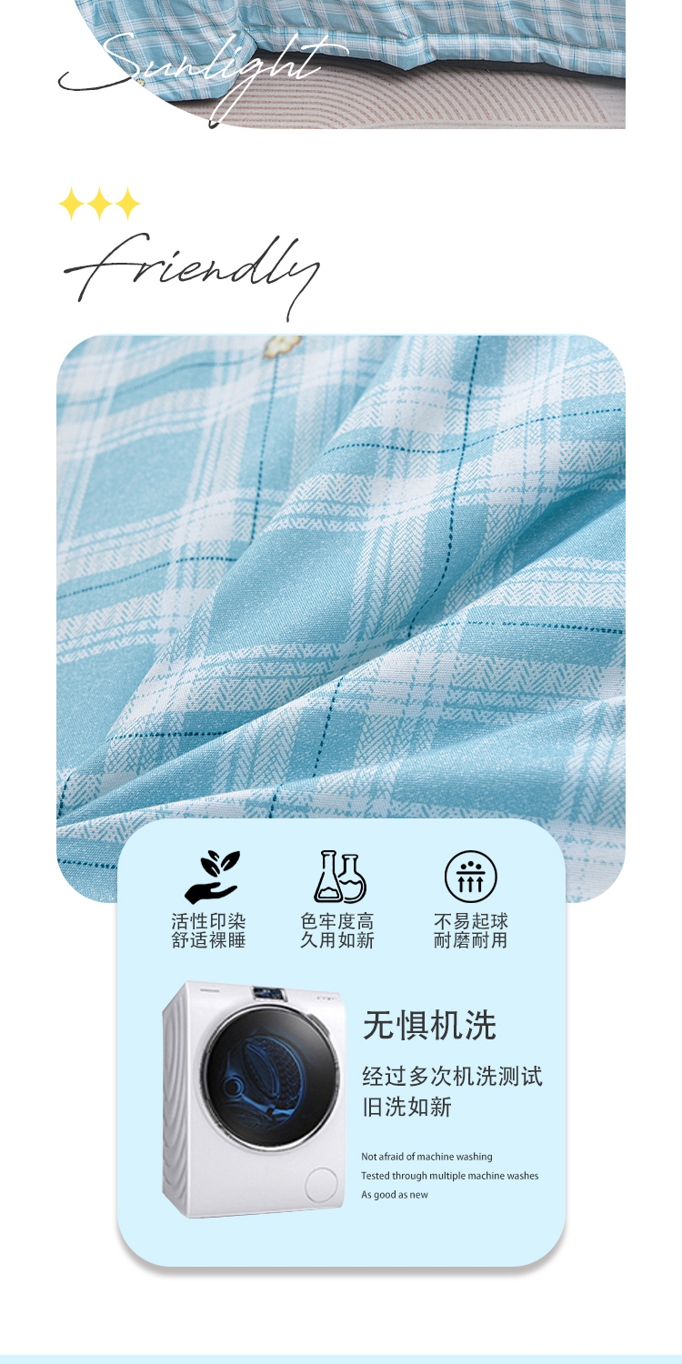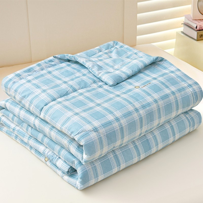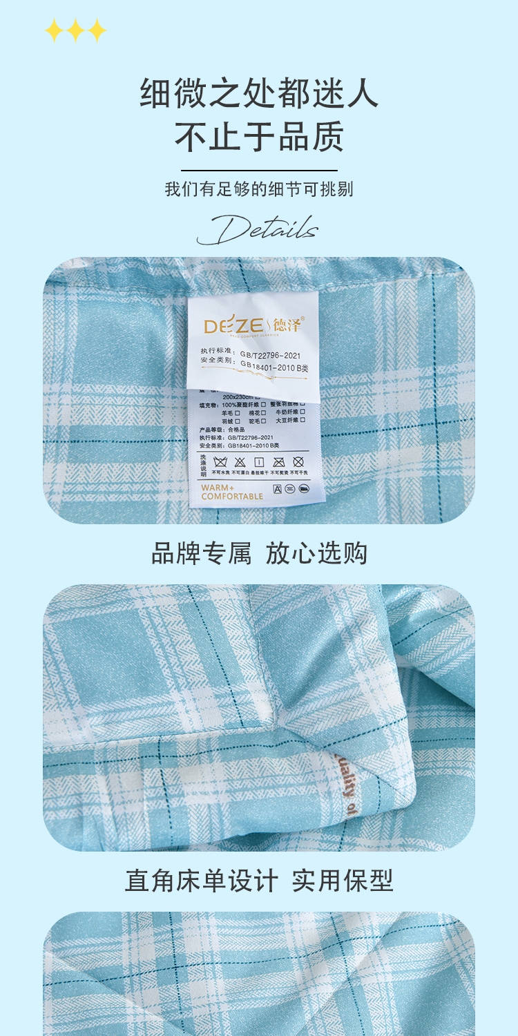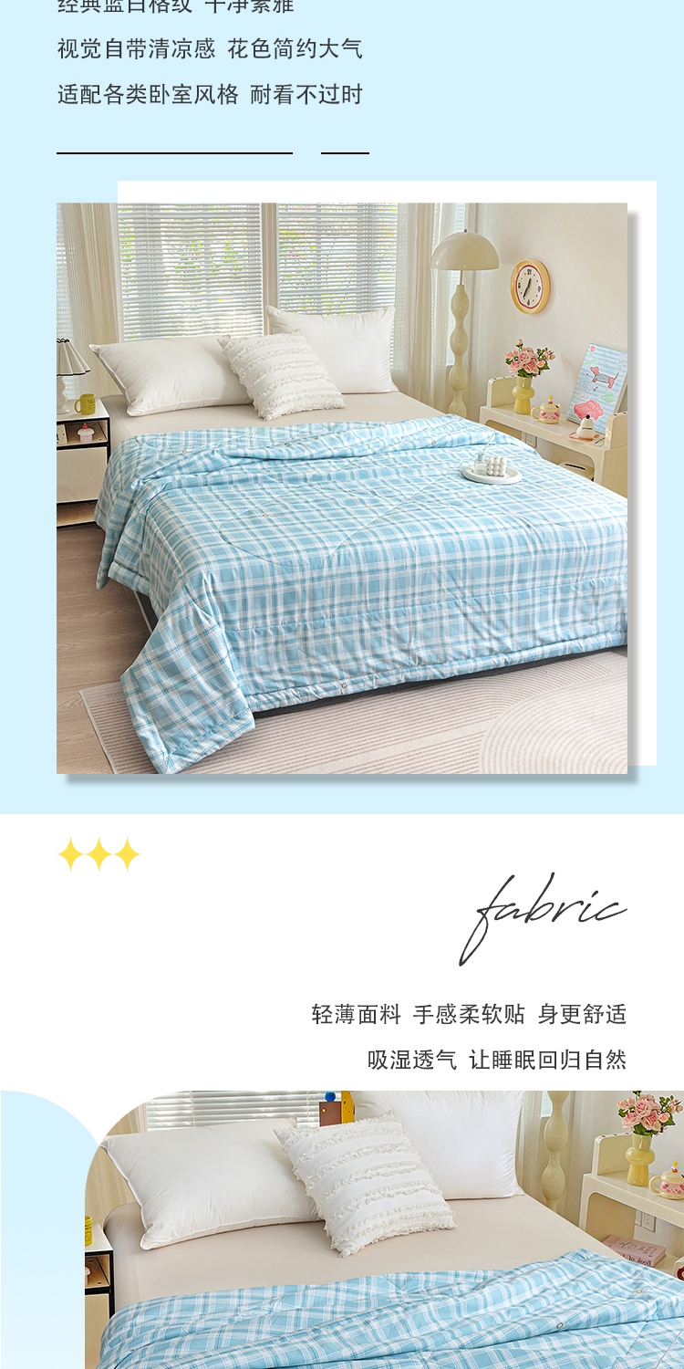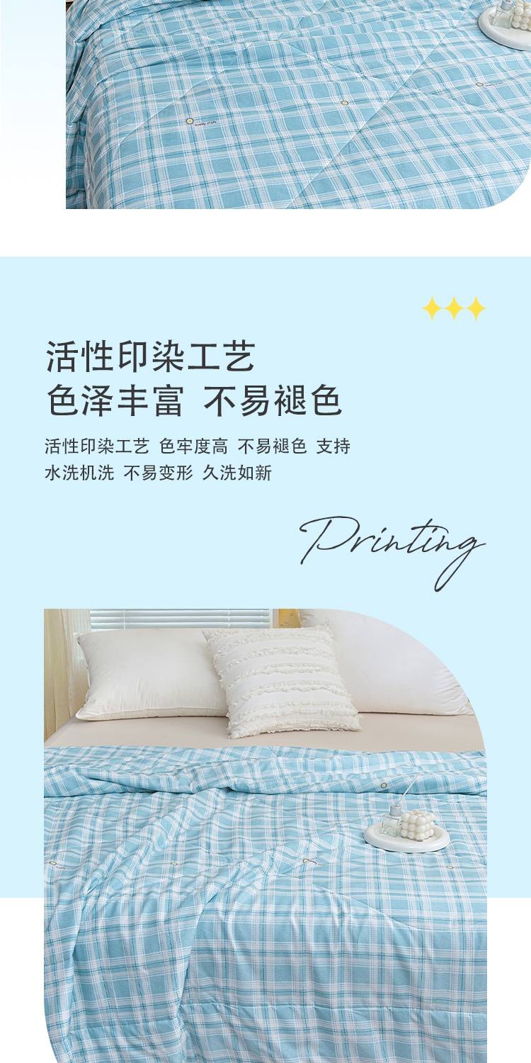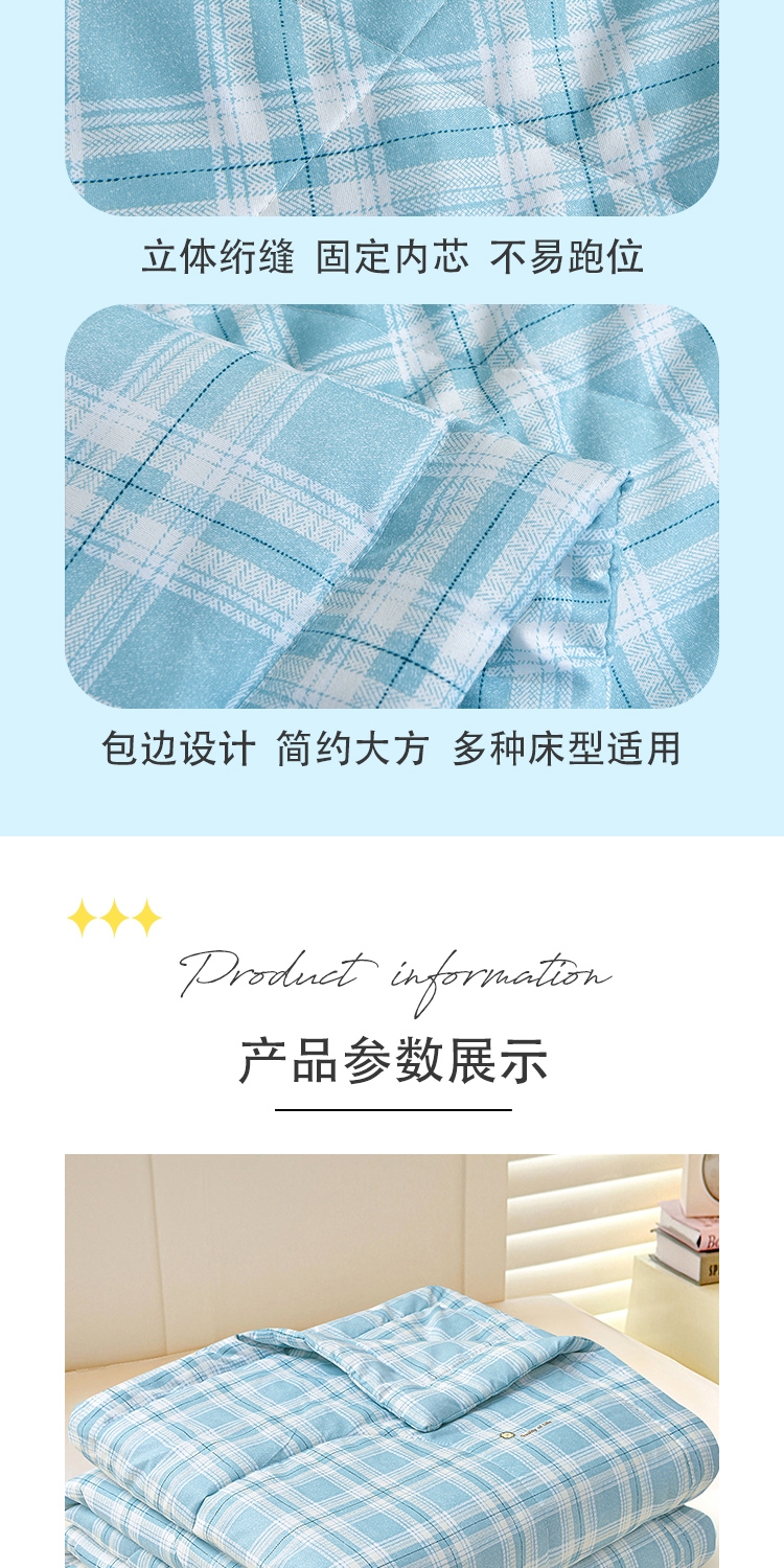 填充羽丝棉,轻压不闷,贴身舒适;透气不闷汗,吸湿散热,空调房使用干爽舒适。轻薄适中;格纹工整走线均匀,不易变形,不易跑棉,可机洗易打理
