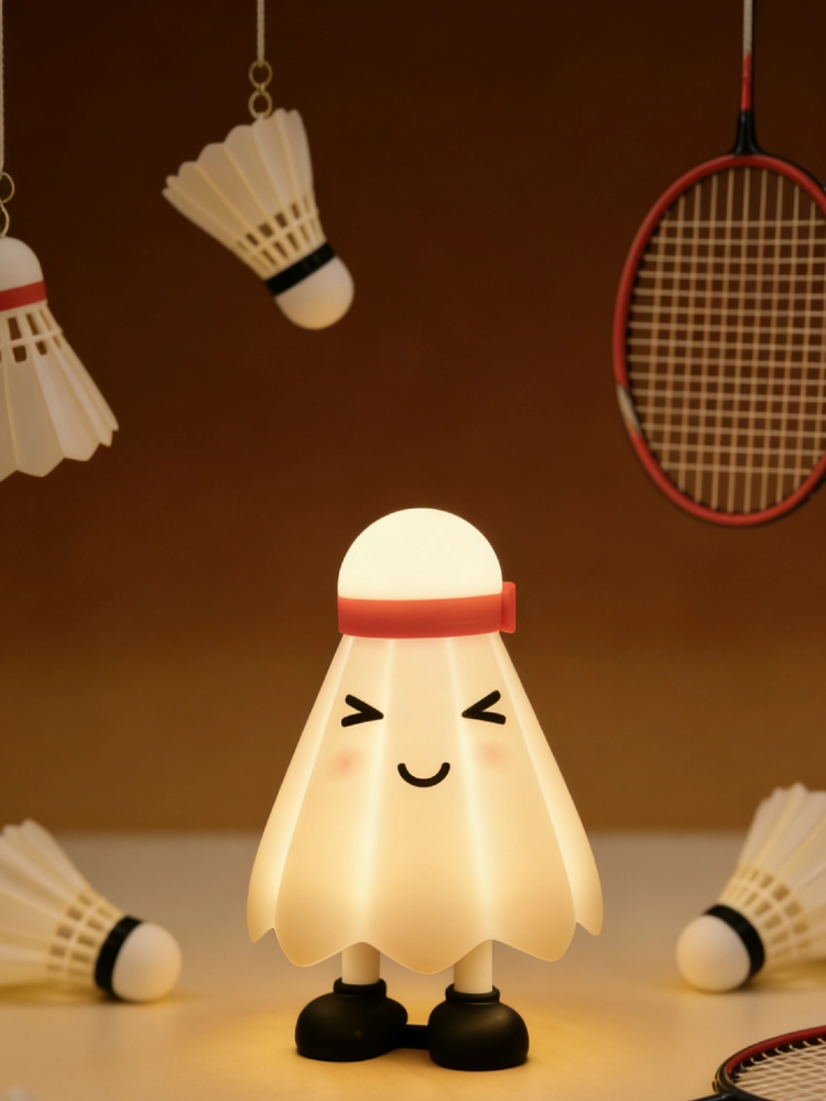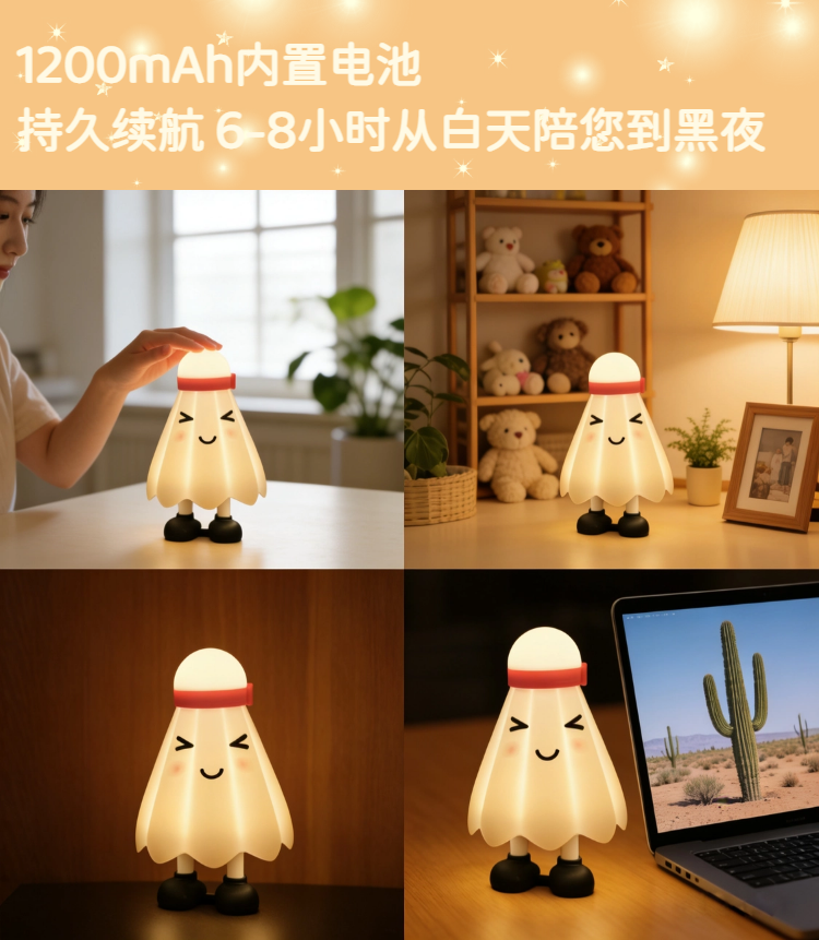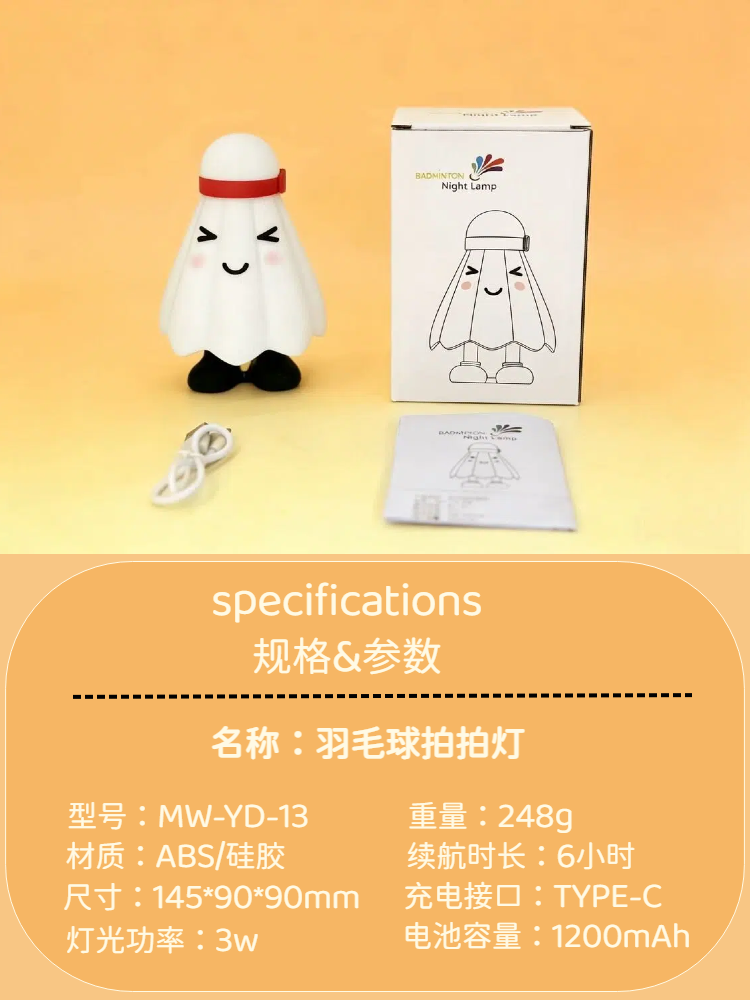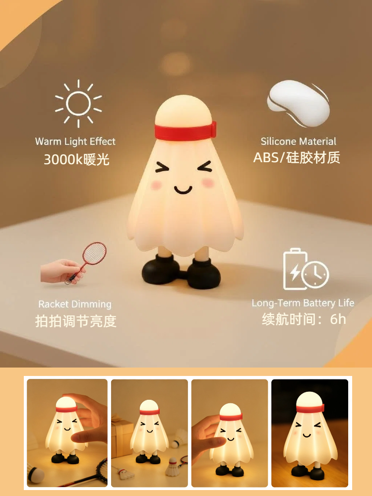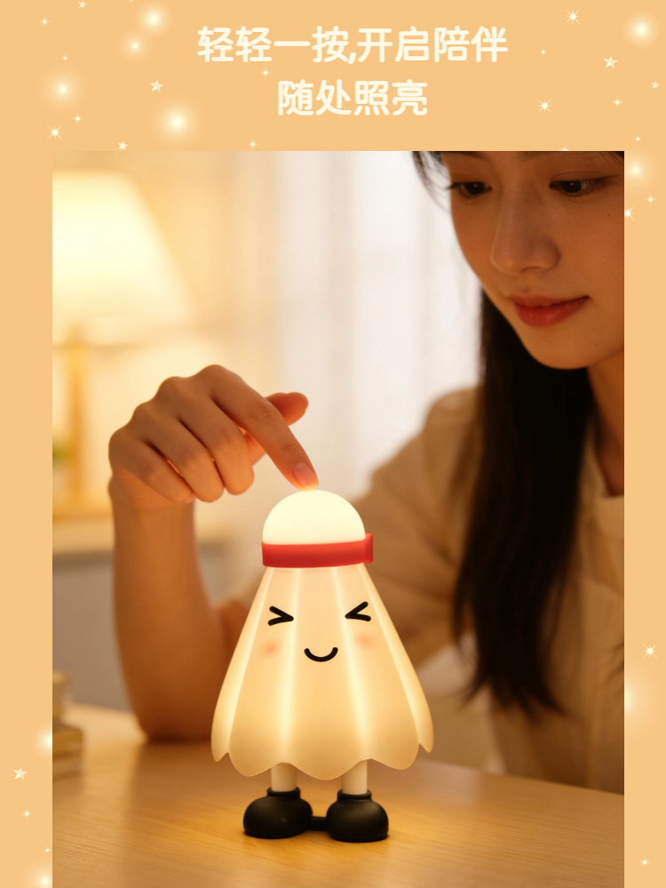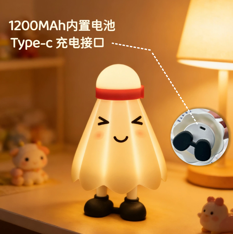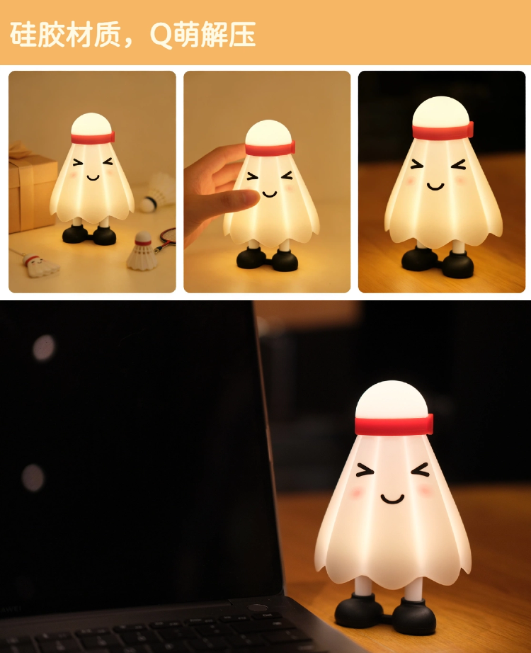 软萌羽毛球造型,治愈感拉满;柔光暖光,不刺眼更护眠;球拍调光,趣味互动玩法