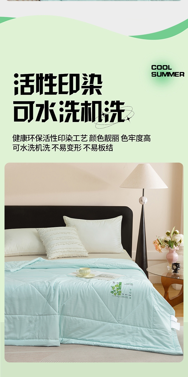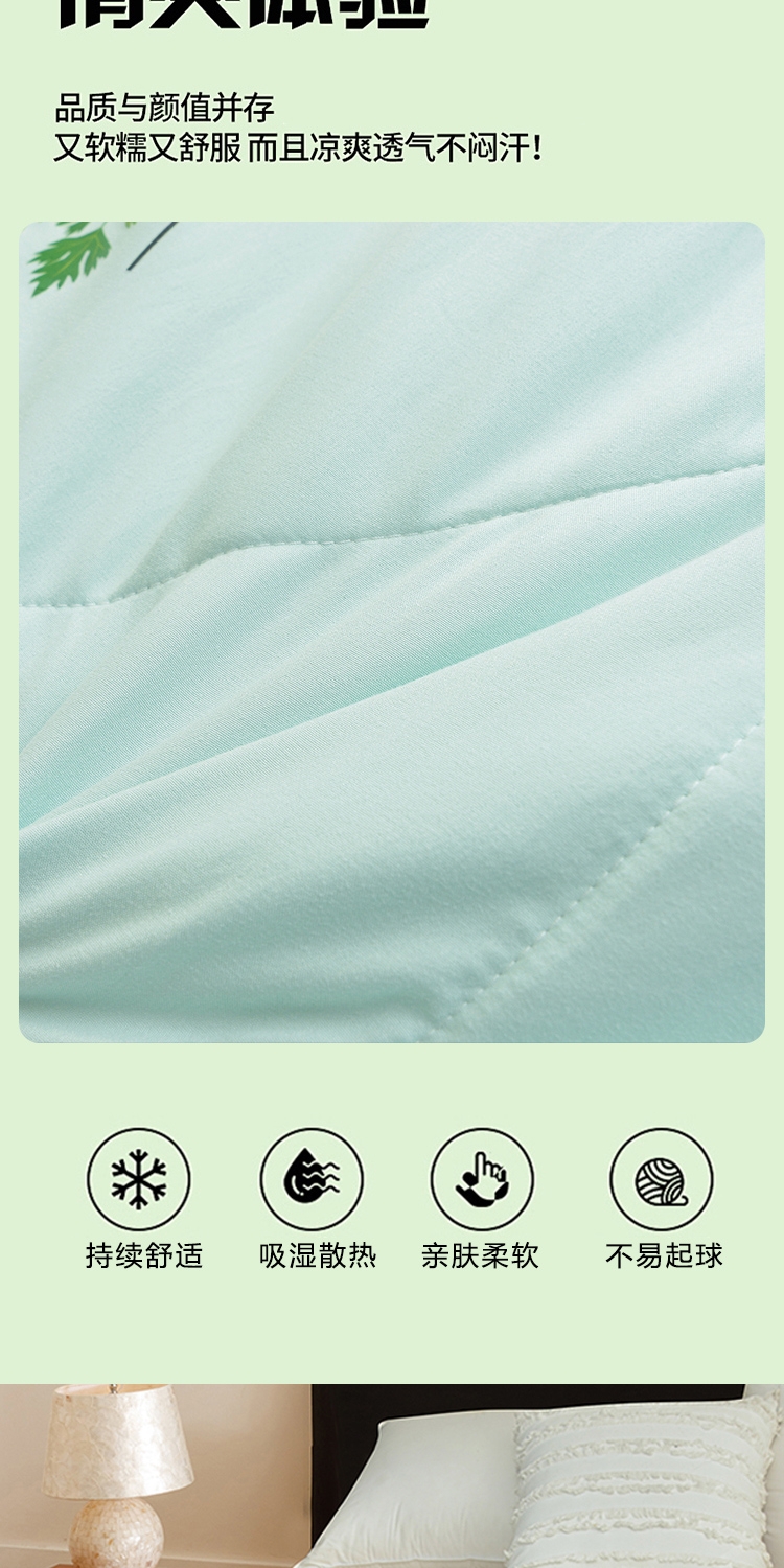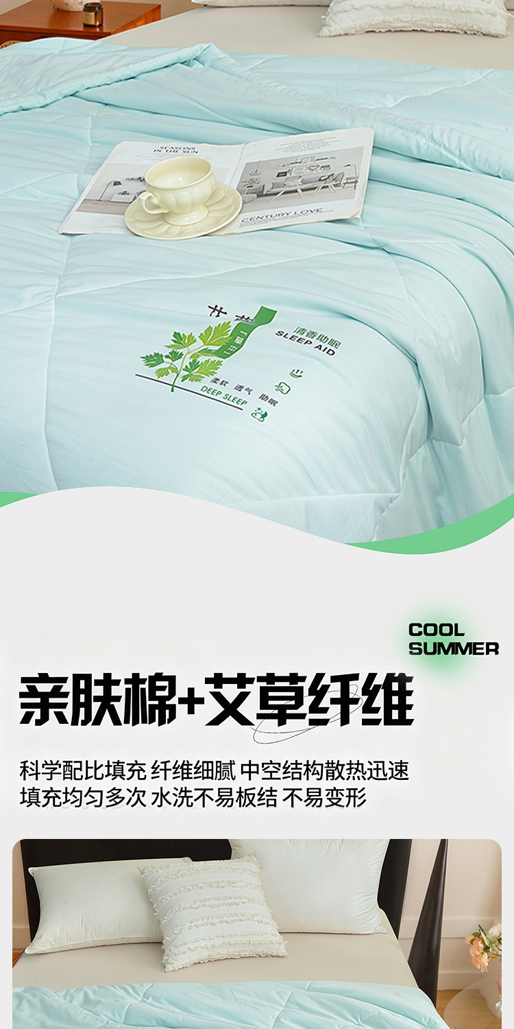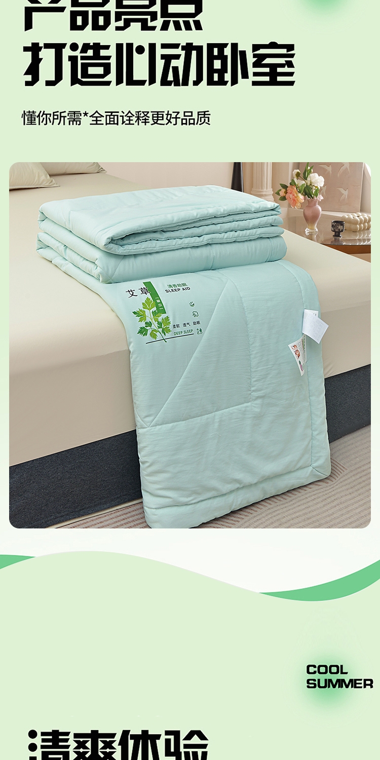 面料自然清新艾草味,舒缓放松,营造静谧睡眠环境。;自然绿色系,视觉清凉舒适。;面料柔软贴身,透气排汗,轻薄不压身,空调房干净舒爽