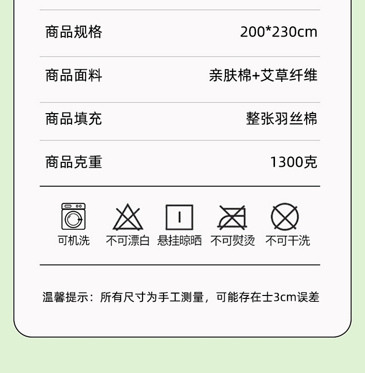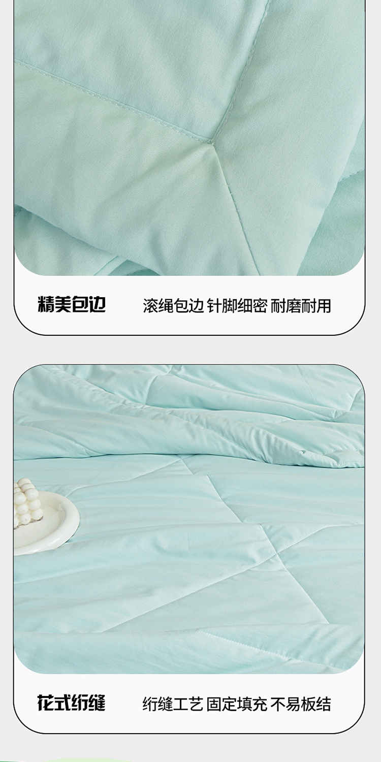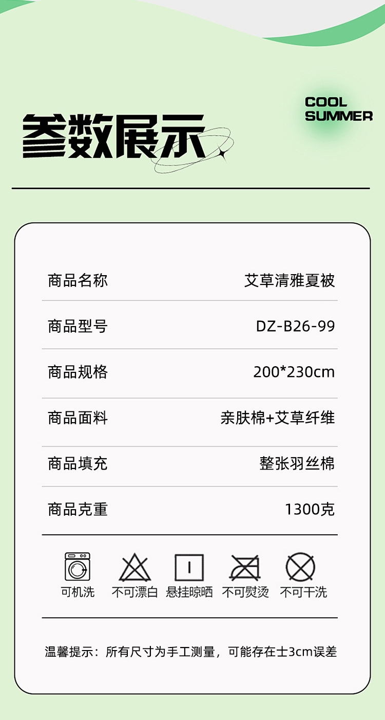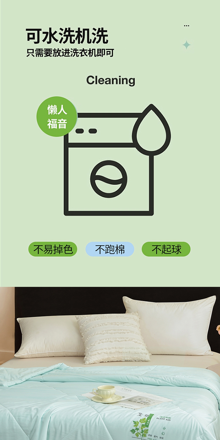 面料自然清新艾草味,舒缓放松,营造静谧睡眠环境。;自然绿色系,视觉清凉舒适。;面料柔软贴身,透气排汗,轻薄不压身,空调房干净舒爽