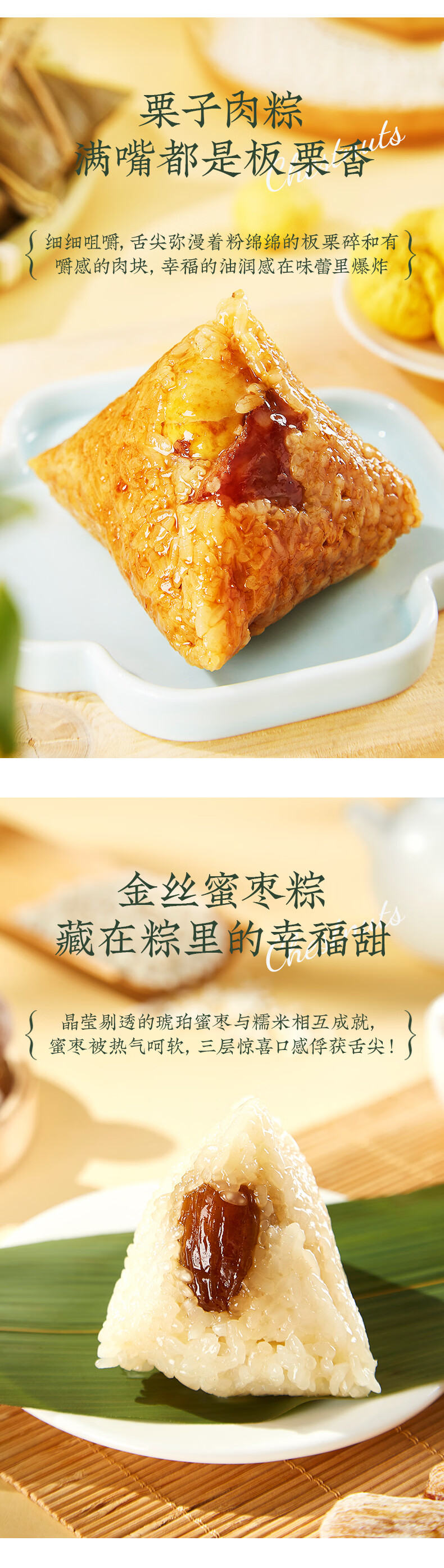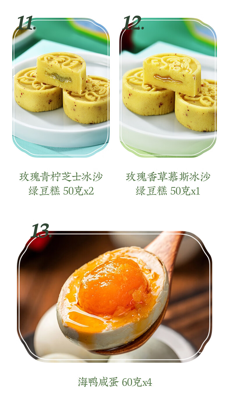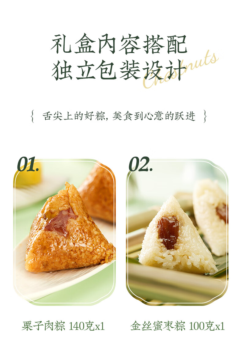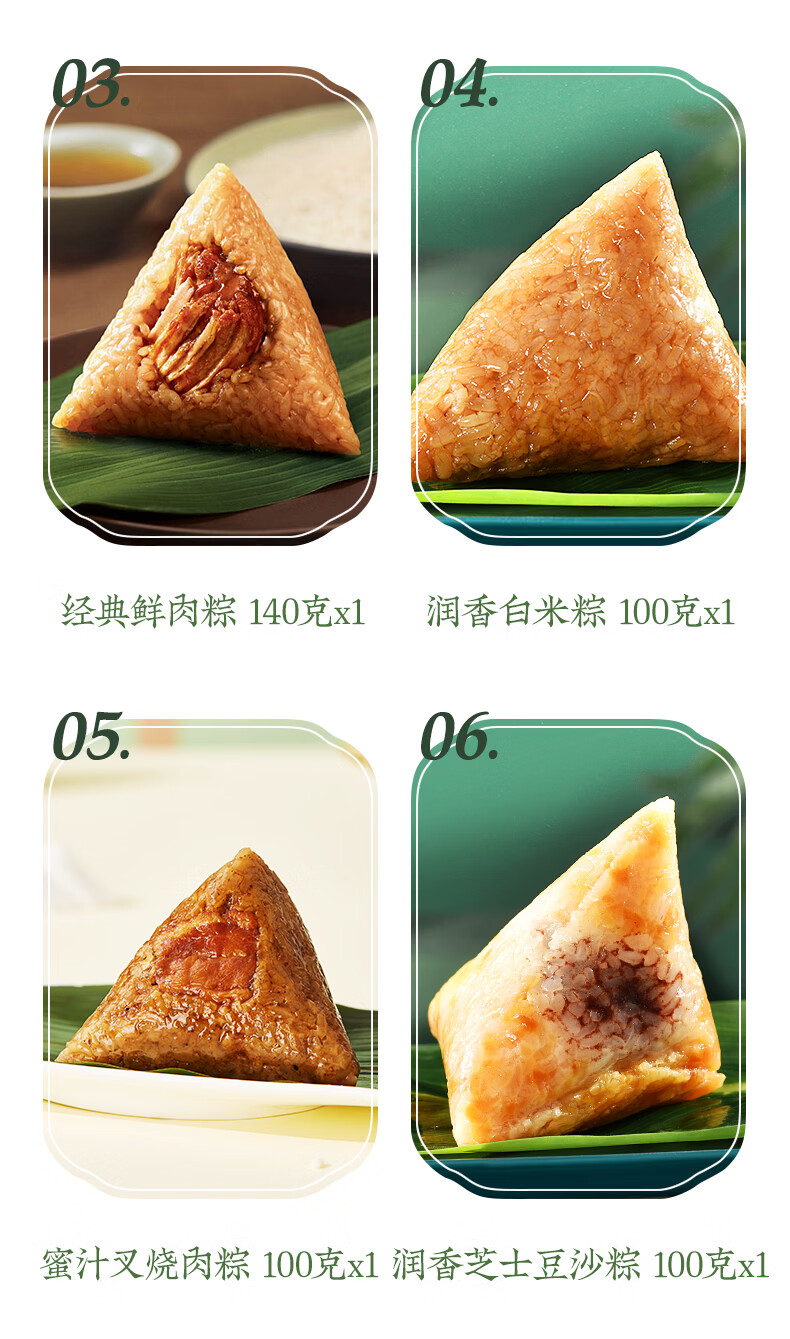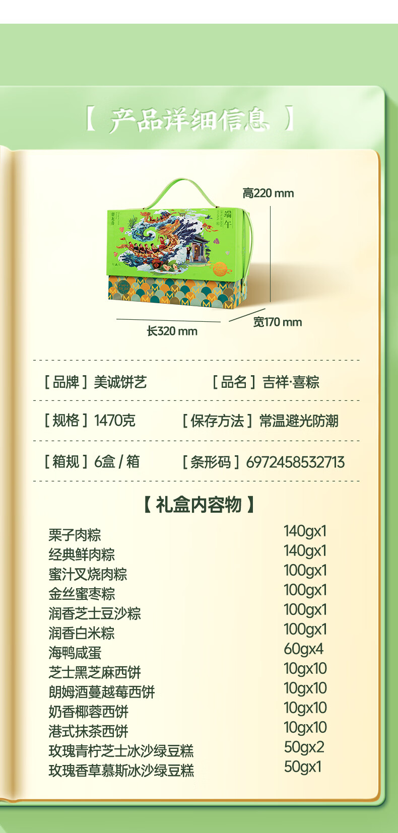 配置:栗子肉粽140gx1 经典鲜肉粽140gx1 蜜汁叉烧肉粽100gx1 金丝蜜枣粽100gx1 润香芝士豆沙粽100gx1 润香白米粽100gx1 海鸭咸蛋60gx4 芝士黑芝麻西饼10gx10 朗姆酒蔓越莓西饼10gx10 奶香椰蓉西饼10gx10 港式抹茶西饼10gx10 玫瑰青柠芝士冰沙绿豆糕50gx2 玫瑰香草慕斯冰沙绿豆糕50gx1