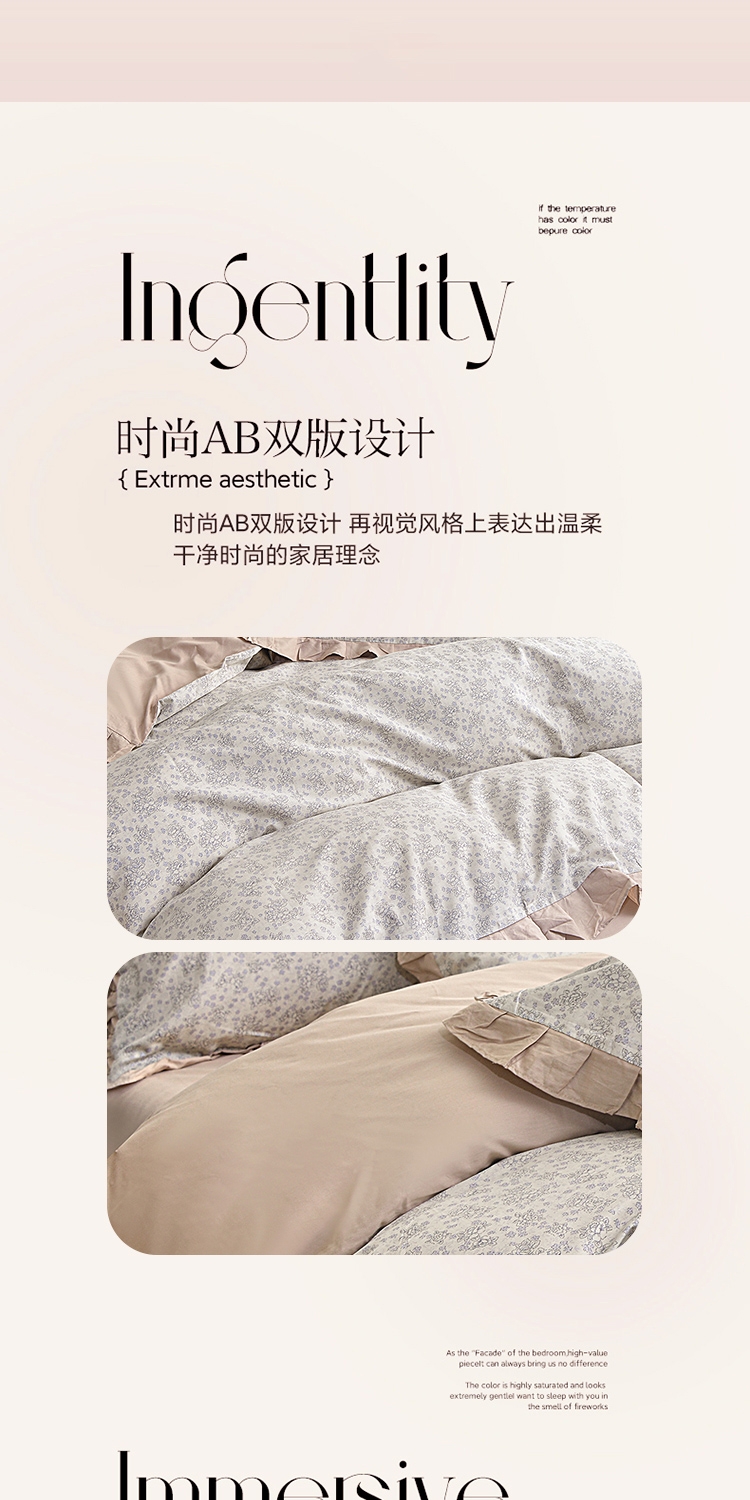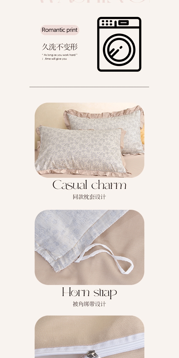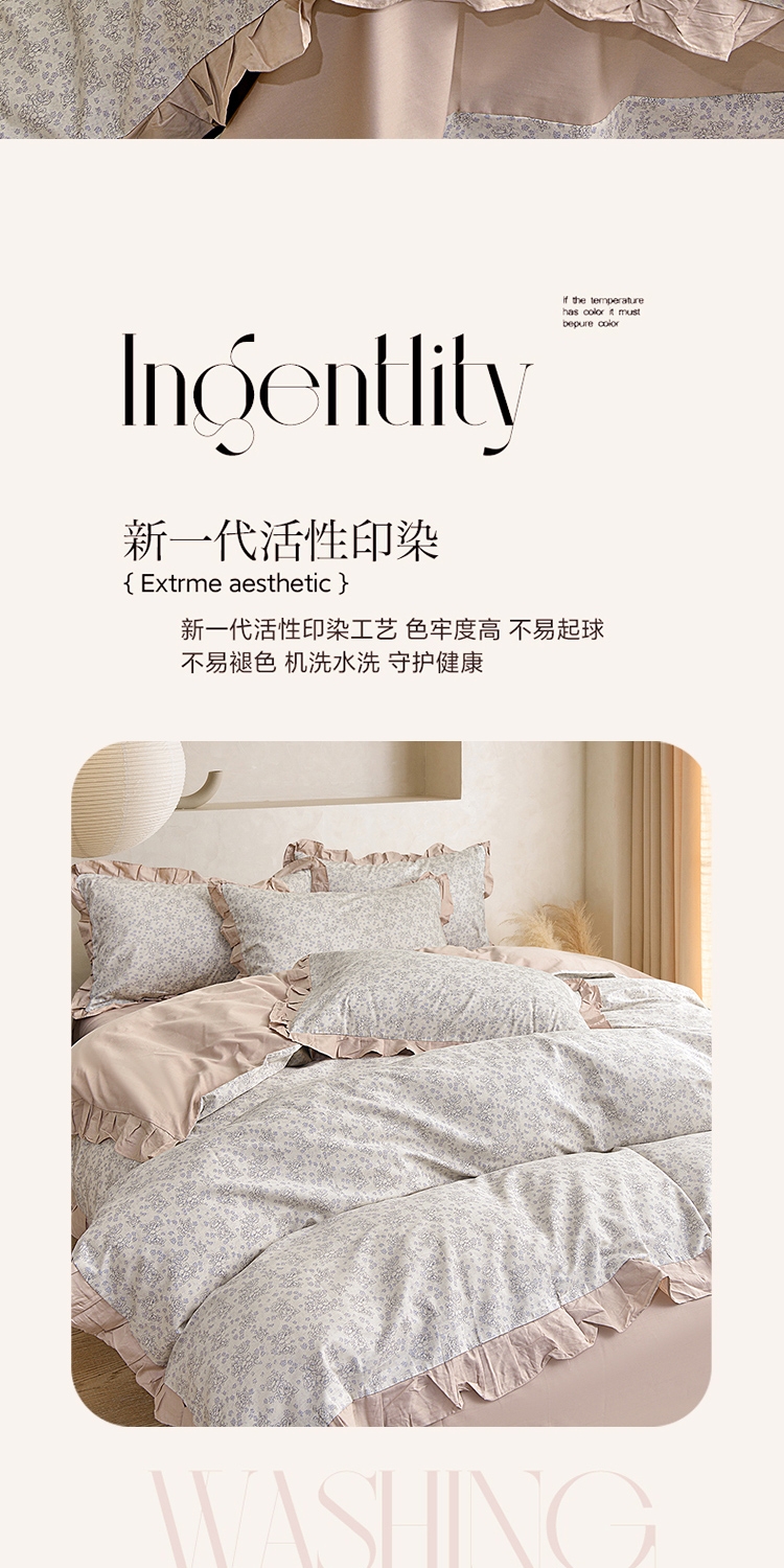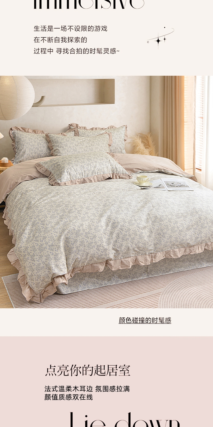 喷气织造纯棉,软滑亲肤,久用不起球不变形;法式温柔木耳边,氛围感拉满,颜值质感双在线。;环保无异味,活性印染不褪色。
