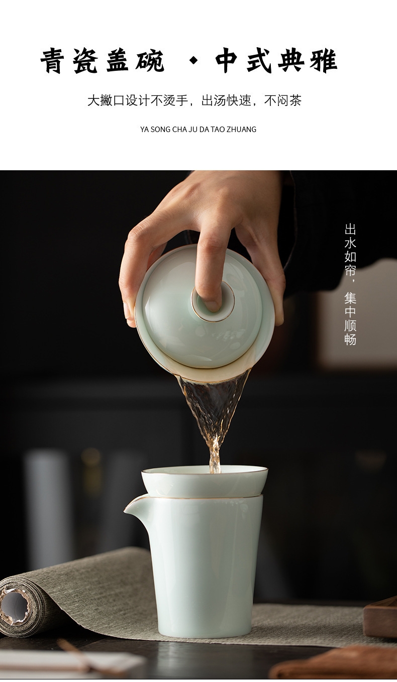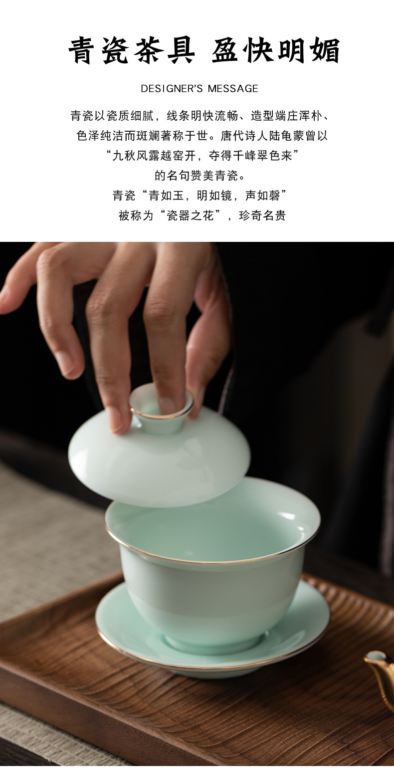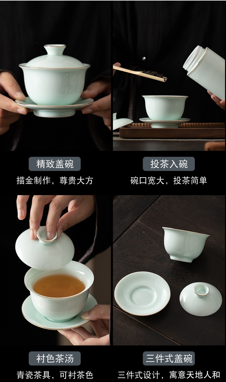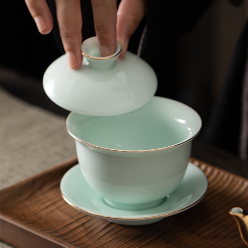 高端15头青山玉盖碗描金茶具