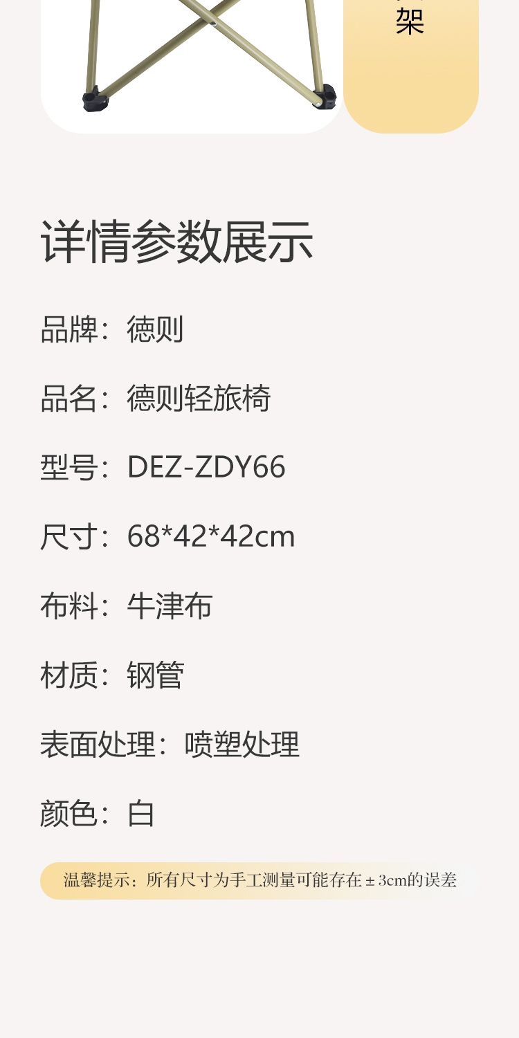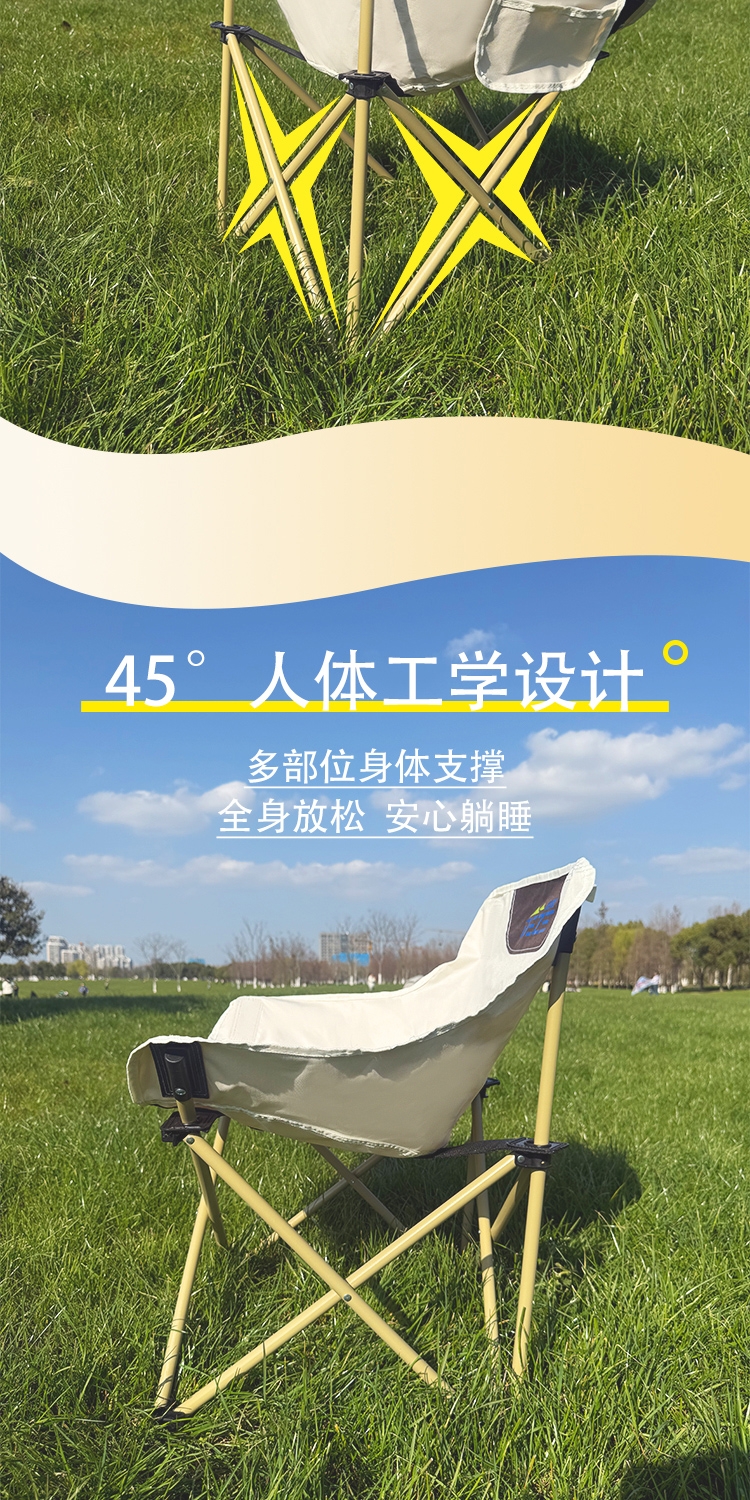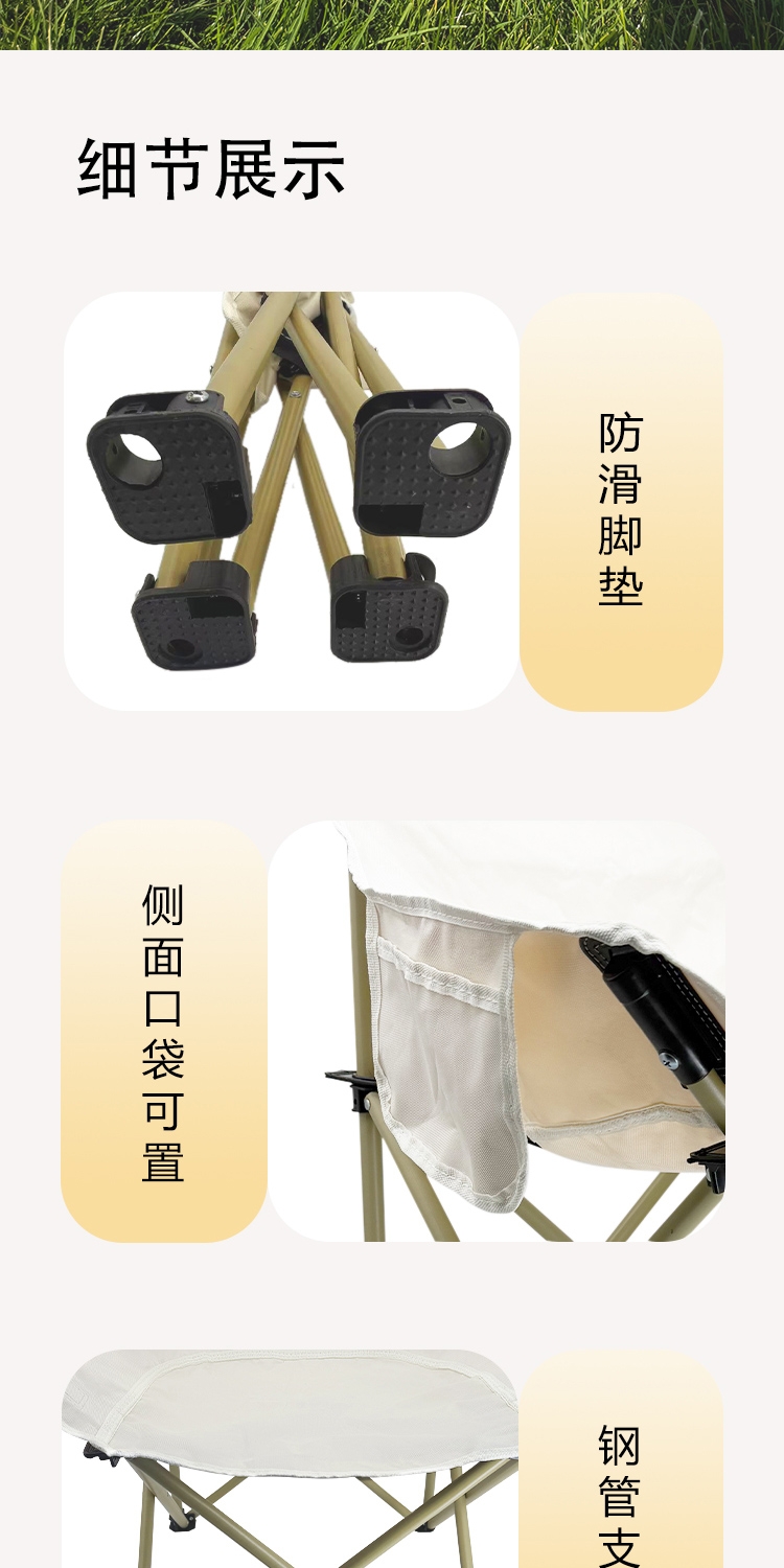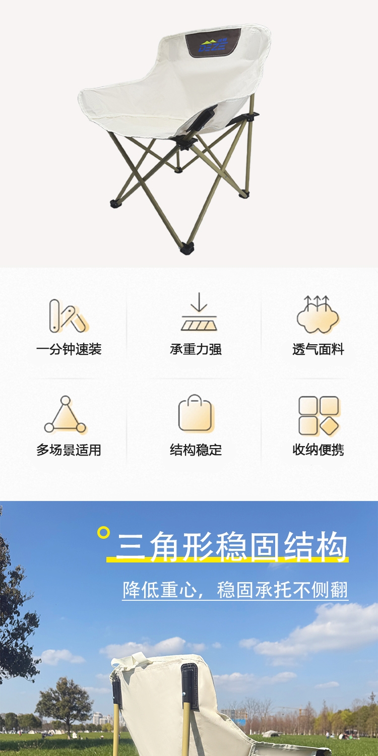 加厚牛津布耐磨,透气,抗撕拉;椅子完美承托人体背部,极大提高舒适度;配有手提收纳袋,单手可提;快速收纳,不占空间,轻量便携,出游无负担;
