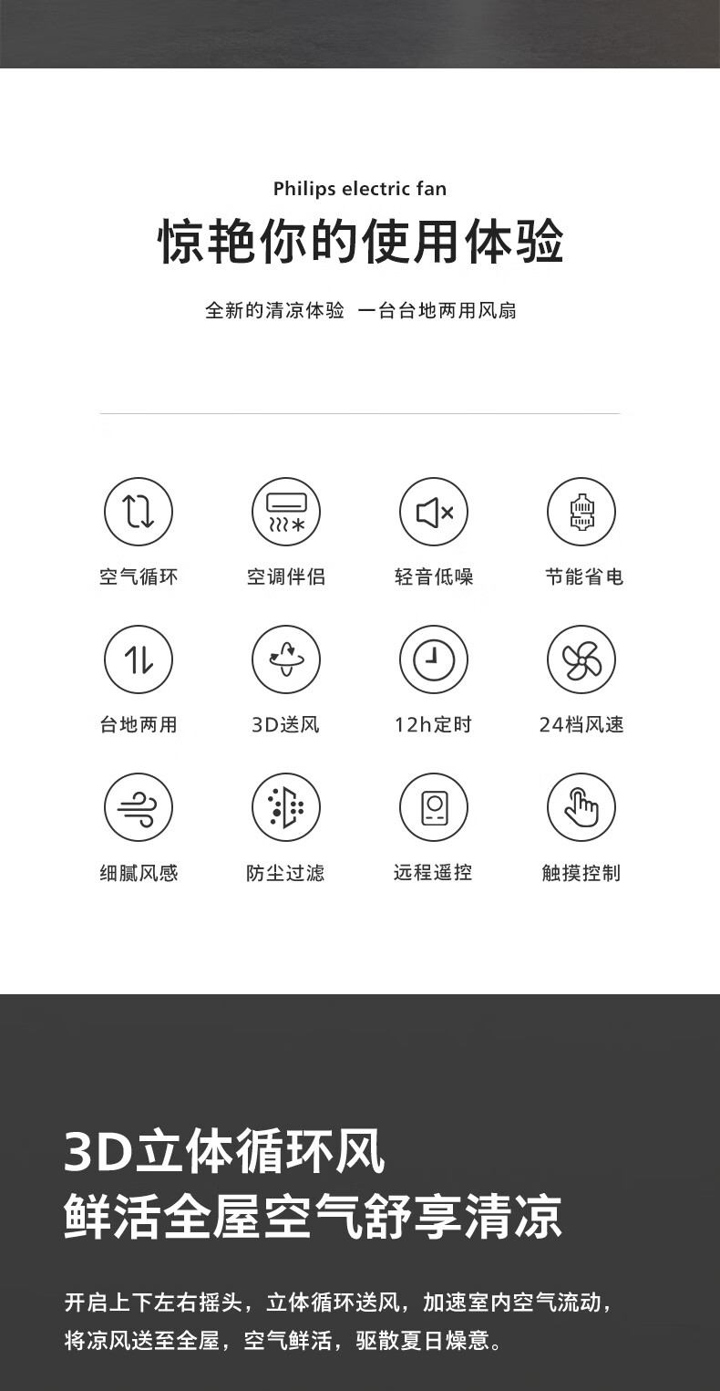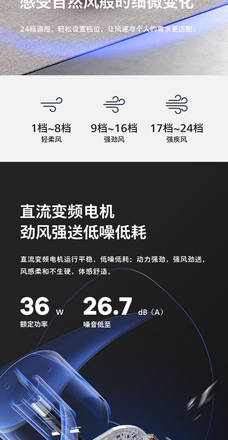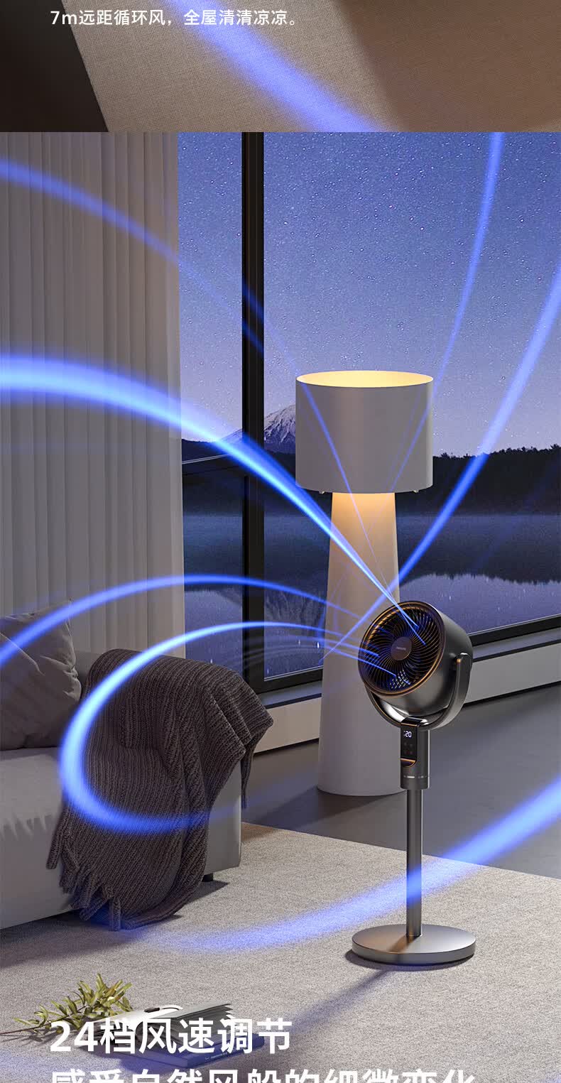 直流变频 轻音低噪音;自动摇头风大智能遥控;空气循环 台地两用