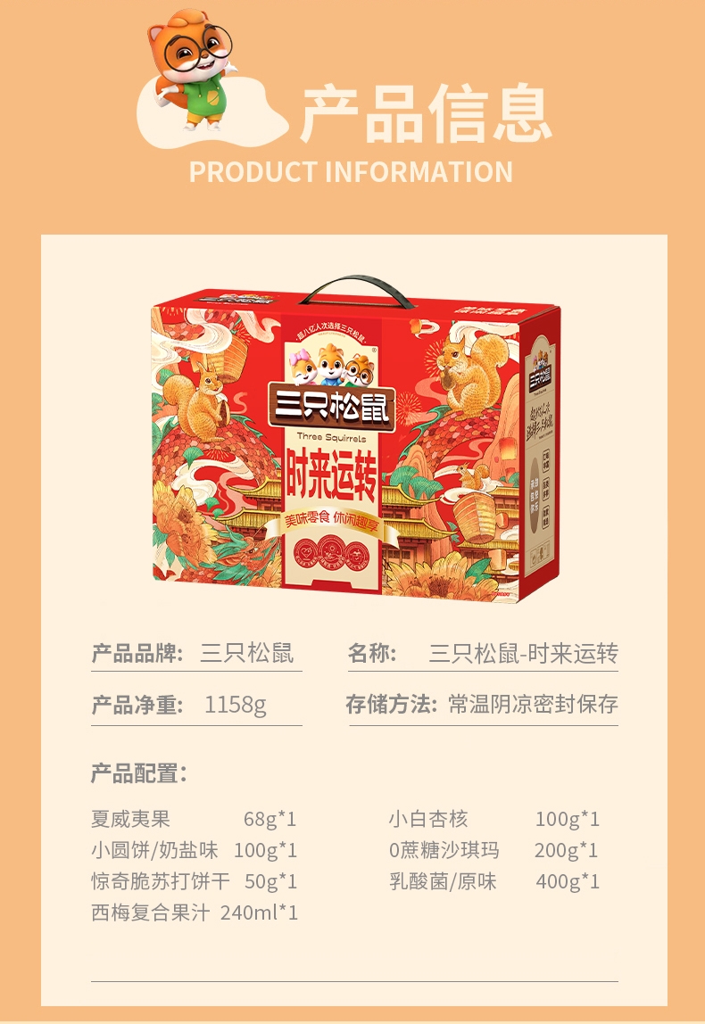 配置清单:三只松鼠-夏威夷果68g 三只松鼠-小白杏核100g 三只松鼠-小圆饼/奶盐味/100g 三只松鼠-0蔗糖沙琪玛200g 三只松鼠-惊奇脆苏打饼干50g 三只松鼠-乳酸菌/原味/400g 三只松鼠-西梅复合果汁240ml
