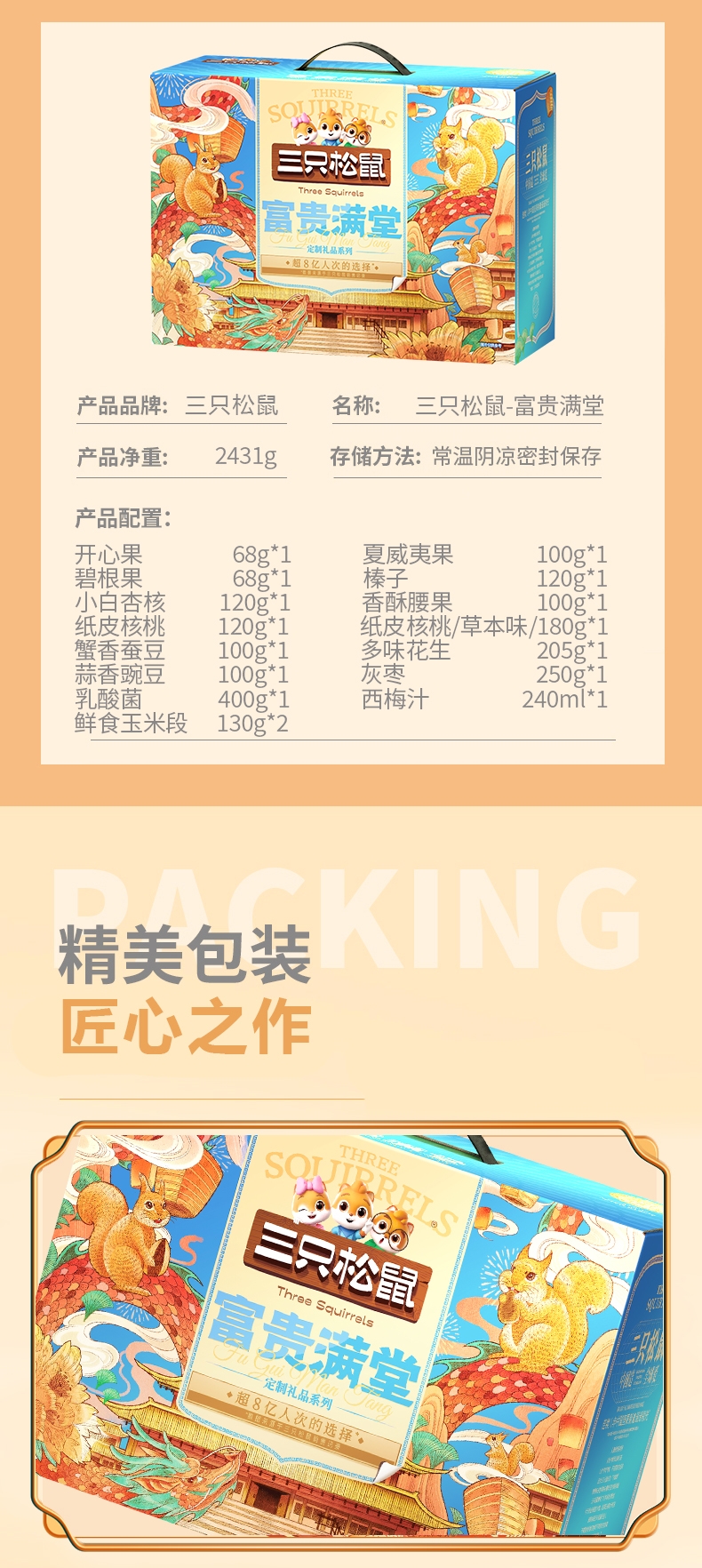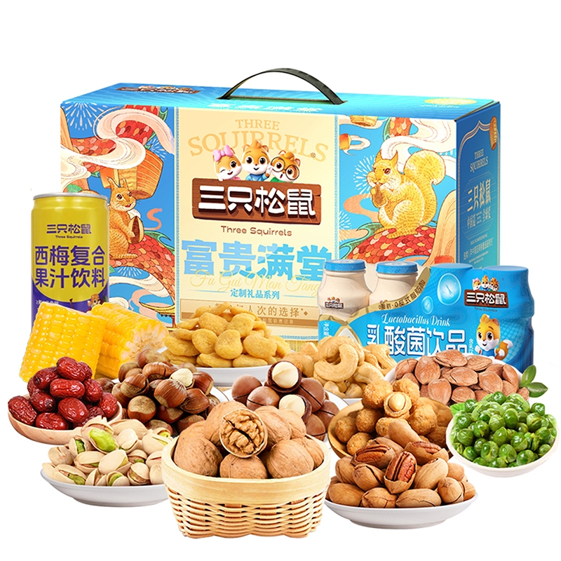 配置清单:三只松鼠-开心果68g 三只松鼠-夏威夷果100g 三只松鼠-碧根果68g 三只松鼠-榛子120g 三只松鼠-小白杏核120g 三只松鼠-香酥腰果100g 三只松鼠-纸皮核桃120g 三只松鼠-纸皮核桃/草本味/180g 三只松鼠-蟹香蚕豆100g 三只松鼠-多味花生205g 三只松鼠-蒜香豌豆100g 三只松鼠-灰枣250g 三只松鼠-乳酸菌400g 三只松鼠-西梅汁240ml 三只松鼠-鲜食玉米段130g*2