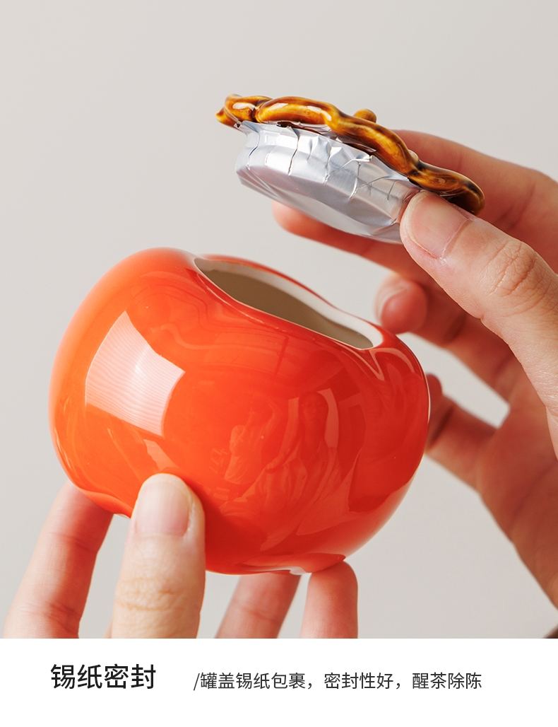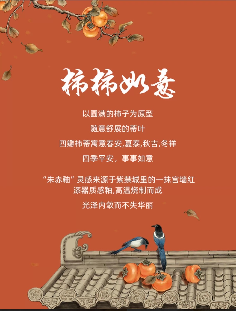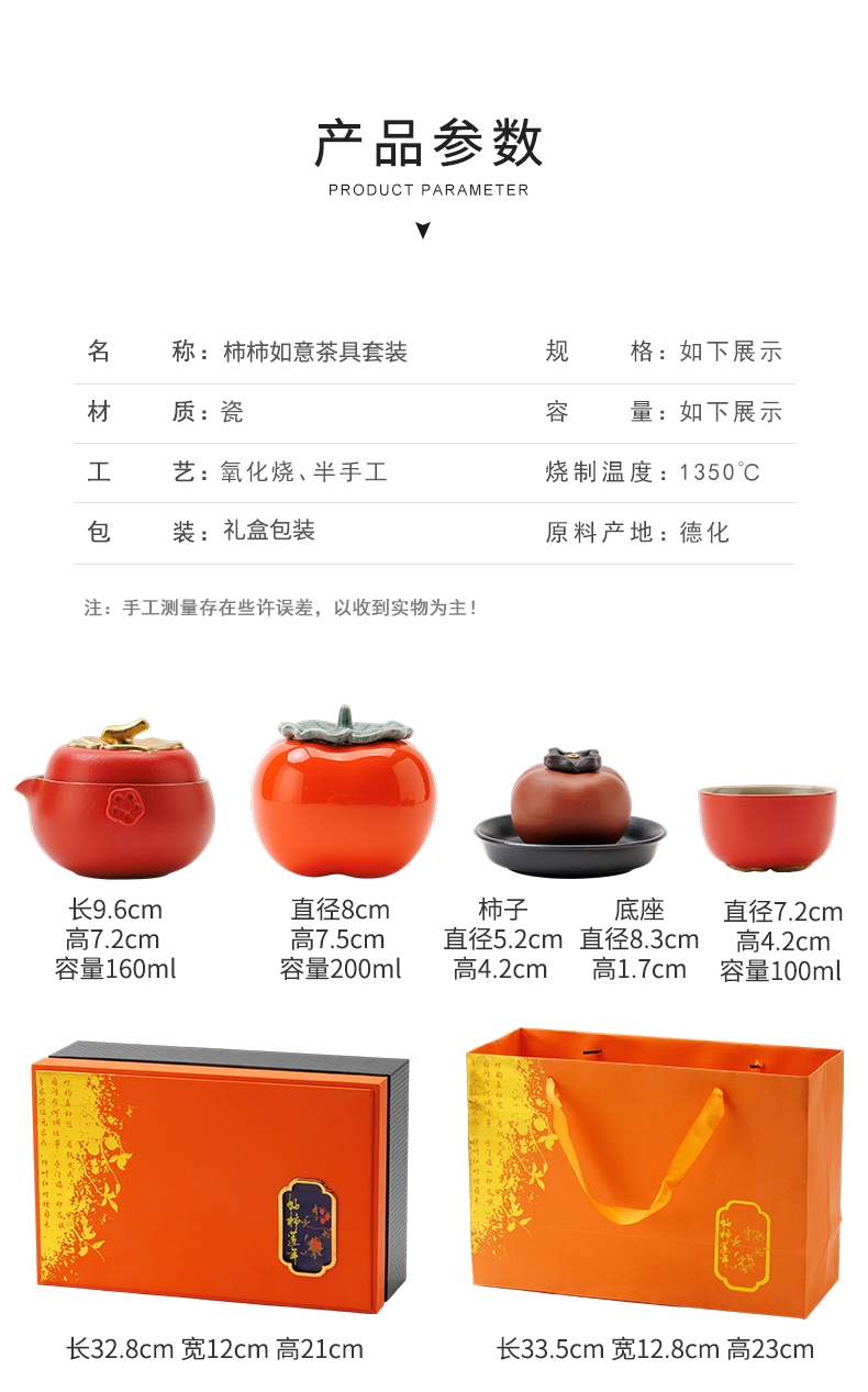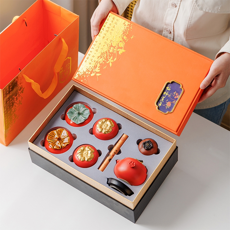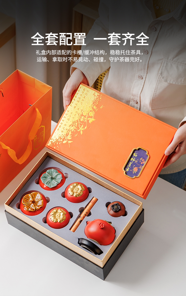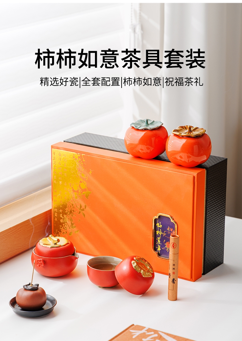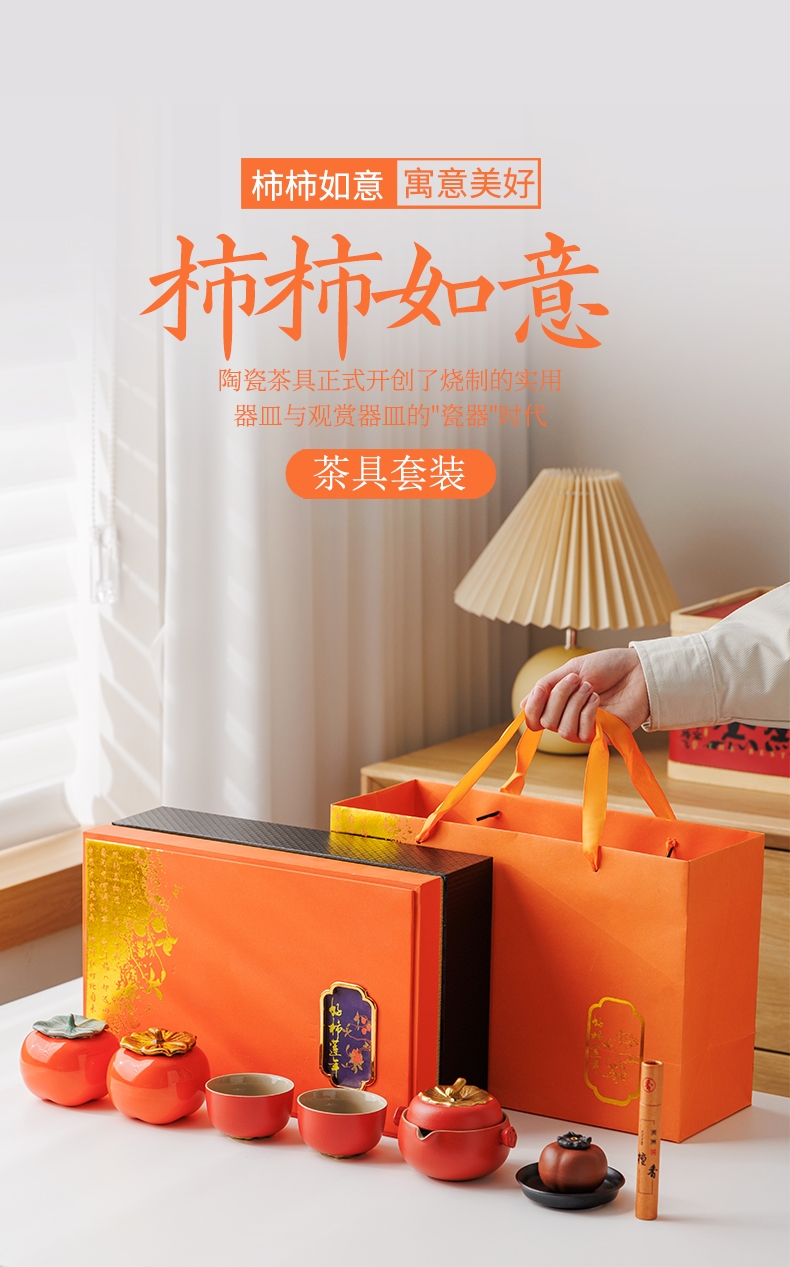柿柿如意谐音事事如意套装名称和柿子造型蕴含着吉祥;茶具整体设计成柿子的形状,形态逼真可爱;配橙色的礼盒和手提袋,礼盒上有金色花纹和装饰牌点缀