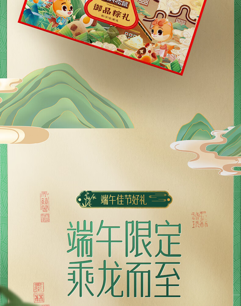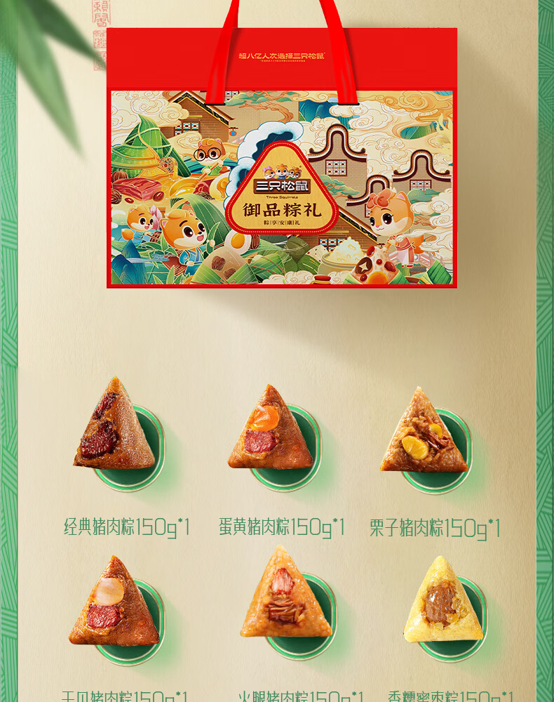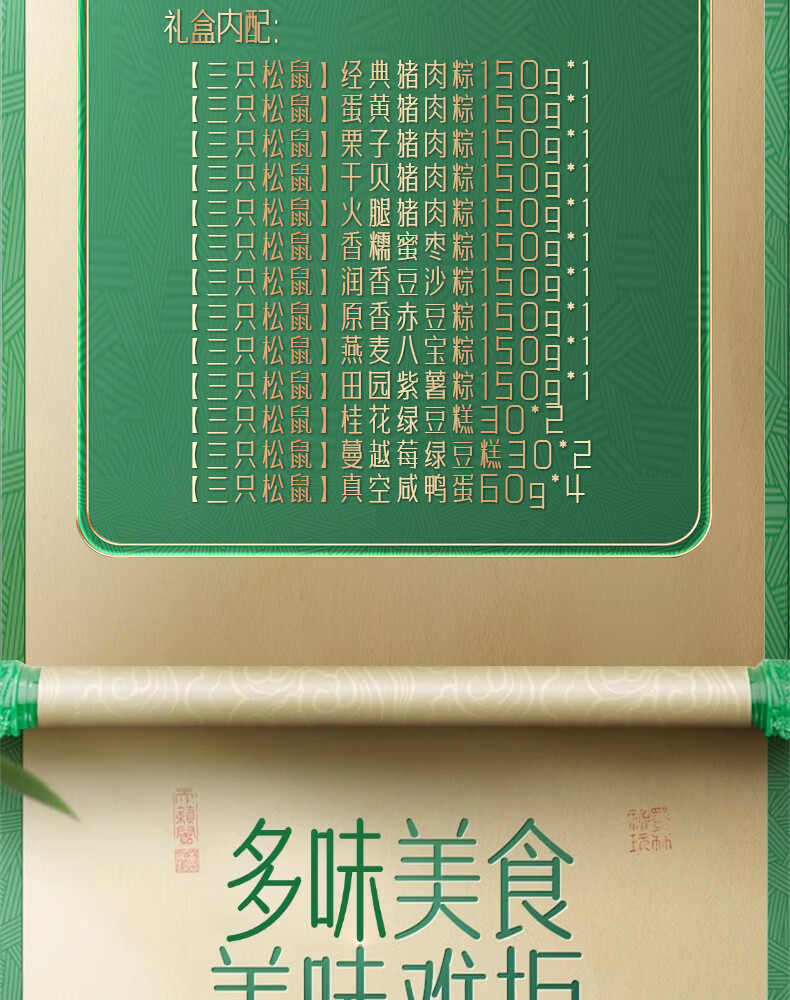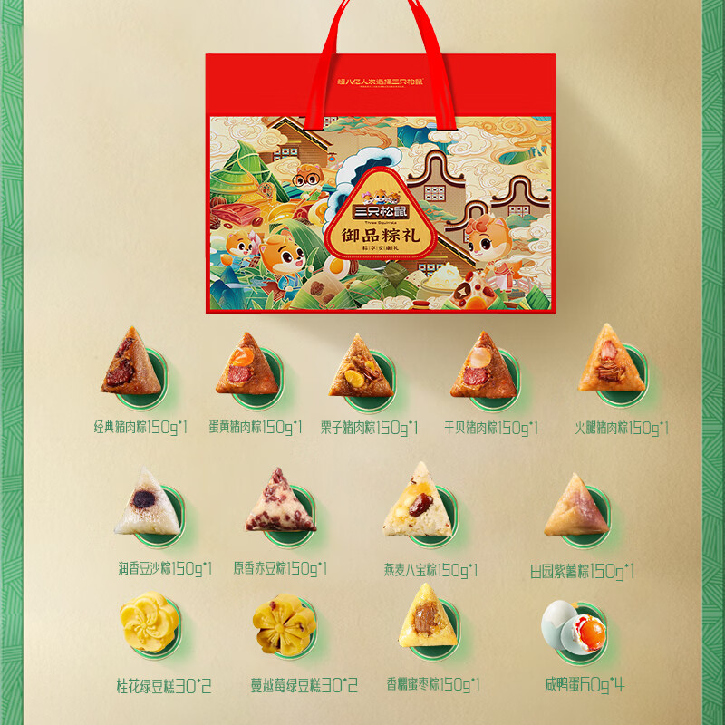 配置:【三只松鼠】经典猪肉粽 150g*1 【三只松鼠】蛋黄猪肉粽 150g*1 【三只松鼠】栗子猪肉粽 150g*1 【三只松鼠】干贝猪肉粽 150g*1 【三只松鼠】火腿猪肉粽 150g*1 【三只松鼠】香糯蜜枣粽 150g*1 【三只松鼠】润香豆沙粽 150g*1 【三只松鼠】原香赤豆粽 150g*1 【三只松鼠】燕麦八宝粽 150g*1 【三只松鼠】田园紫薯粽 150g*1 【三只松鼠】桂花绿豆糕 30*2 【三只松鼠】蔓越莓绿豆糕 30*2 【三只松鼠】真空咸鸭蛋 60g*4
