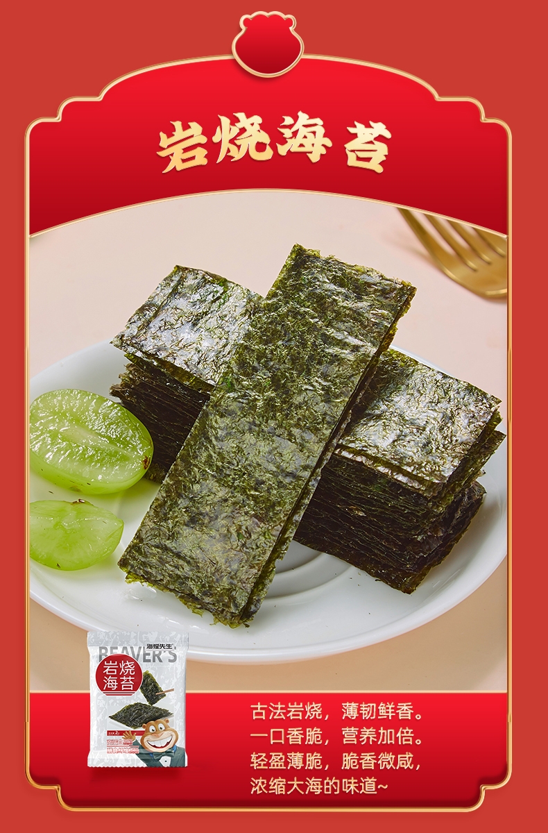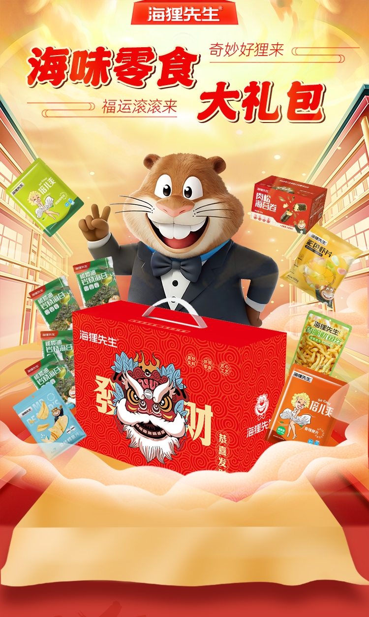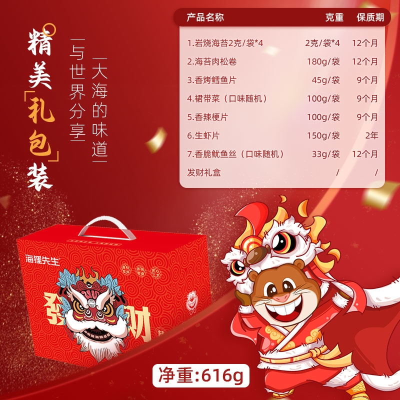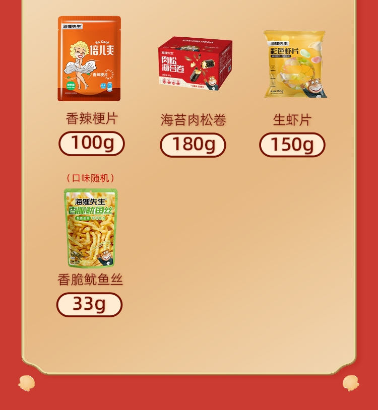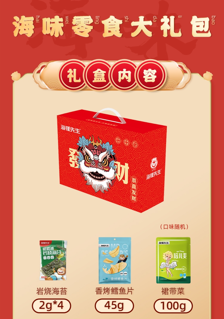 配置清单:岩烧海苔2克/袋*4 海苔肉松卷180g 香烤鳕鱼片45g 裙带菜100g/袋(口味随机) 香辣梗片100g/袋 生虾片150g/袋 香脆鱿鱼丝33g(口味随机) 发财礼盒