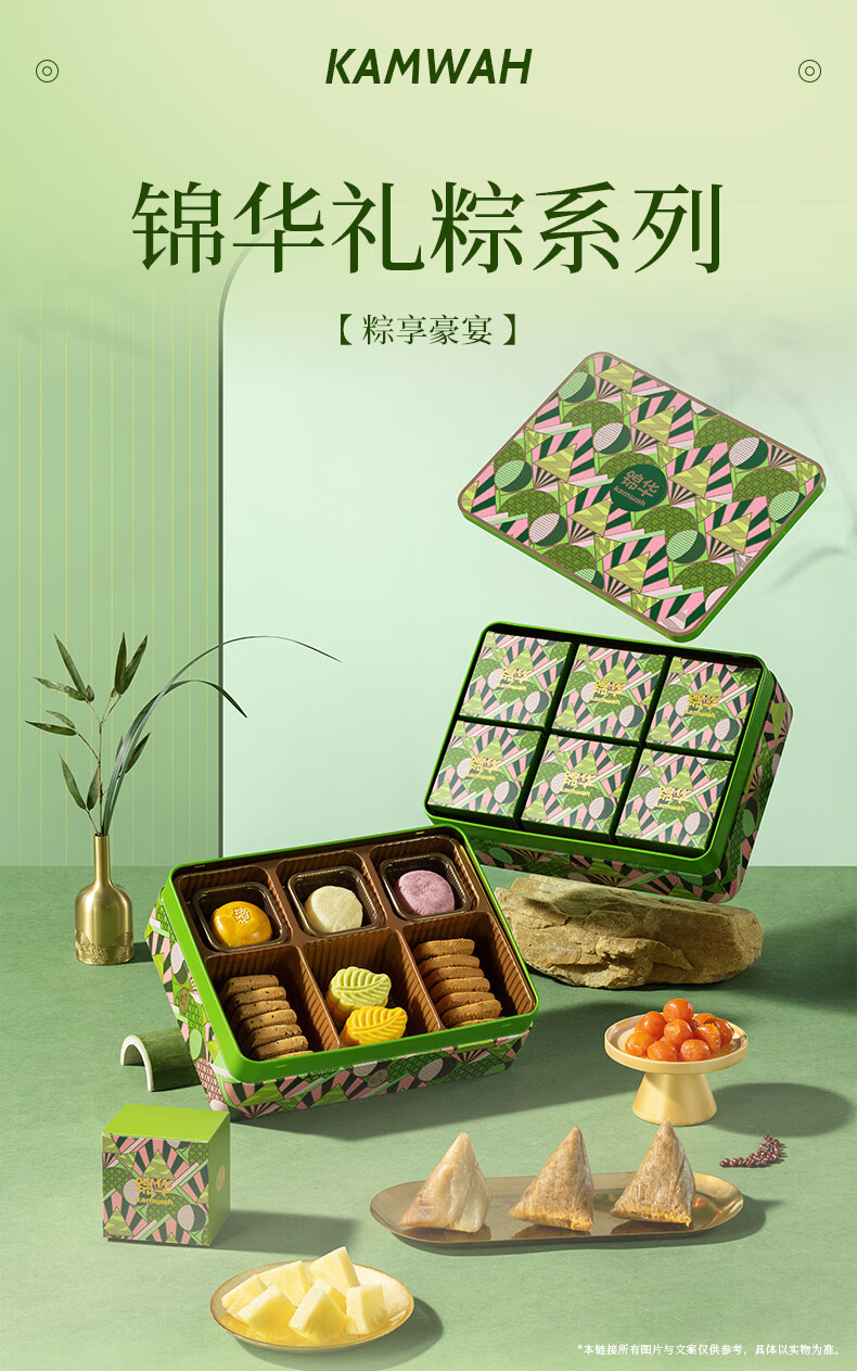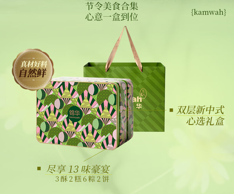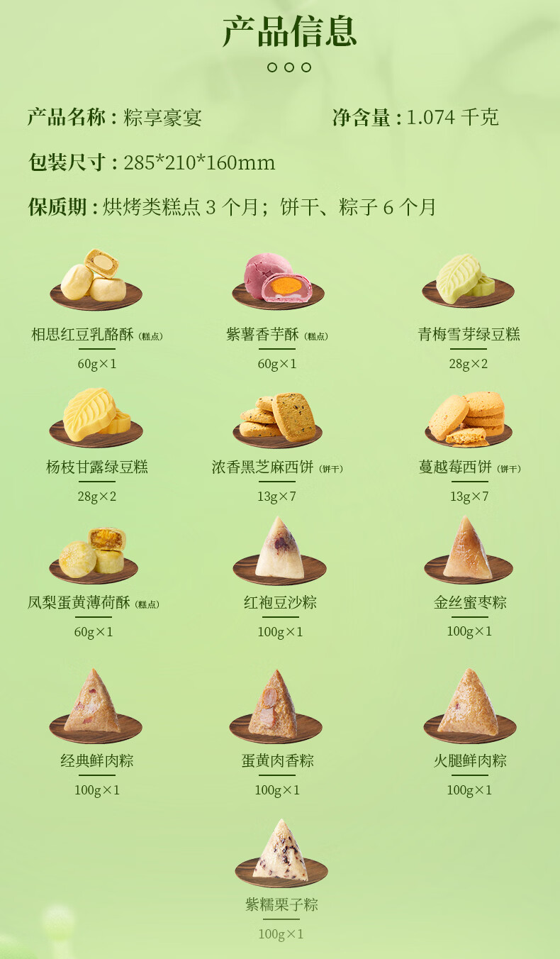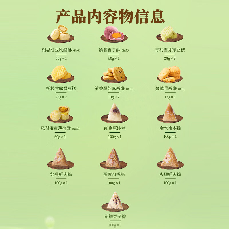 配置:【锦华】凤梨蛋黄薄荷酥(糕点)60g*1 【锦华】相思红豆乳酪酥(糕点)60g*1 【锦华】紫薯香芋酥(糕点)60g*1 【锦华】青梅雪芽绿豆糕 28g*2 【锦华】杨枝甘露绿豆糕 28g*2 【锦华】浓香黑芝麻西饼(饼干)13g*7 【锦华】蔓越莓西饼(饼干)13g*7 【锦华】经典鲜肉粽100g*1 【锦华】蛋黄肉香粽 100g*1 【锦华】火腿鲜肉粽 100g*1 【锦华】红袍豆沙粽 100g*1 【锦华】金丝蜜枣粽 100g*1 【锦华】紫糯栗子粽 100g*1