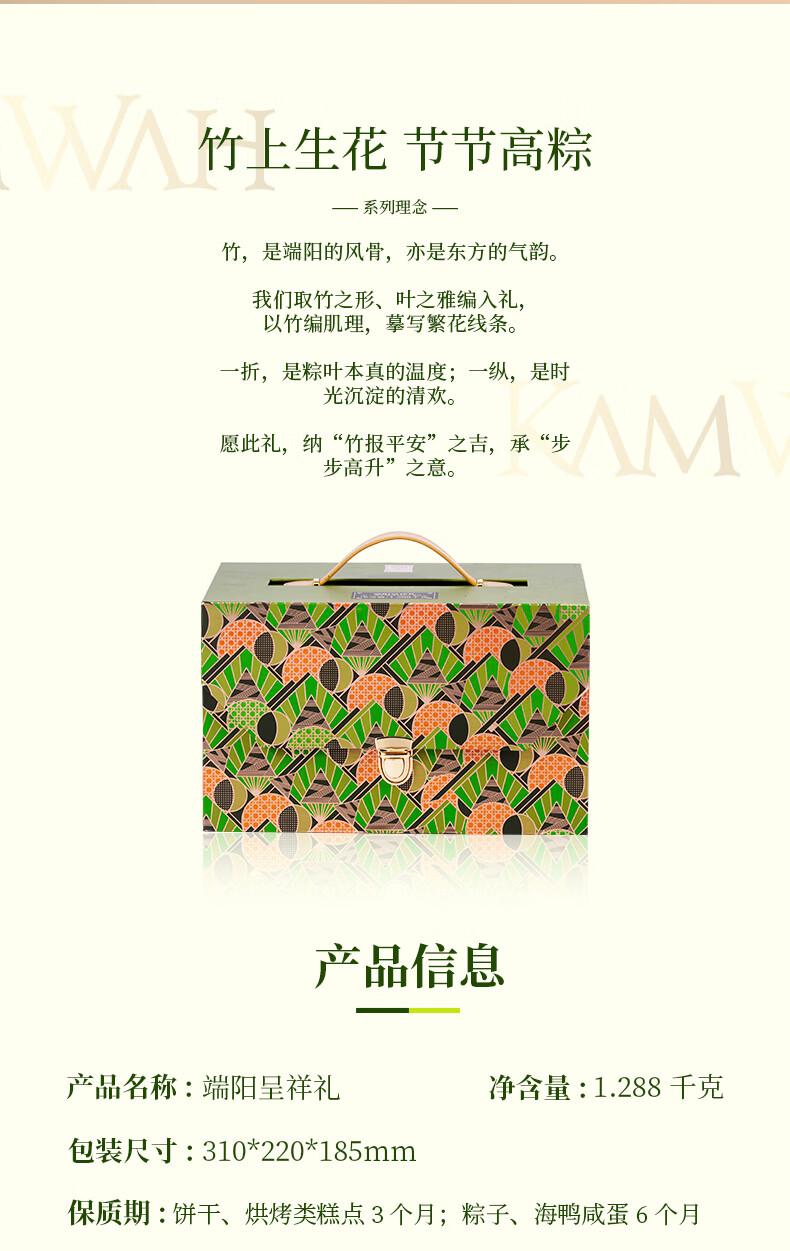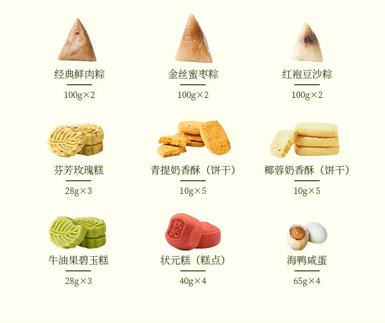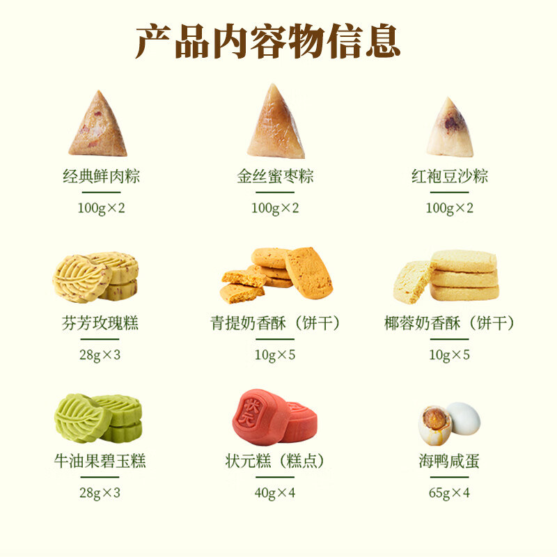 配置:【锦华】经典鲜肉粽 100g*2 【锦华】金丝蜜枣粽 100g*2 【锦华】红袍豆沙粽 100g*2 【锦华】青提奶香酥(饼干)10g*5 【锦华】椰蓉奶香酥(饼干)10g*5 【锦华】芬芳玫瑰糕 28g*3 【锦华】牛油果碧玉糕 28g*3 【锦华】状元糕(糕点)40g*4 【锦华】海鸭咸蛋 65g*4